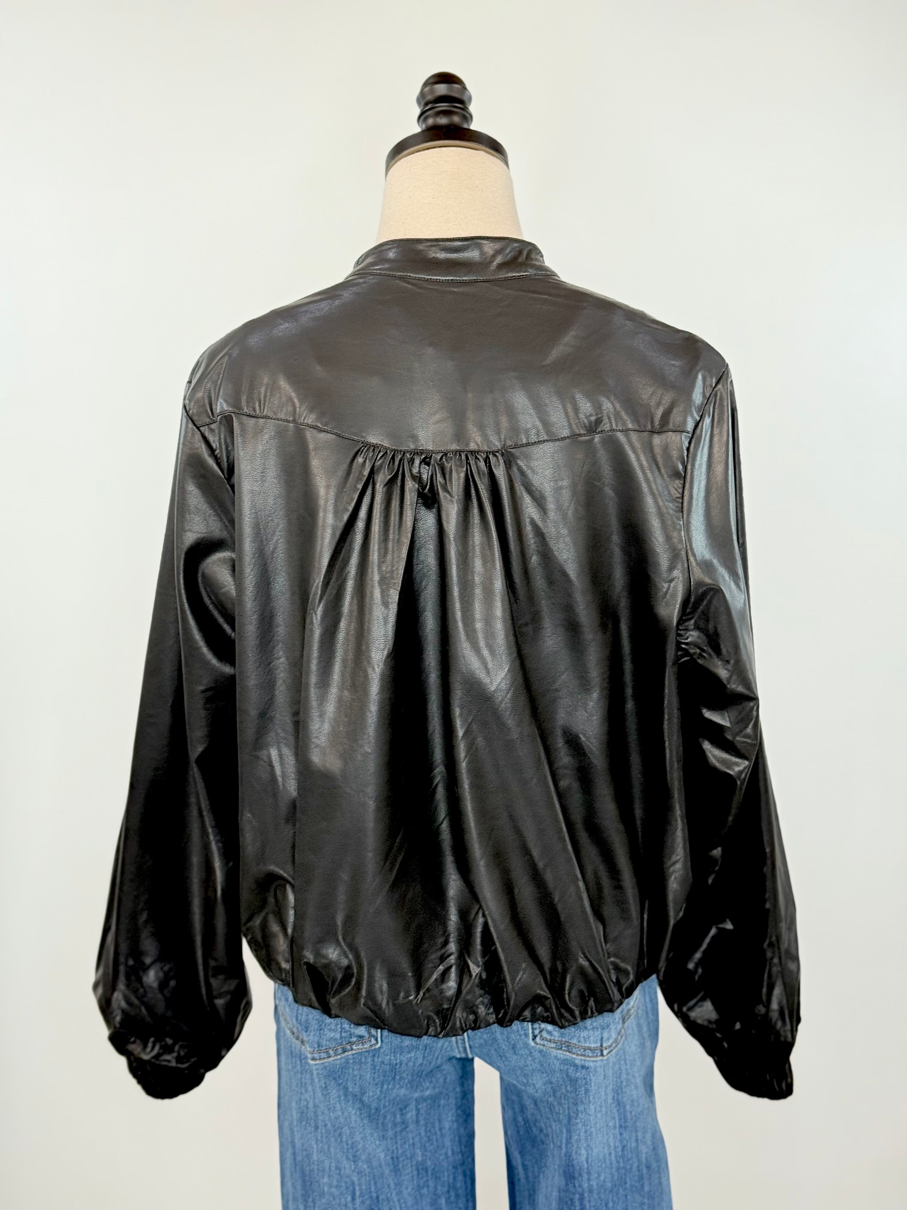 Turn every sidewalk into your personal runway with the Rebel Glow Faux Leather Bomber Jacket in Black. This sleek, jet-black jacket channels effortless cool with its lightweight faux leather sheen, relaxed silhouette, slant pockets and elastic hem that flatters every shape. Designed for the bold and the modern, it’s the perfect layering piece to give any outfit that stylish edge. Pair it with denim for casual confidence, or layer it over a dress for a little twist of attitude. The zip front and subtle snap collar and hem give it that perfect blend of feminine and fierce. Ideal for crisp fall days or cool nights out.