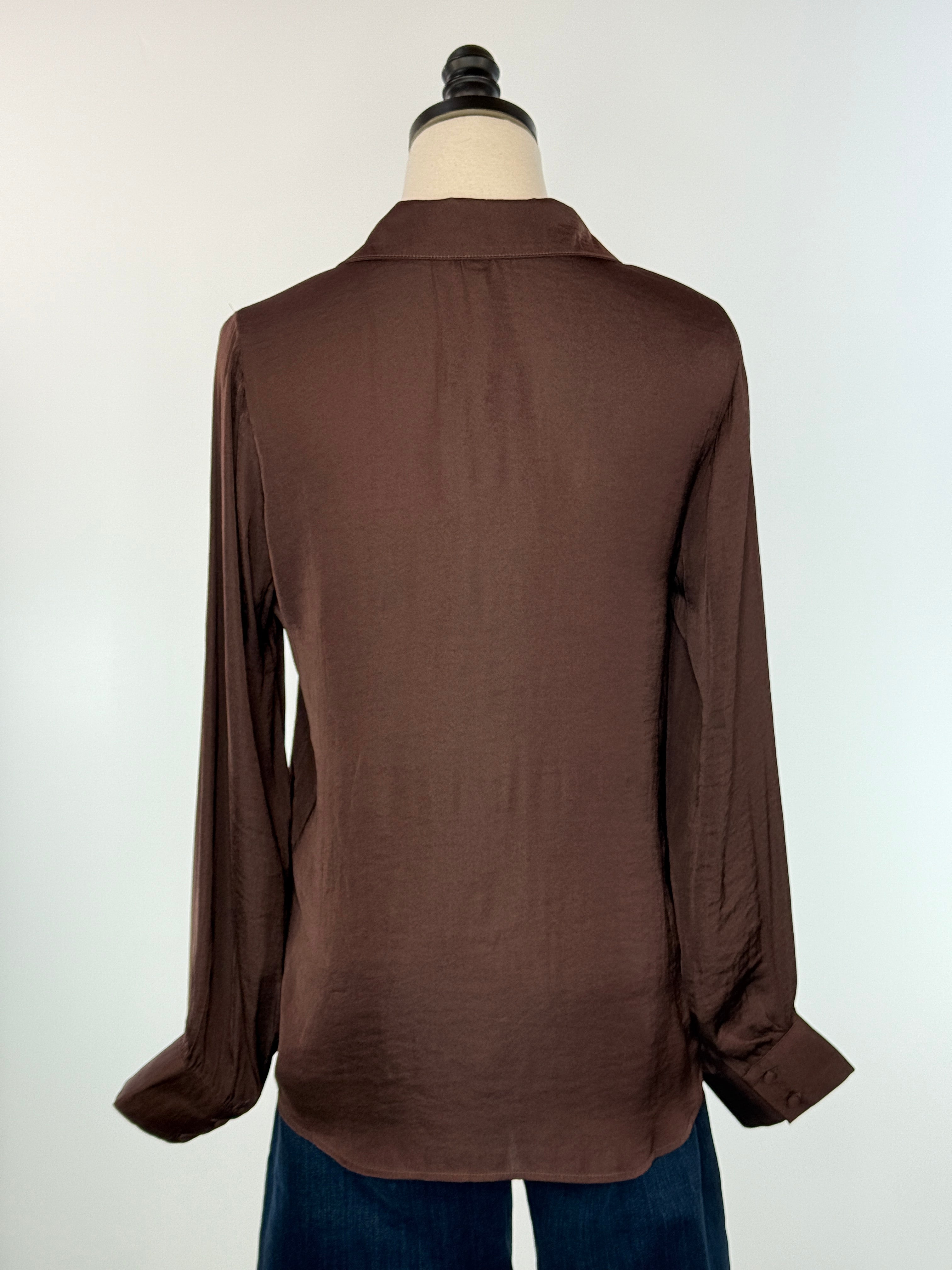 The Sinclair Blouse in Chocolate features long sleeves finished with two fabric-covered buttons at each cuff, a v-neckline flowing into a full button-down front, and a folded collar. Its smooth, silky texture makes it a versatile piece that pairs beautifully with both jeans and dressy bottoms.