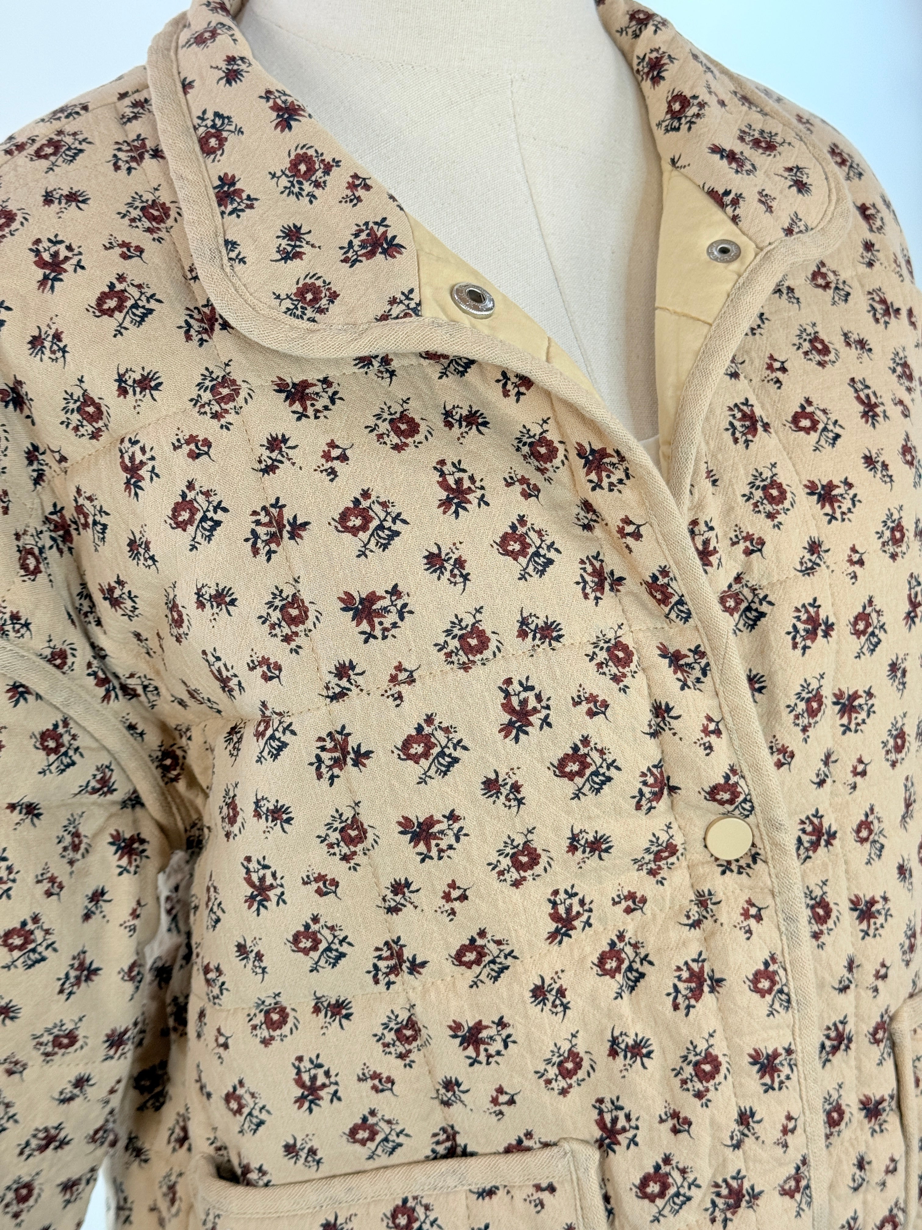 Wrap yourself in cozy nostalgia with our Sweet Briar Quilted Jacket, a charming blend of vintage-inspired style and modern ease. This soft tan jacket features a dainty allover floral print in warm autumn tones, offering a timeless cottagecore feel perfect for layering through the seasons. Crafted from a lightweight, quilted cotton blend, it delivers just the right amount of warmth without bulk. The rounded collar and oversized front pockets add both function and a touch of laid-back charm.  Pairs effortlessly with denim, corduroy, or your favorite flowy dress.