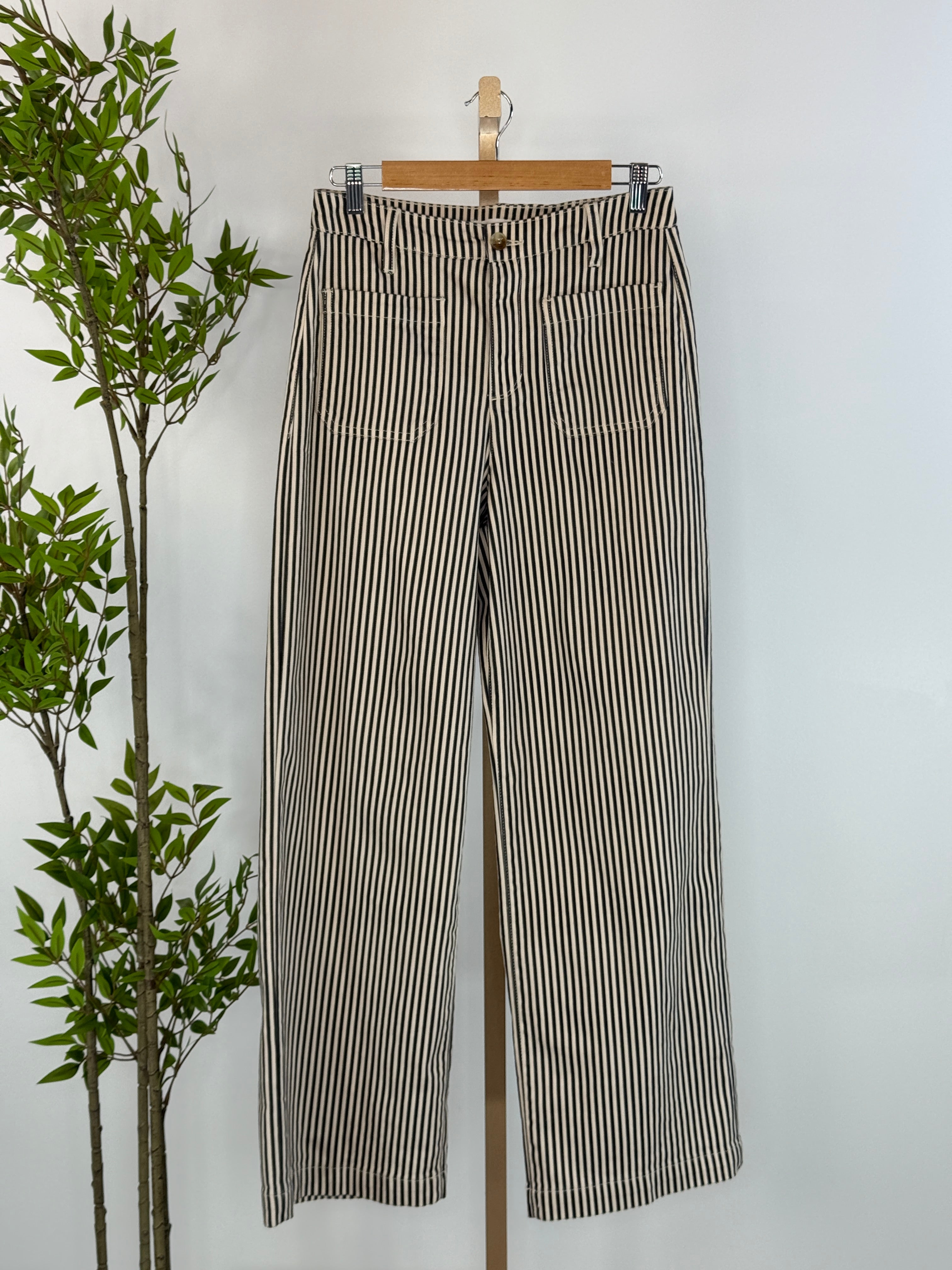 Introducing Another Love, Bristol High-Rise Wide Leg Pant, crafted to bring comfort and versatility to your wardrobe in a fun cream and black stripe. Designed with a wide-leg silhouette, these pants feature practical patch pockets and a flattering high-rise waist, complemented by a button closure. Pair with a tee and a denim jacket for a casual look or dress them up with a black sweater and ankle boots.