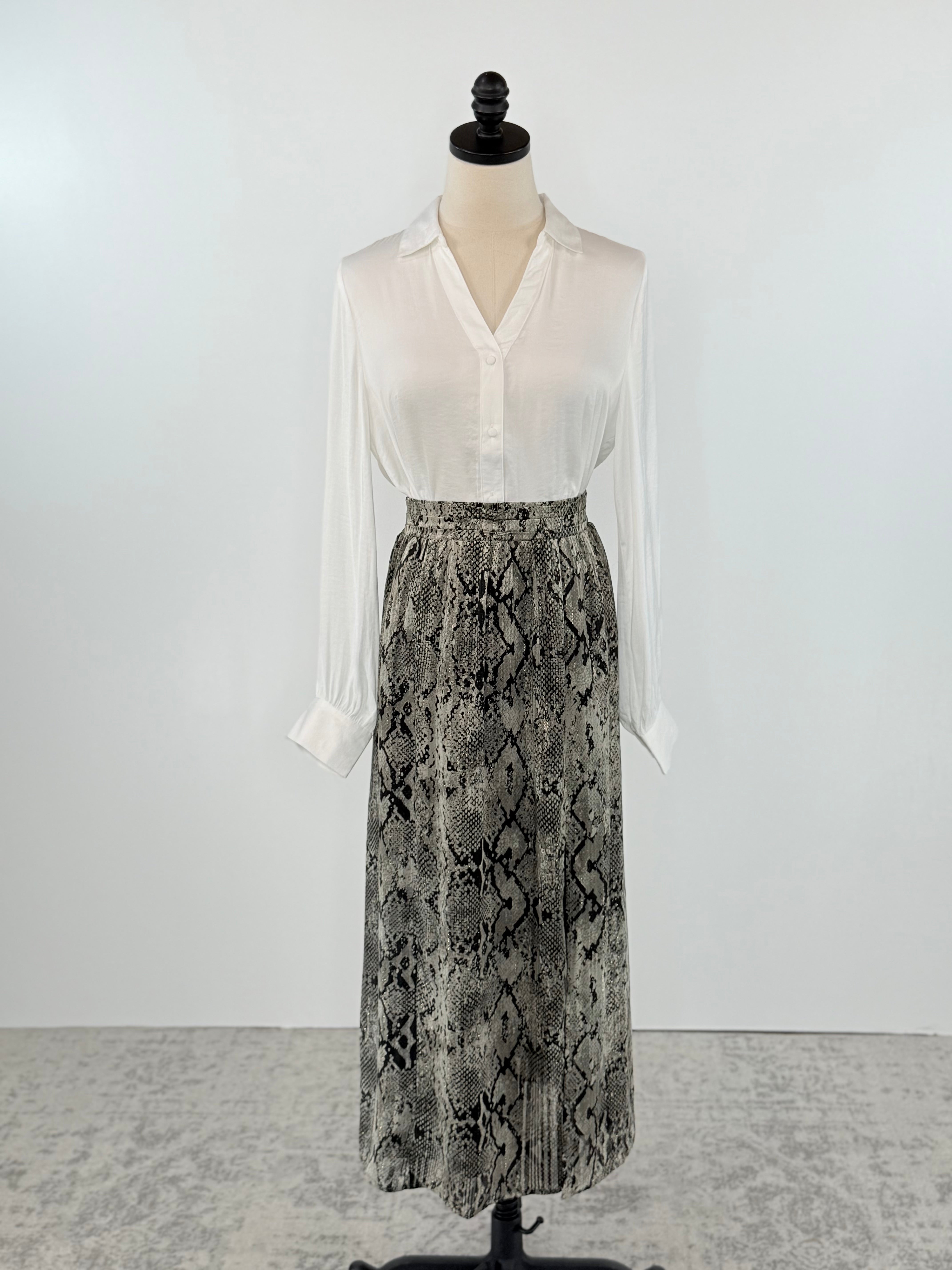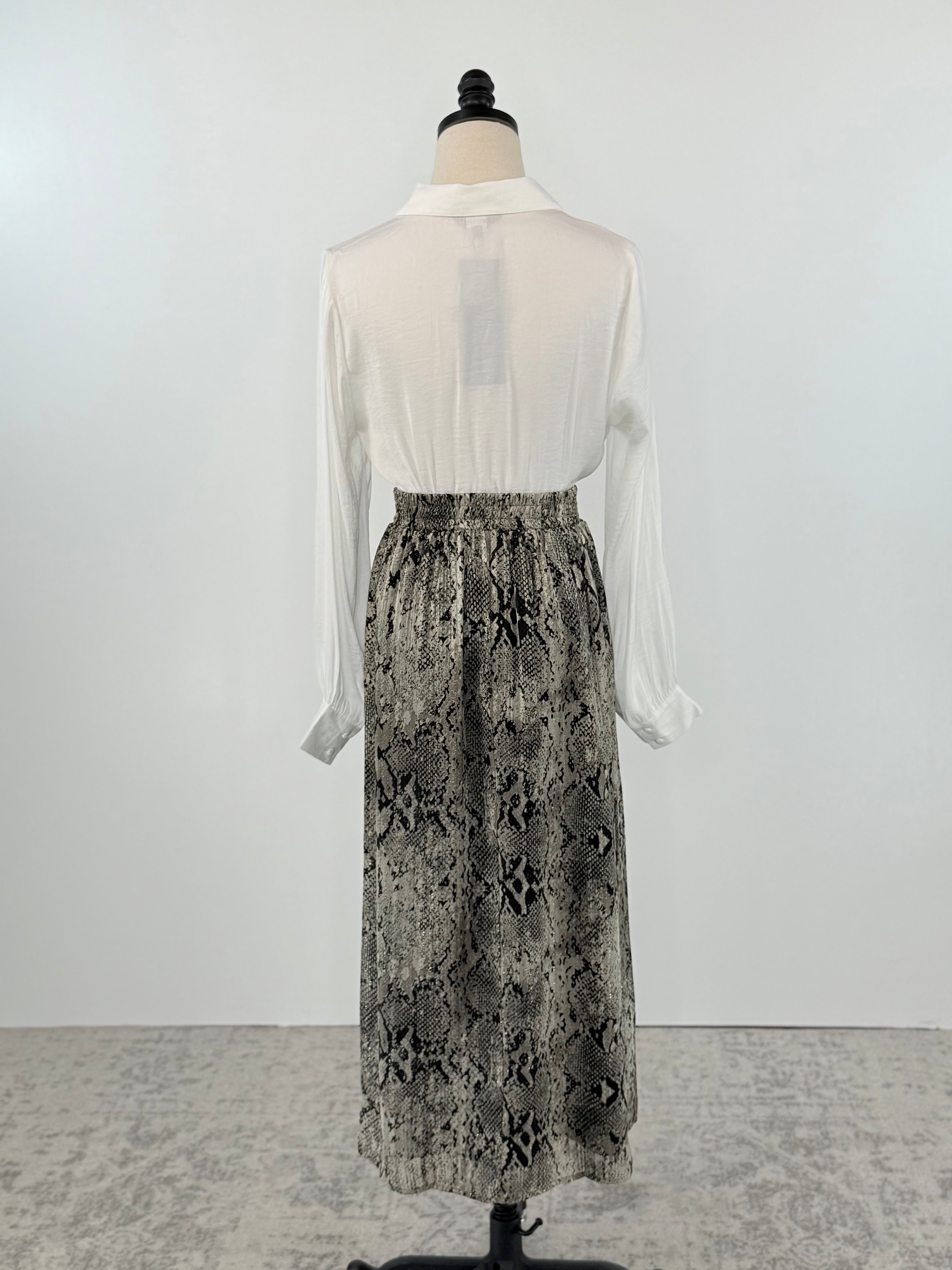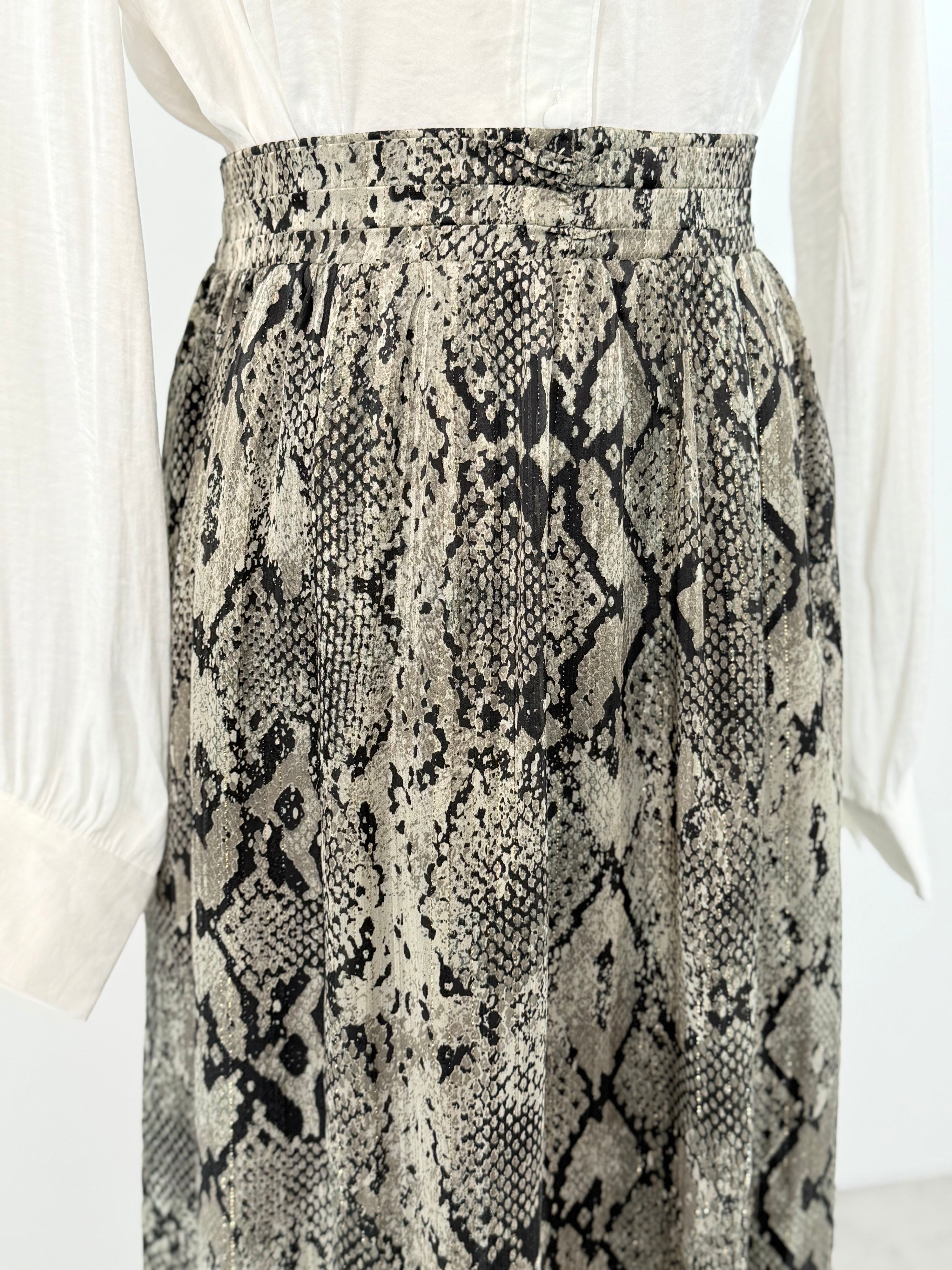 The Gentle Fawn Adeline Skirt in Jade Snake features a lurex striped chiffon fabric with an elegant snake print in a stunning jade shade. It includes a pleated detail at the front waist, a side slit, and an elasticated back waistband for comfort. This midi-length skirt is fully lined and sits high on the waist. It pairs wonderfully with black or white tops and can be styled with boots or heels for a polished look.