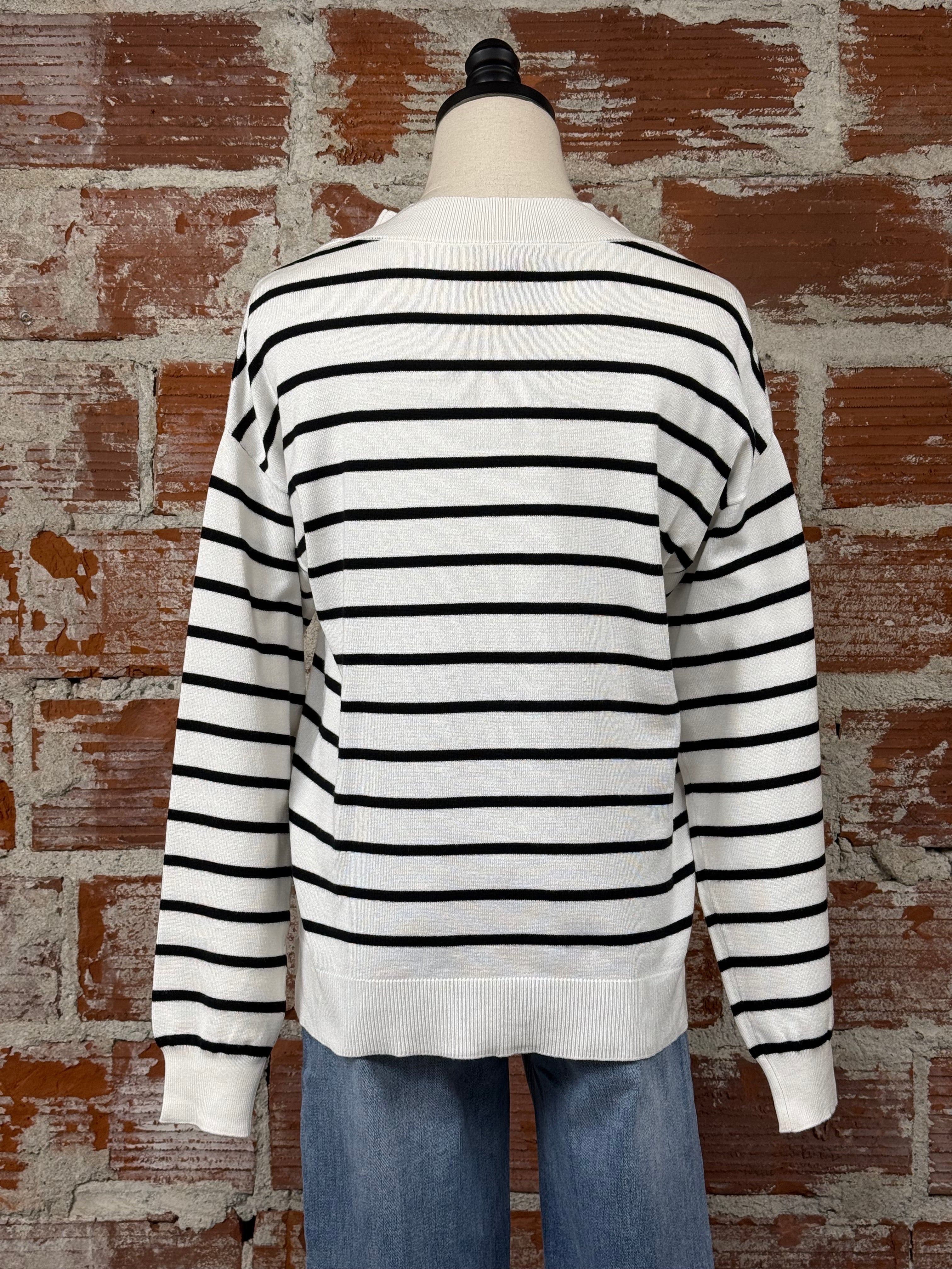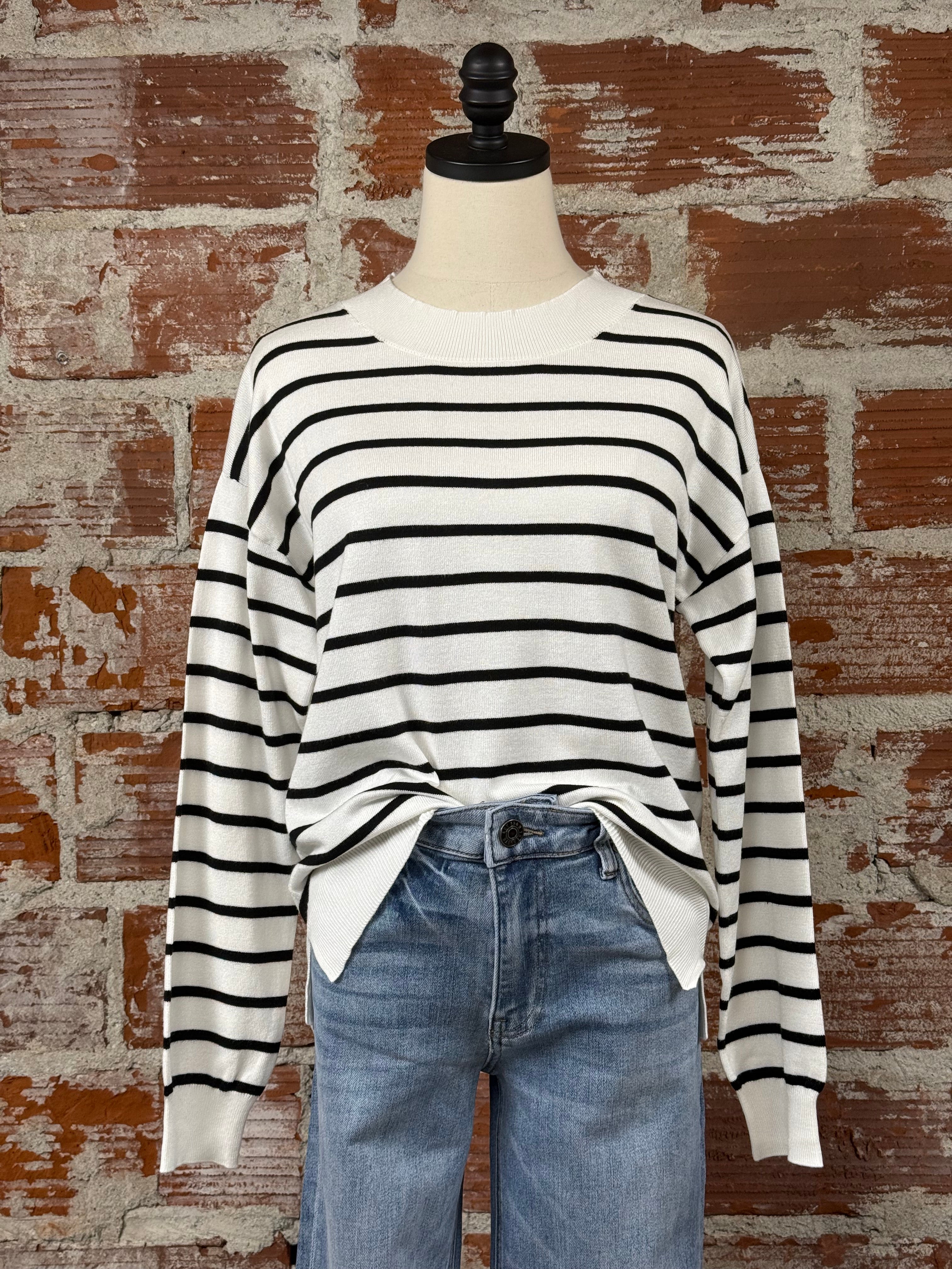 Stay cozy and chic in this Black and White Striped Dara Sweater. With its long sleeves, drop shoulders, banded crew neck, cuffs, and hem with side slits, this lightweight sweater offers a relaxed fit and classic length. Perfect for elevating your everyday look with a pair of jeans.