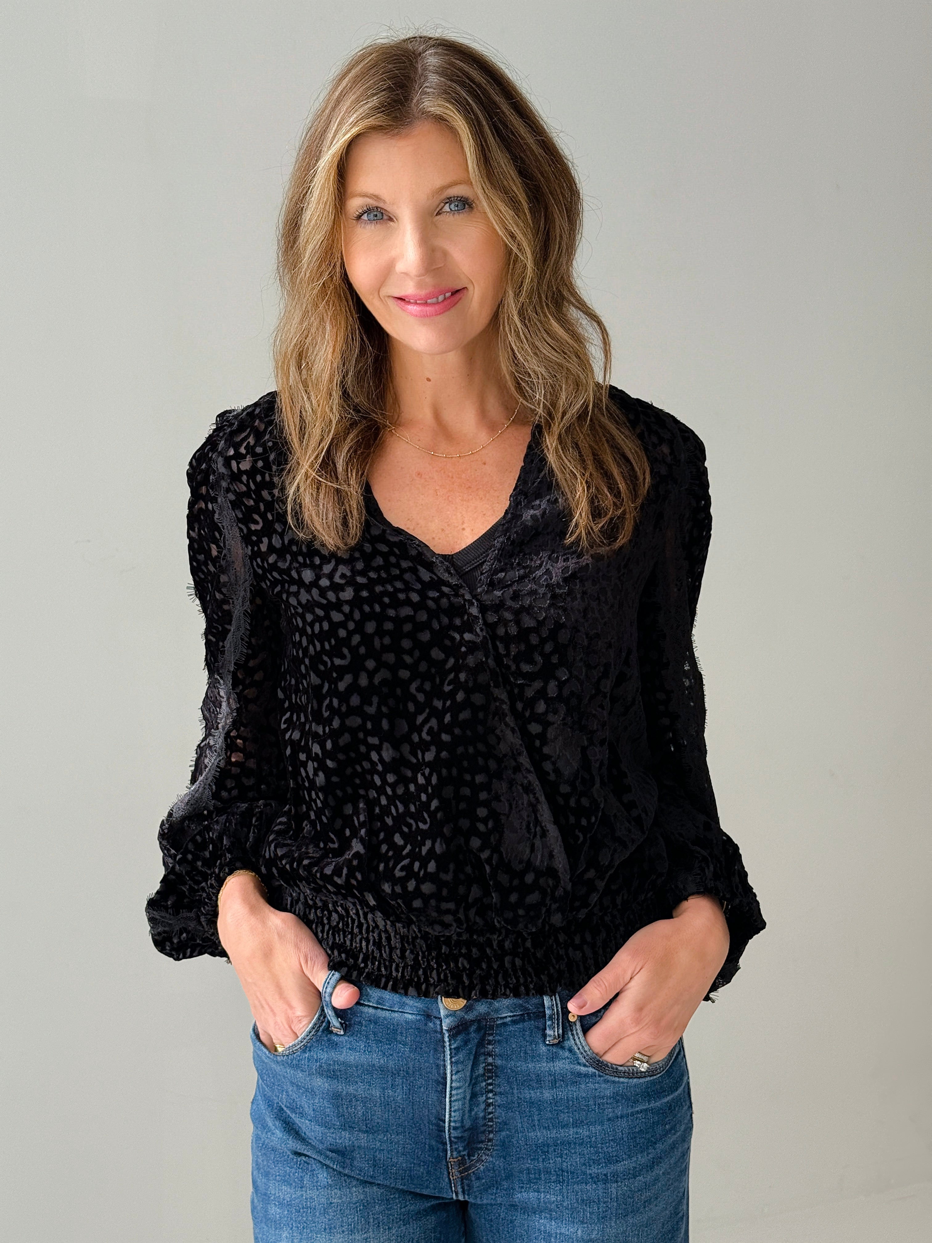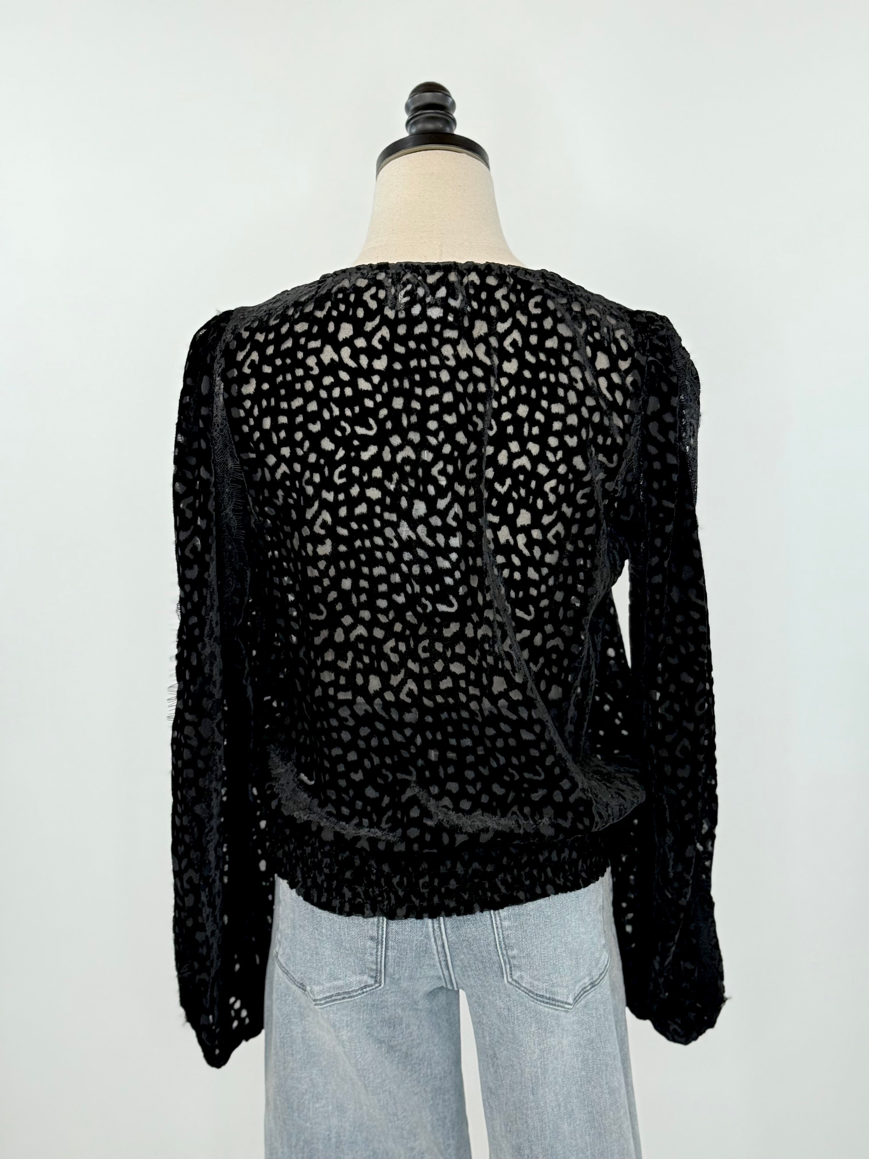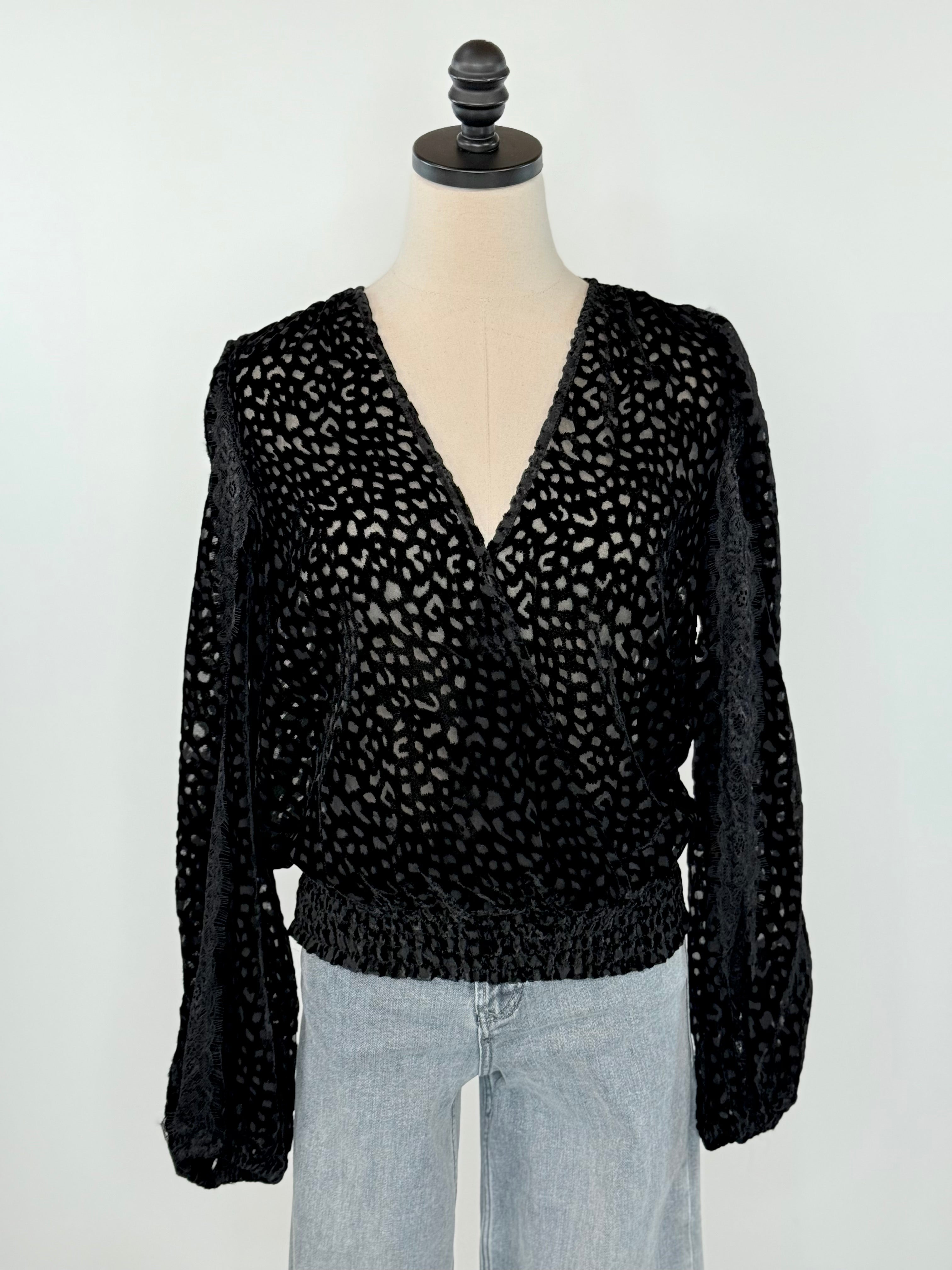 The Dear John Ambre Top in Black Leopard features long sleeves with elastic cuffs and delicate lace running down the sleeves. It offers a flattering v-neck and a surplice front design, along with stylish ruching at the hem for a relaxed, comfortable fit at a standard length. Crafted from soft velour fabric with a leopard print, this sheer top works beautifully layered over a black cami. Dress it up with elegant bottoms or keep it casual with jeans for a chic outfit.