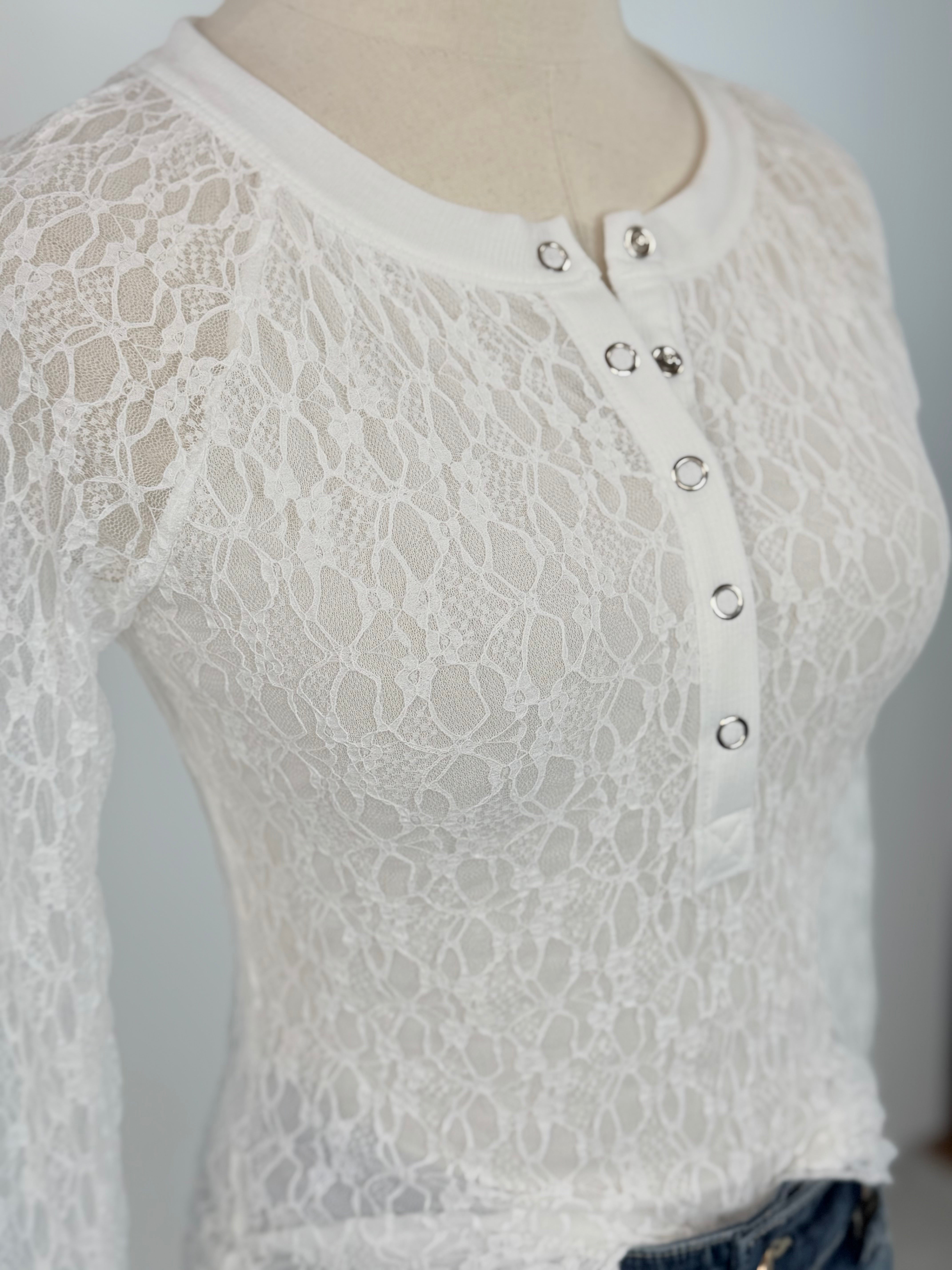 The Promise Lace Top in Ivory features long sleeves finished with contrasting ribbed cuffs that have slit details. It includes a 1/4 snap closure at the front and a round neckline. This fitted, lined lace top looks lovely worn alone or as a stylish layer beneath a jacket or cardigan, providing versatile options for your wardrobe.