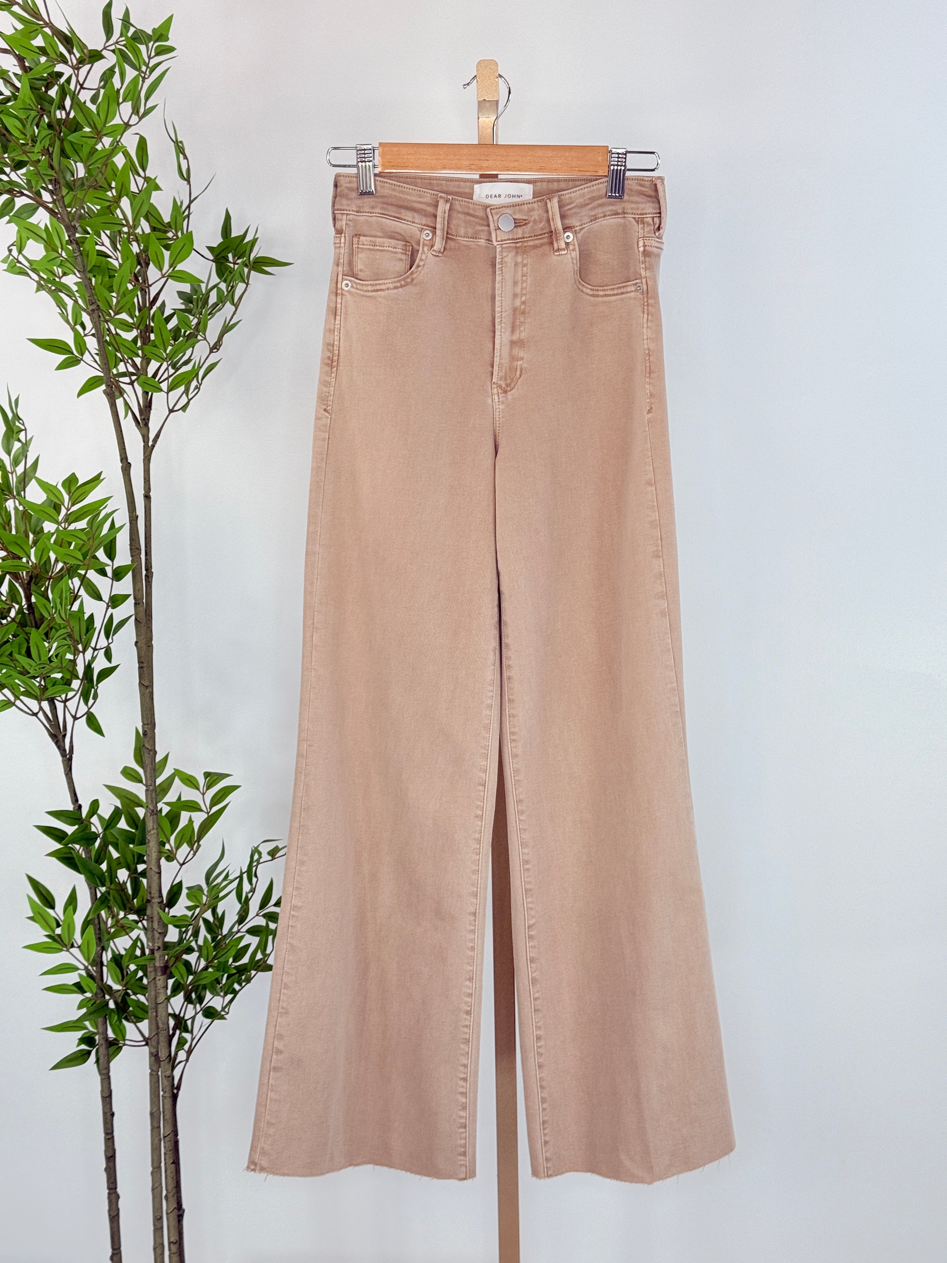 These Dear John Fiona Jeans in Warm Taupe are high rise wide leg jeans with a zip fly and button closure. It's cozy fit that sits at natural waist, embraces your natural curves and accentuates your hips and thigh. Full inseam on stretch denim featuring cut-off hem details add flair to these soft pants, finished with a center inseam press for a tailored look.