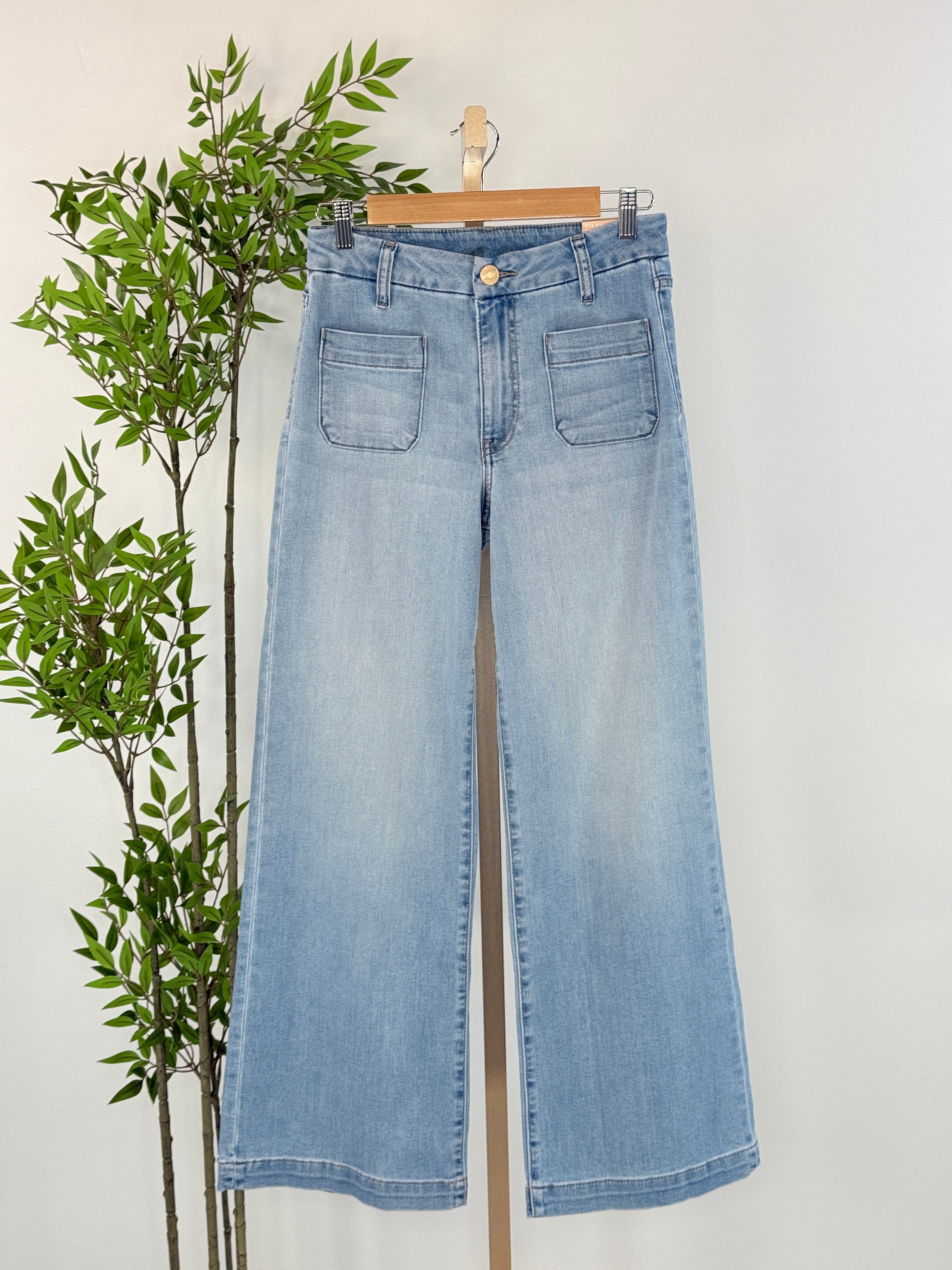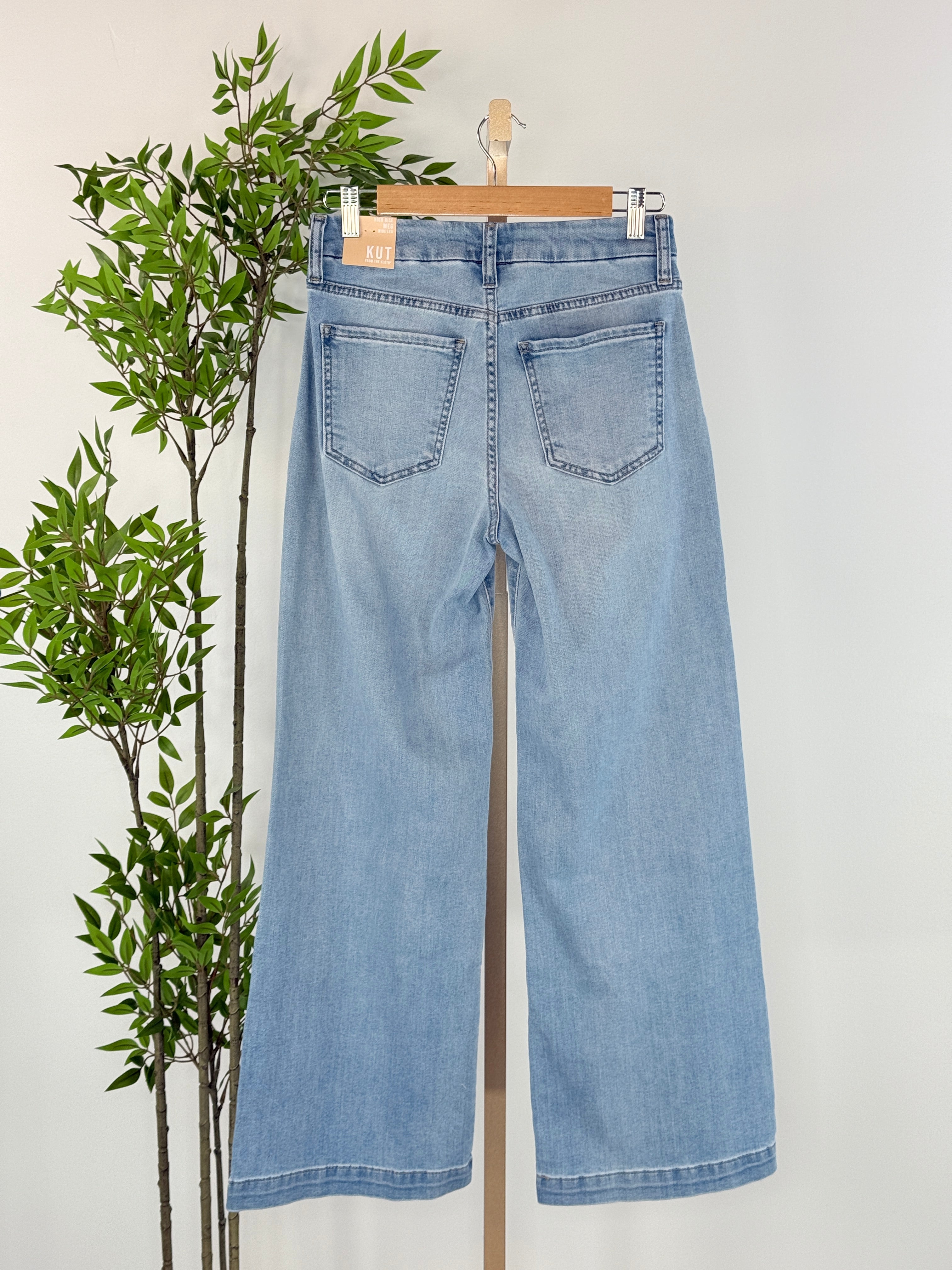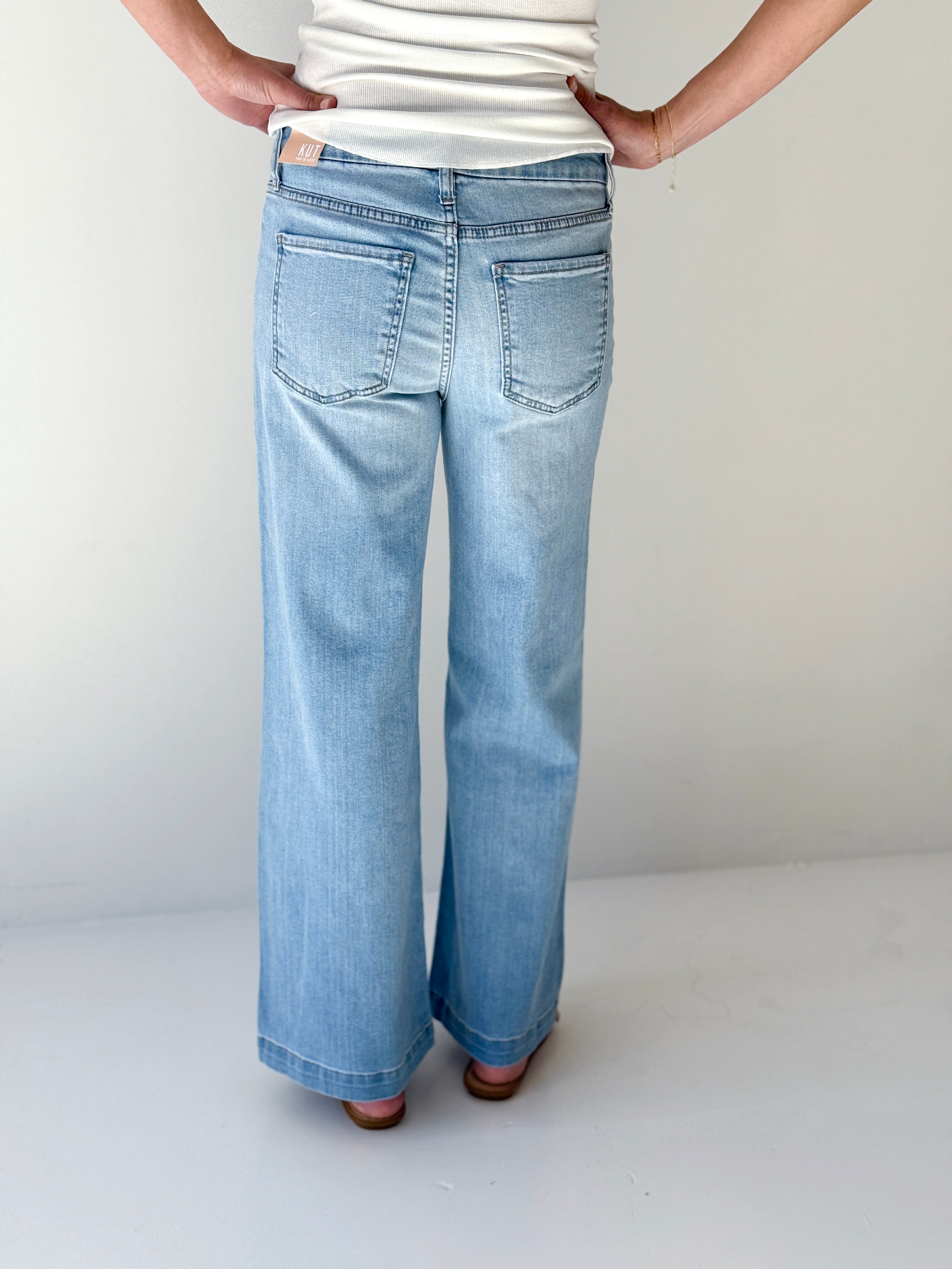 Experience the stylish comfort of Kut from the Kloth's Meg Jeans in Fortitude Wash. These full length, wide leg jeans in a light wash feature cute front patch pockets and back patch pockets. With a zipper and button fly and belt loops, they're versatile enough to pair with sneakers, chunky heels, or flats for any occasion.