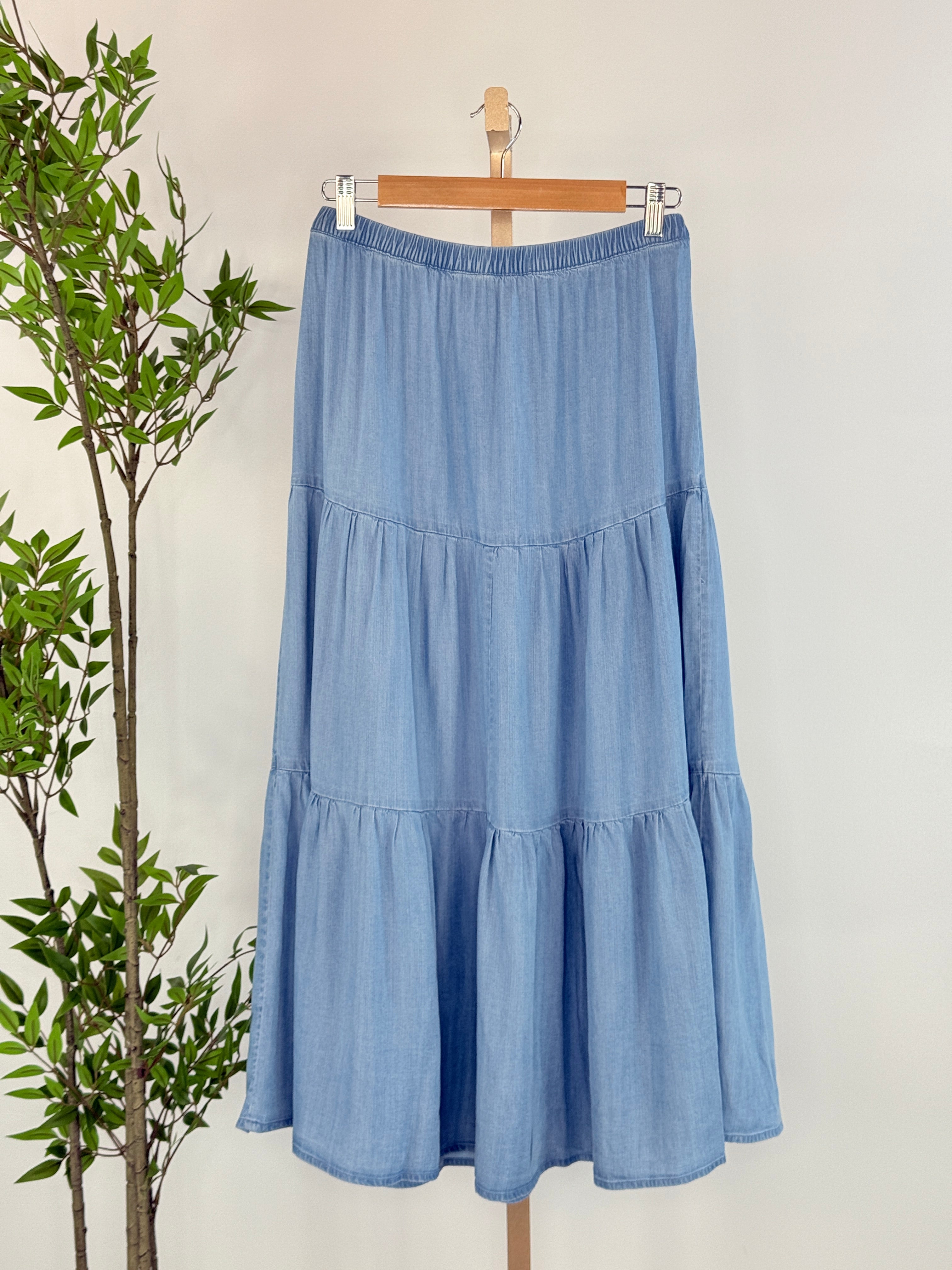 Easy, breezy, and beautifully feminine, the Blue Skies Tiered Midi Skirt in Light Wash is made for effortless everyday wear. Crafted in a soft, lightweight chambray-blue fabric, this skirt features a comfortable elastic waistband and flowing tiered silhouette that moves gracefully with every step. Perfect for warm-weather days and transitional seasons alike, this midi skirt pairs effortlessly with tanks, tees, and cozy knits. Dress it up with sandals and statement jewelry or keep it casual with sneakers and a tee.