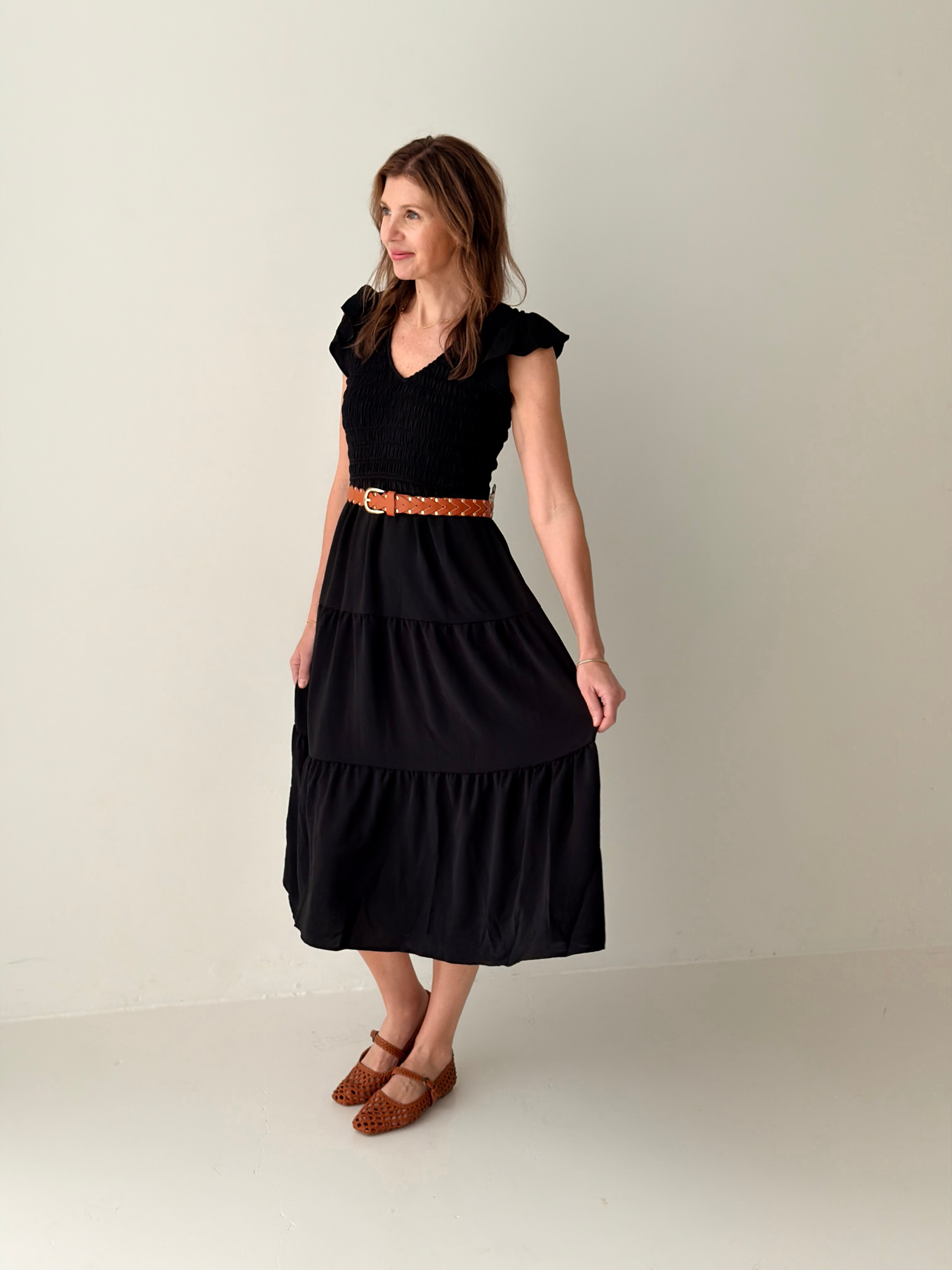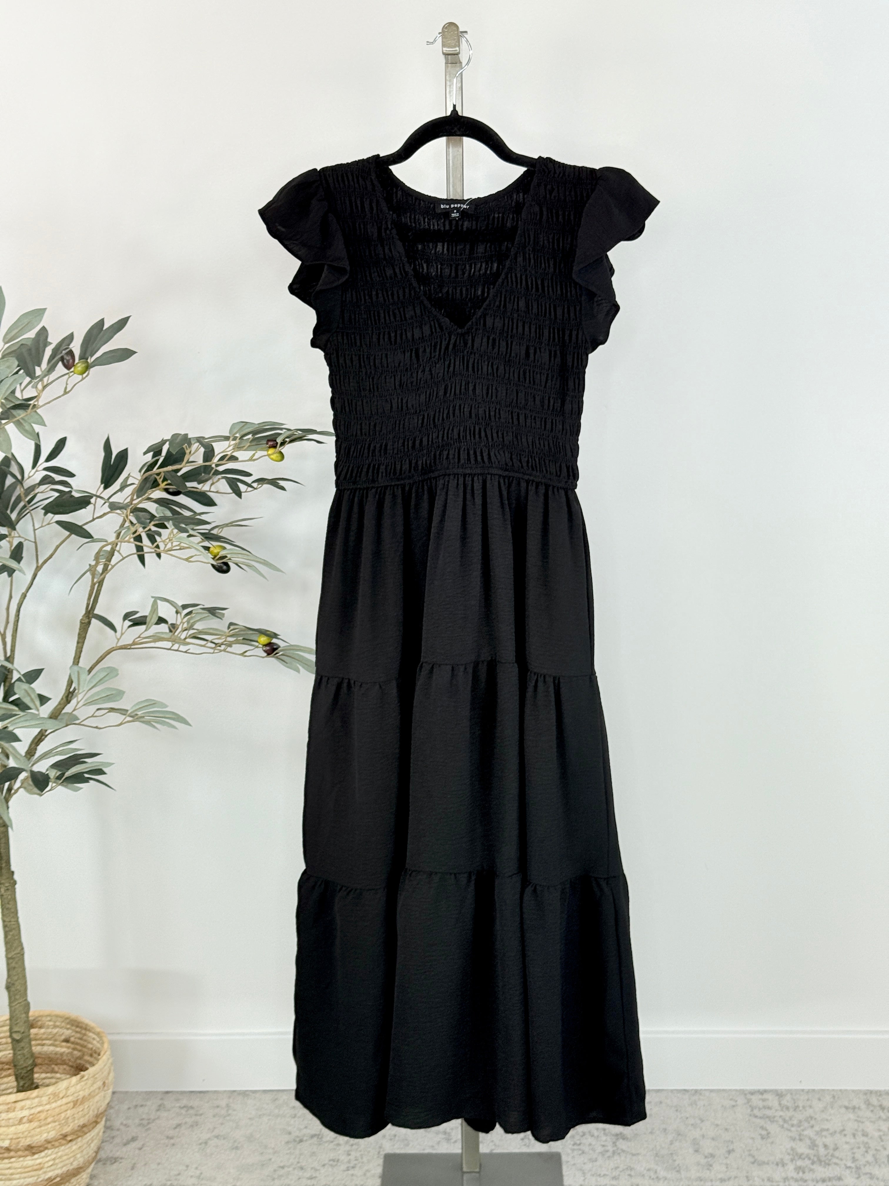 Effortlessly elegant with a touch of romance, the Ellis Smocked Maxi Dress in Black is your go-to piece for everything from casual days to dressed-up evenings. Designed in a classic black hue, this flowing, lined maxi dress features a beautifully smocked bodice that offers a flattering, comfortable fit while gently defining the waist. Soft ruffle cap sleeves add a feminine finish, while the tiered skirt creates graceful movement with every step. The lightweight fabric drapes effortlessly, making it perfect for warm days, special occasions, or transitioning seamlessly into evening with a simple change of accessories.