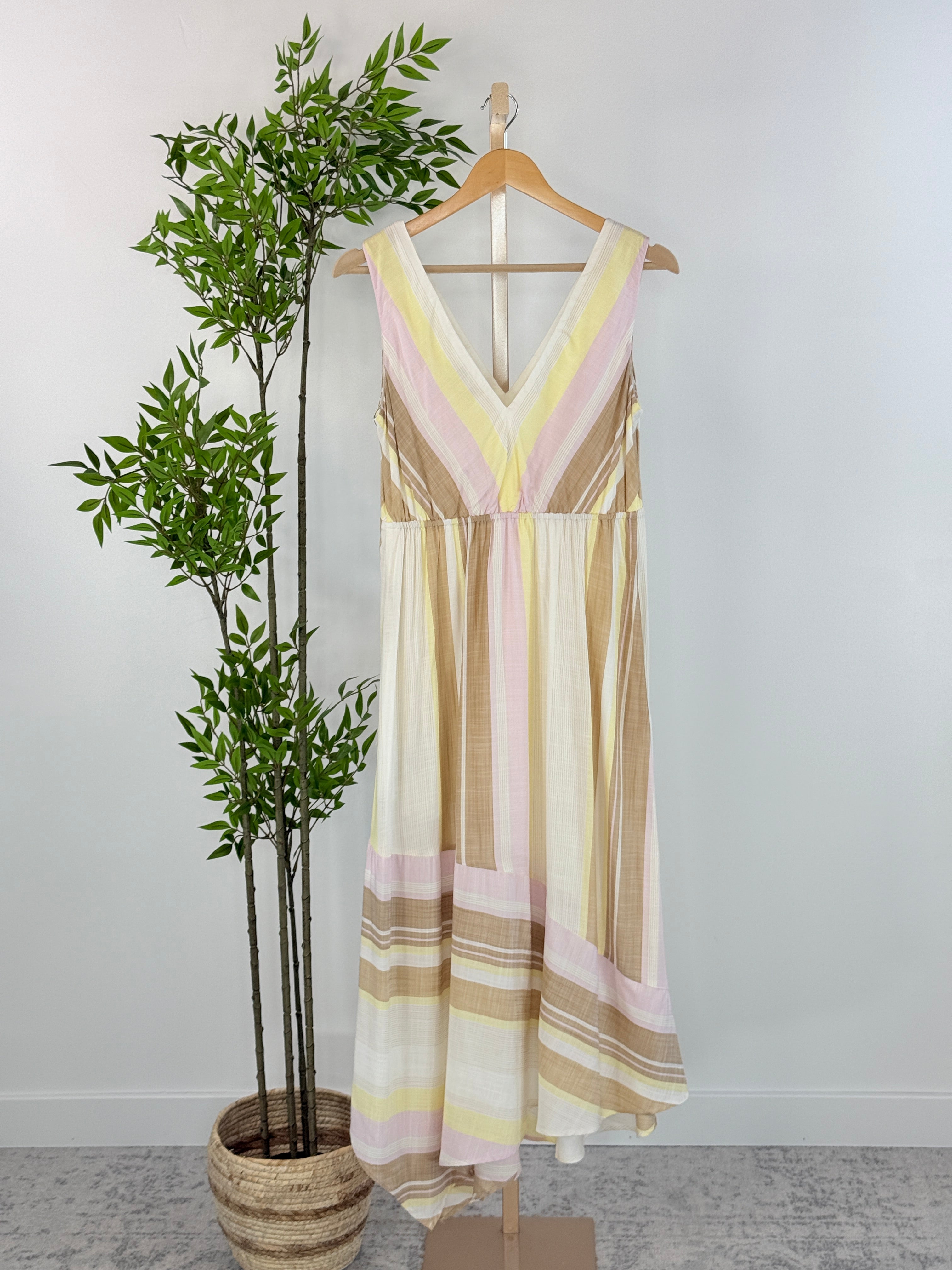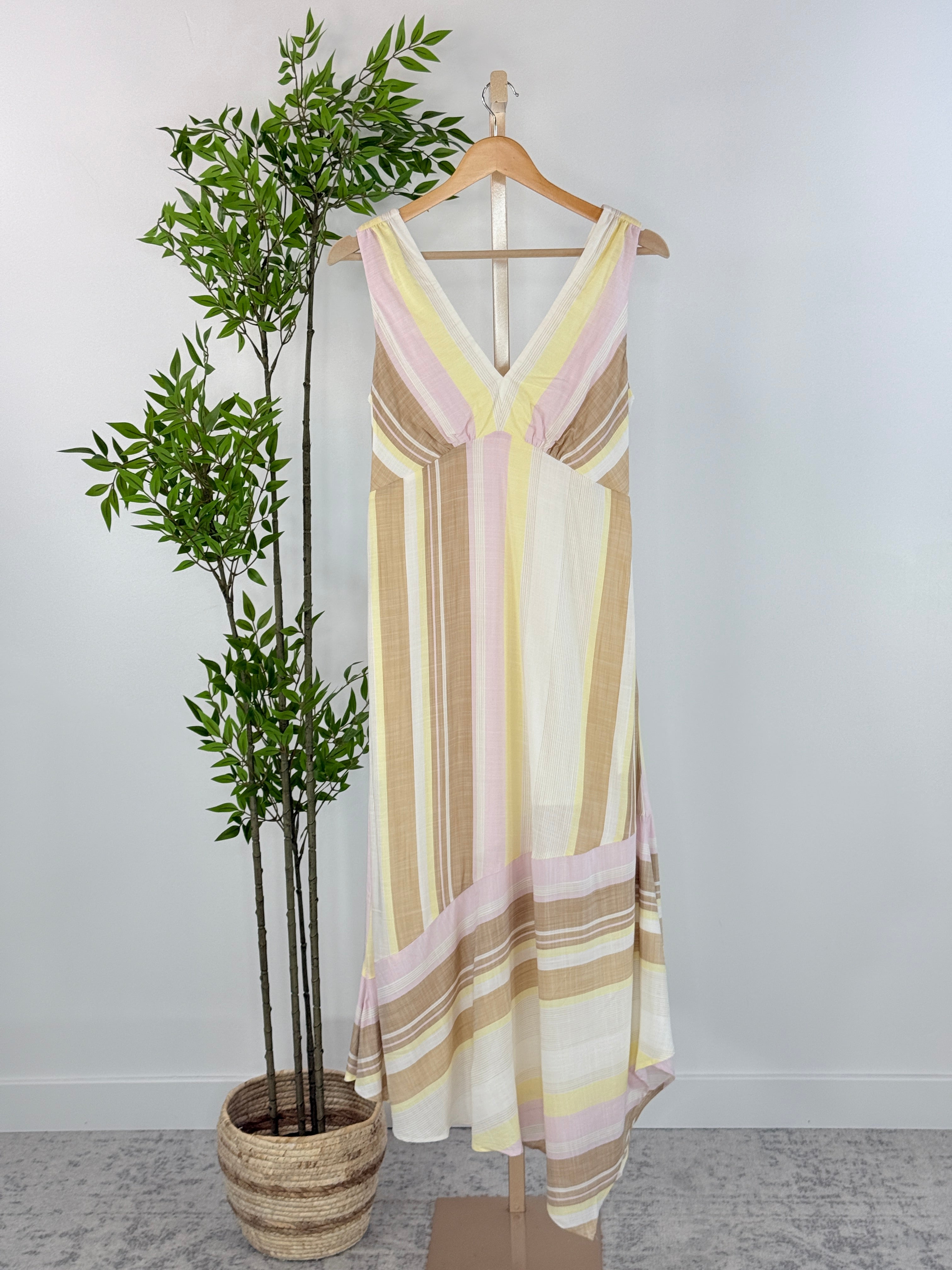 Soft, sun-washed tones and effortless movement come together in the Liverpool Asymetric Handkerchief Dress in Neopolitan. A dreamy statement piece designed for warm days and easy elegance. Complete with hidden side pockets, a 1/2 length lining and featuring a flattering V-neckline in both the front and back. The flowy silhouette drapes effortlessly from a gently gathered waist, creating a lightweight, breathable fit that moves with you. The asymmetrical hemline adds a modern touch, while the thoughtfully placed stripes elongate the body for a flattering finish. It’s the perfect dress for brunch dates, weekend markets, vacation dinners, or simply embracing everyday beauty.