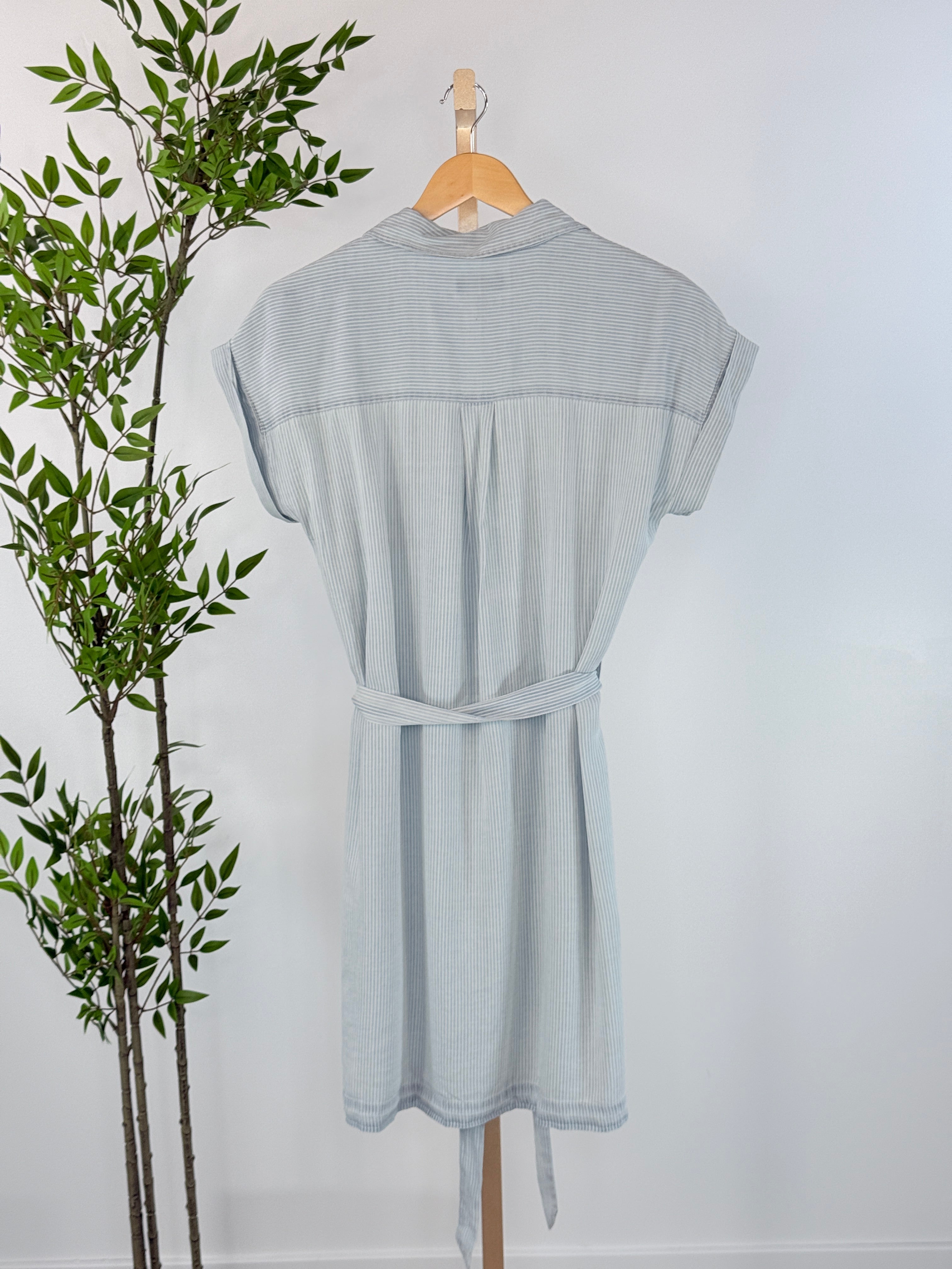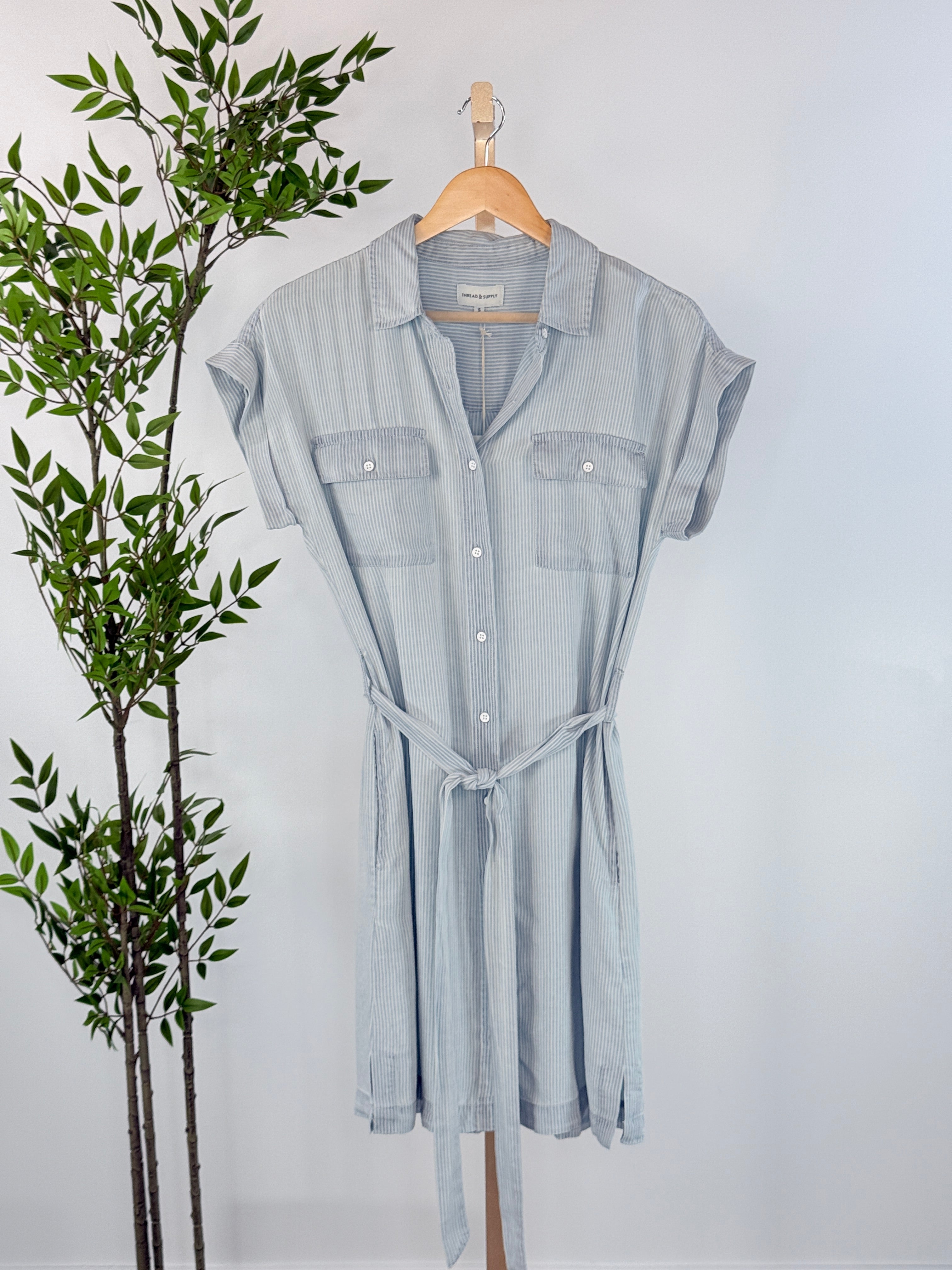 Effortlessly polished with a relaxed, everyday feel, the Thread and Supply Oaklee Dress in Denim Blue Stripe is the kind of piece you’ll reach for again and again. Designed with soft vertical pinstripes in a calming pale denim blue, this lightweight button-front dress blends classic tailoring with easy, feminine comfort. A removable self-tie belt cinches the waist just how you like, while the relaxed cap sleeves and chest pockets keep the look casual and wearable. Perfect for warm days, travel, or casual brunch plans, this striped shirt dress transitions seamlessly from weekday errands to weekend outings.