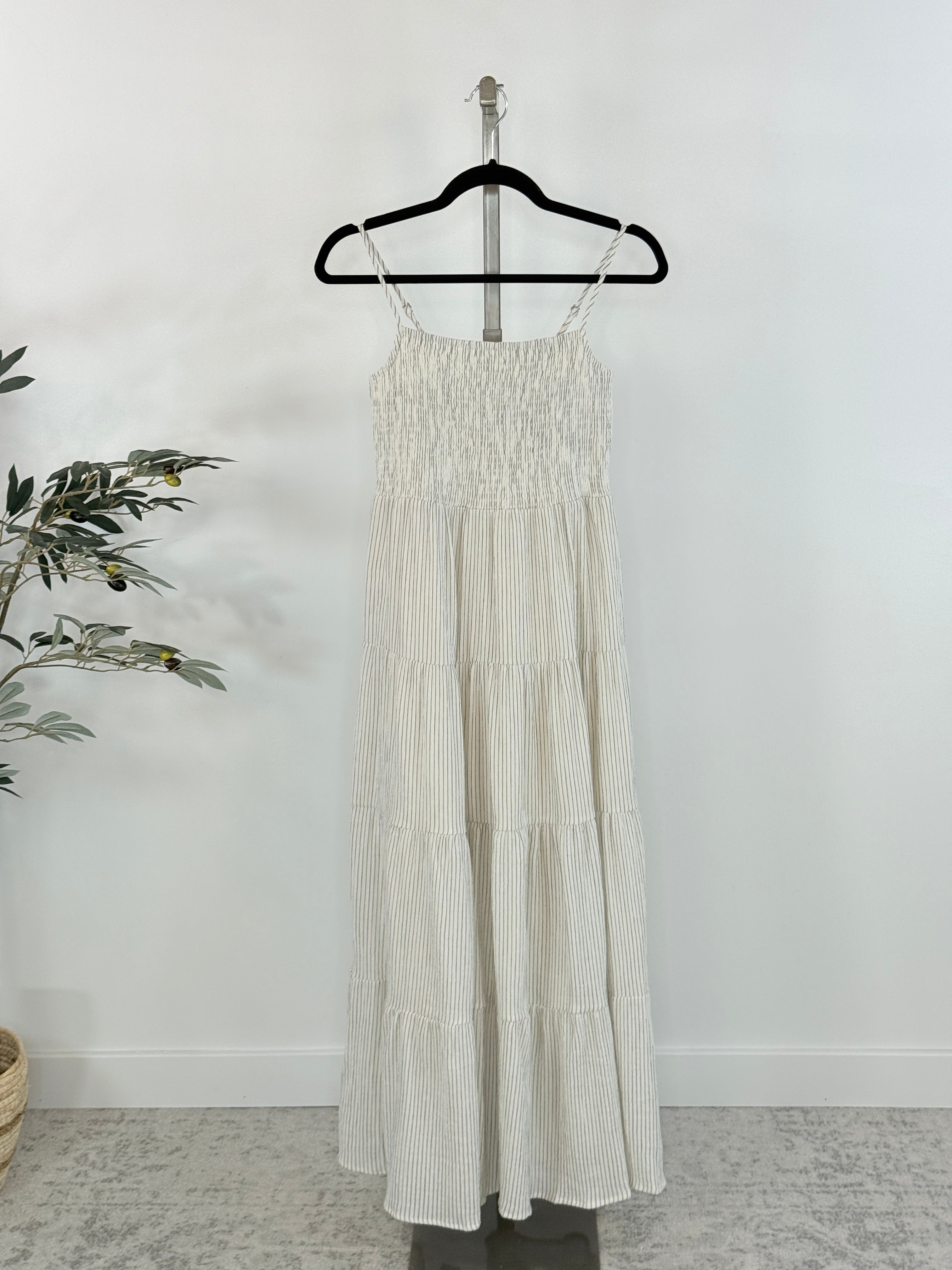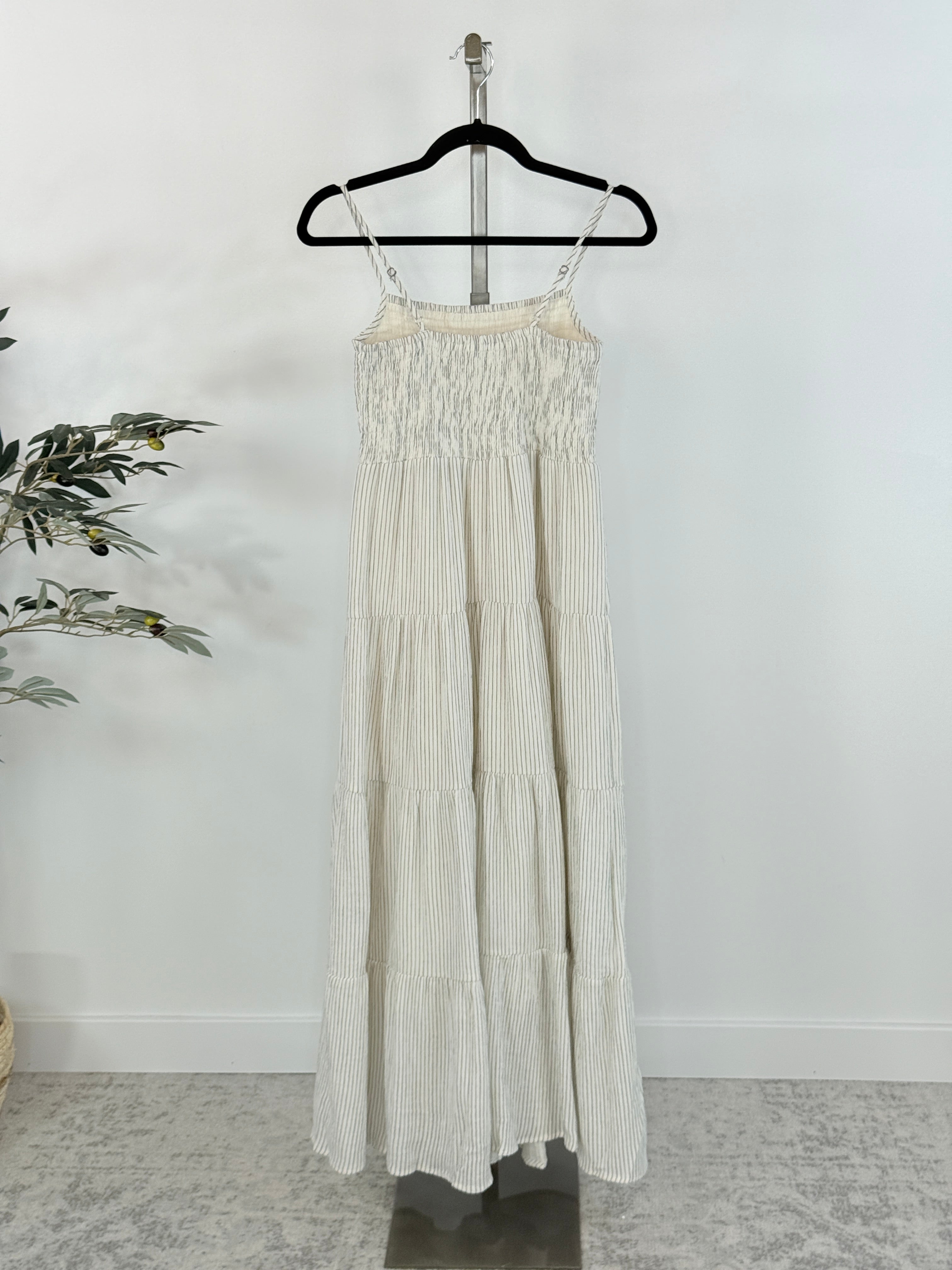Effortlessly elegant, this Z Supply Balos Striped Maxi Dress in Natural combines timeless striped detailing with thoughtful construction. The mid-weight cotton gauze fabric drapes beautifully while the smocked elastic bodice provides comfortable support. A tiered skirt adds movement and dimension, while the square neckline and adjustable straps offer versatile styling options. Fully lined for confidence, this sleeveless design transitions seamlessly from day to evening wear. Length from shoulder is 52in