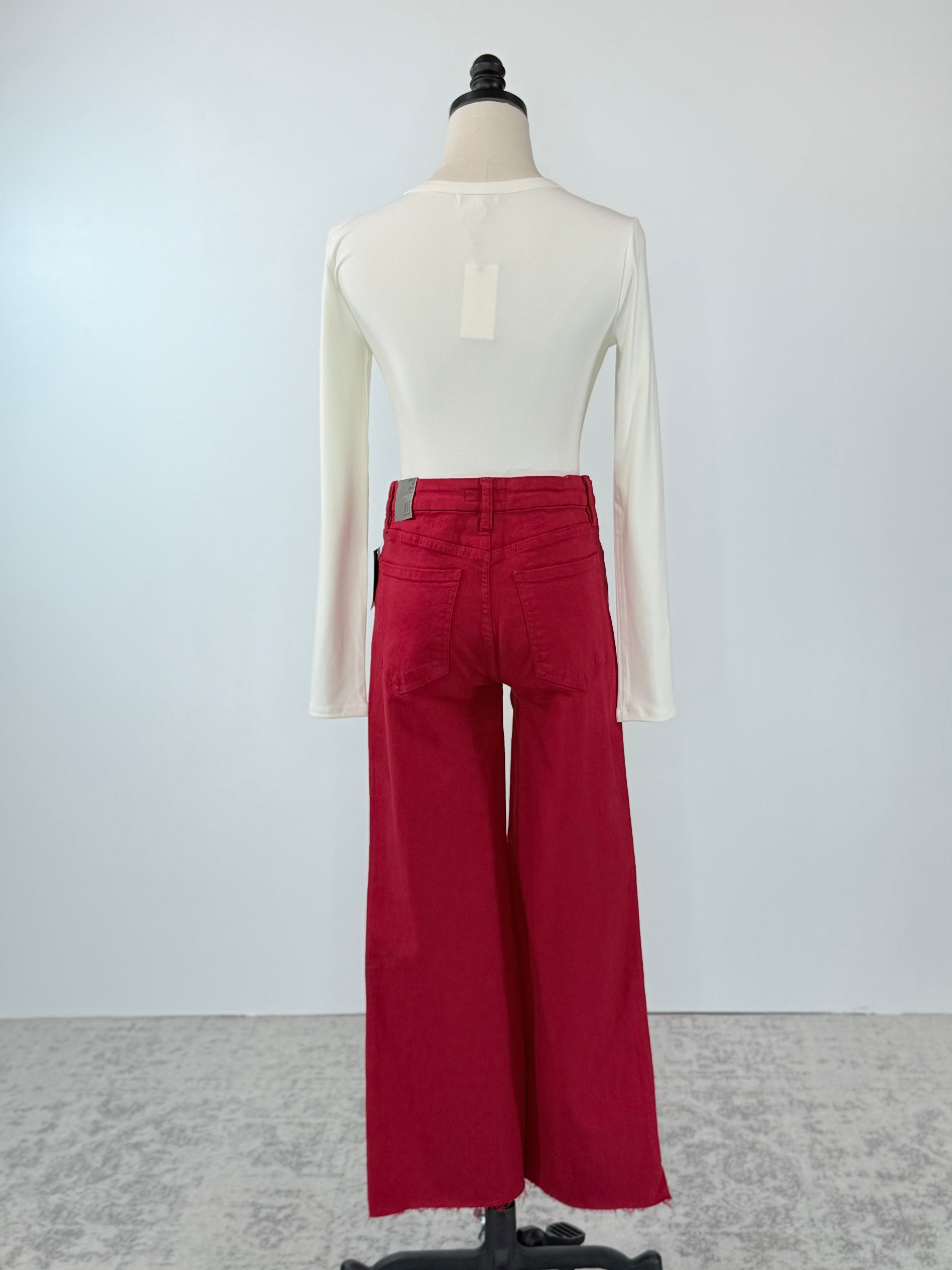 A vibrant hue refreshes the style of these subtly faded, raw-hem wide-leg Kut from the Kloth Meg Pants in Ruby Red. Fitted with Fab Ab front pockets that comfortably shape and smooth. Inseam: 27", Leg Opening: 23", Rise: 10 1/2"