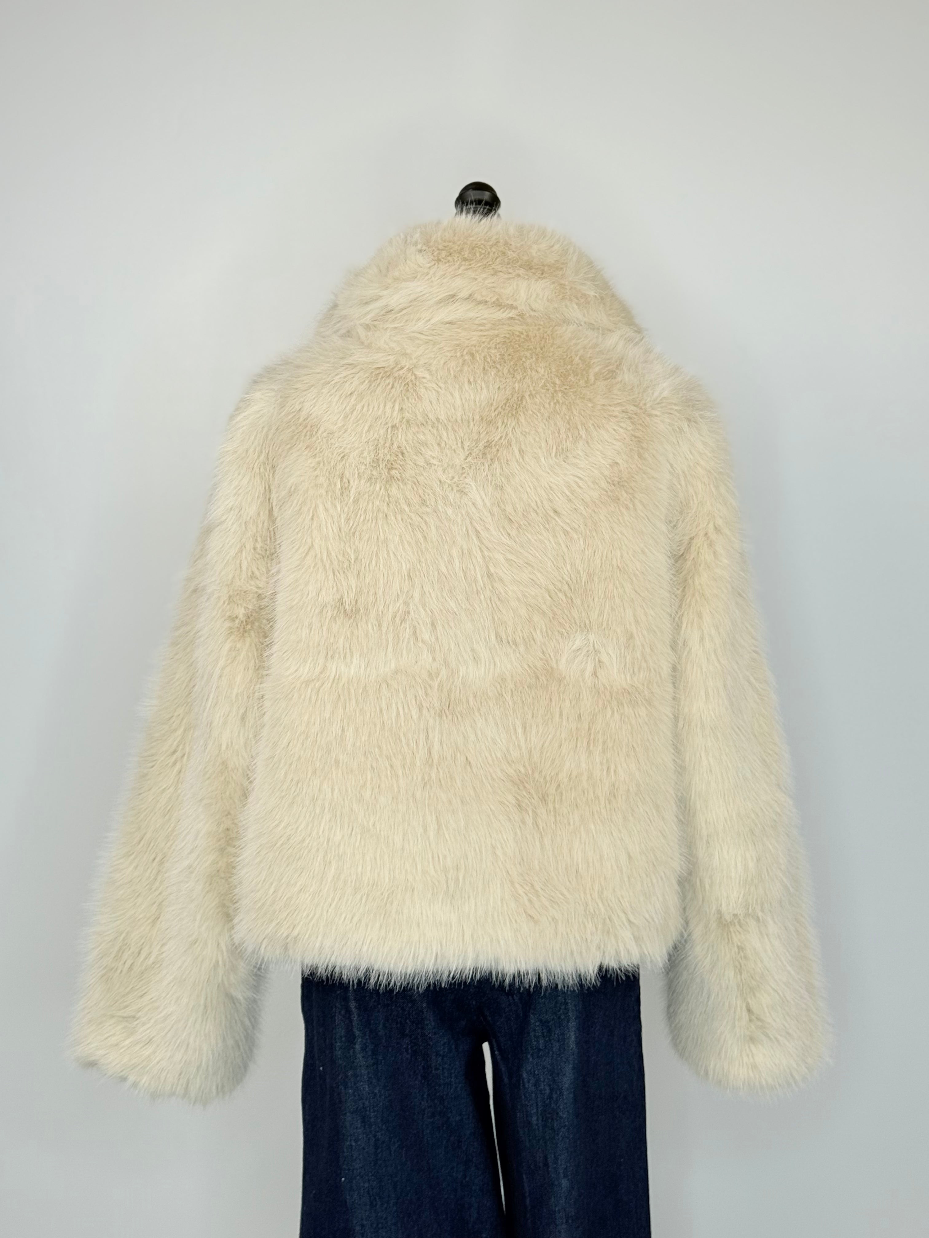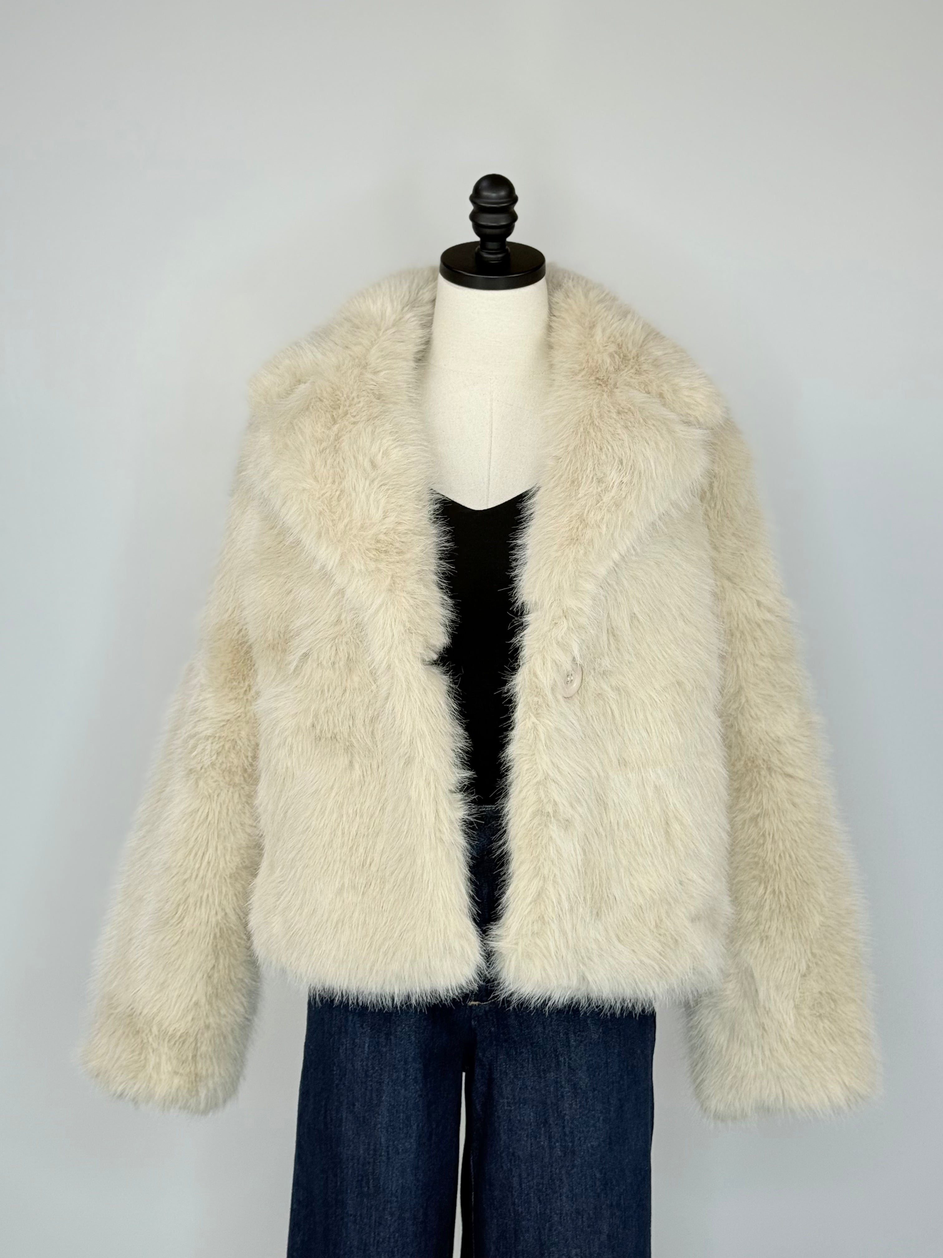 The Apricot Fur Collar Short Coat in Cream is crafted from luxurious faux fur, providing exceptional softness and warmth to shield you from chilly weather. This lined coat includes a stylish collar and lapels, convenient side pockets, and a shorter length that creates a streamlined, flattering look.