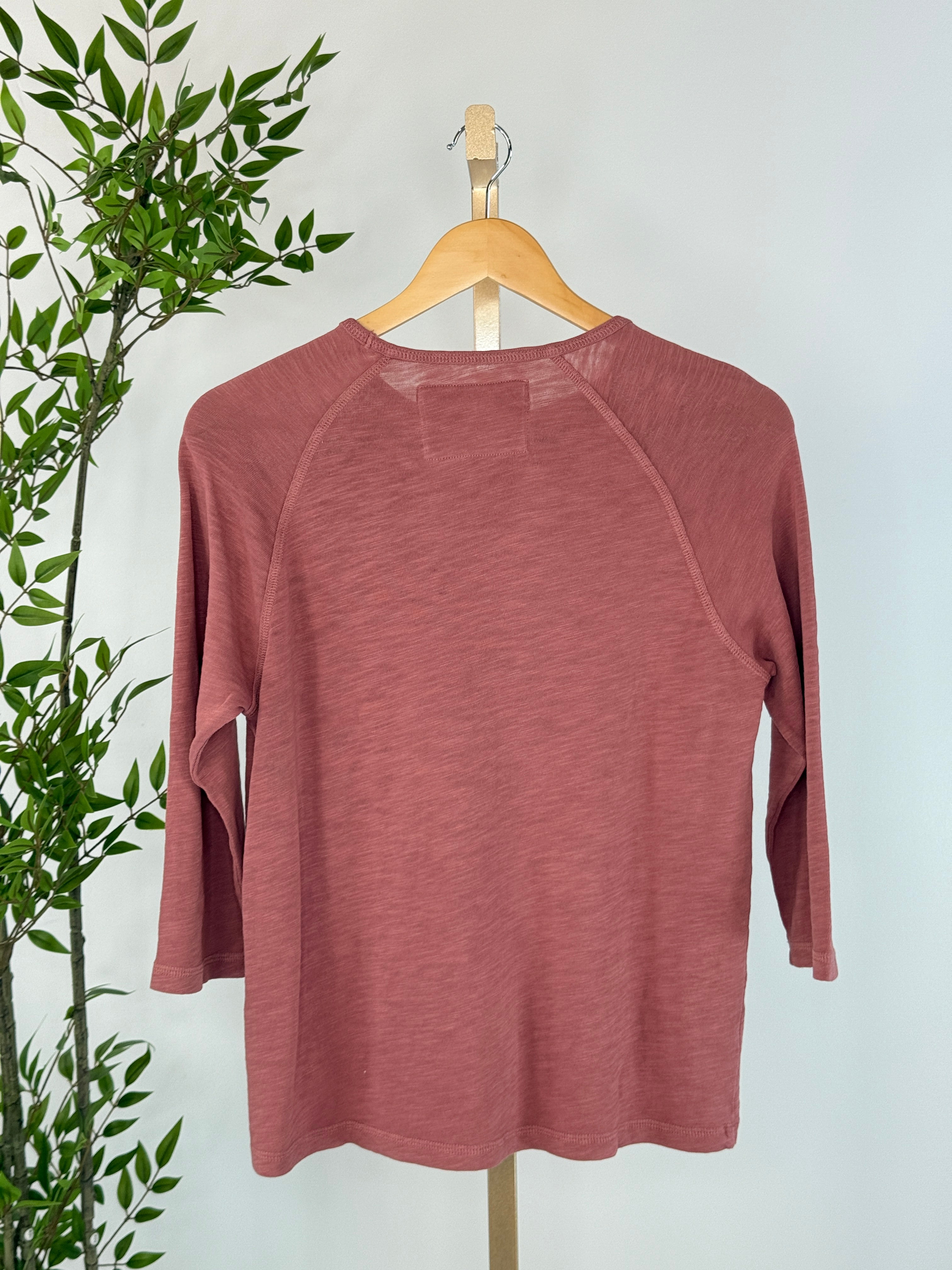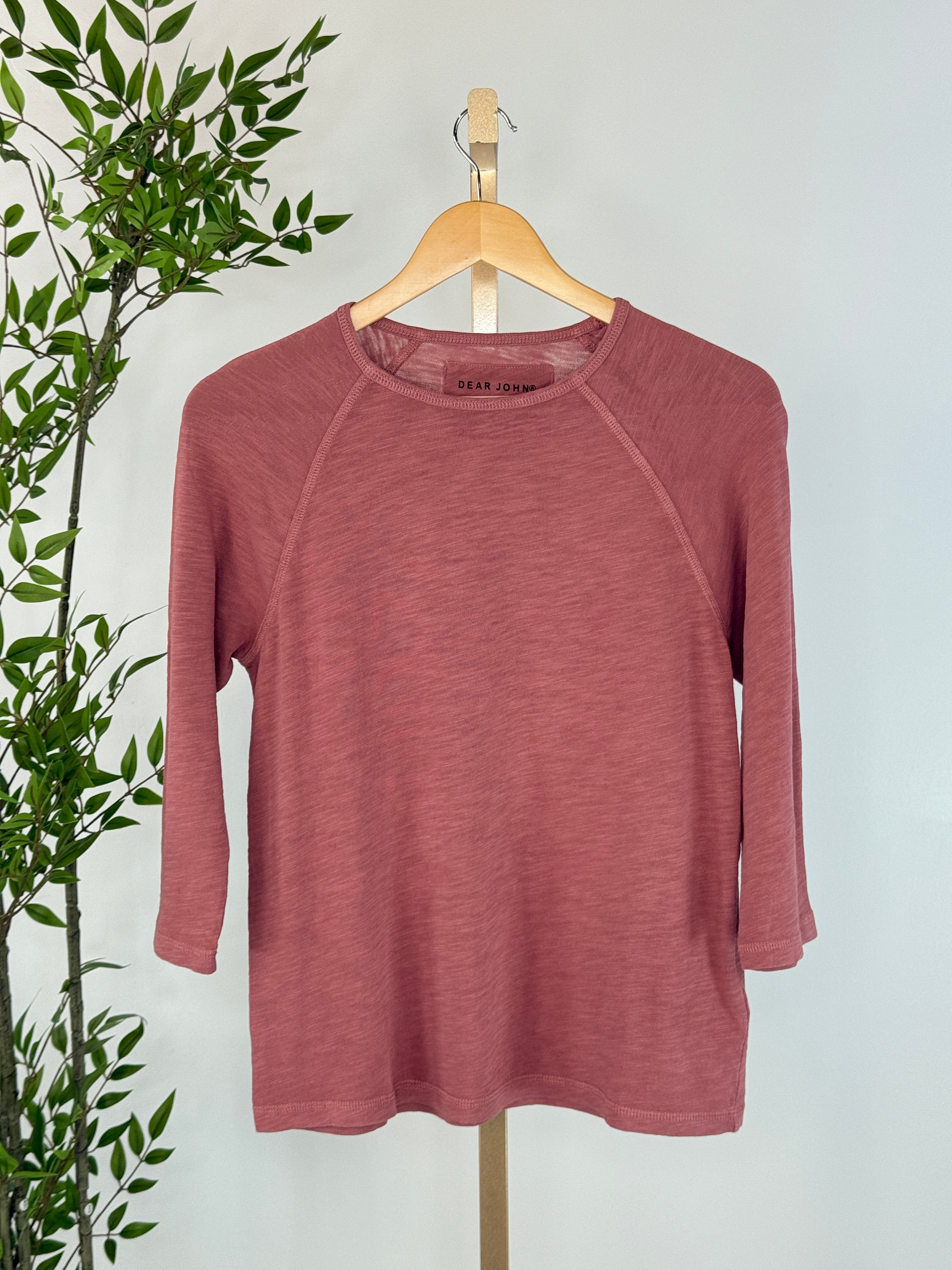 This Dear John Sonoma Top in Copper Rose features 3/4 raglan sleeves, a round neckline, and a semi-fitted cut with a regular length. It's perfect for layering or wearing on its own, and pairs well with jeans.