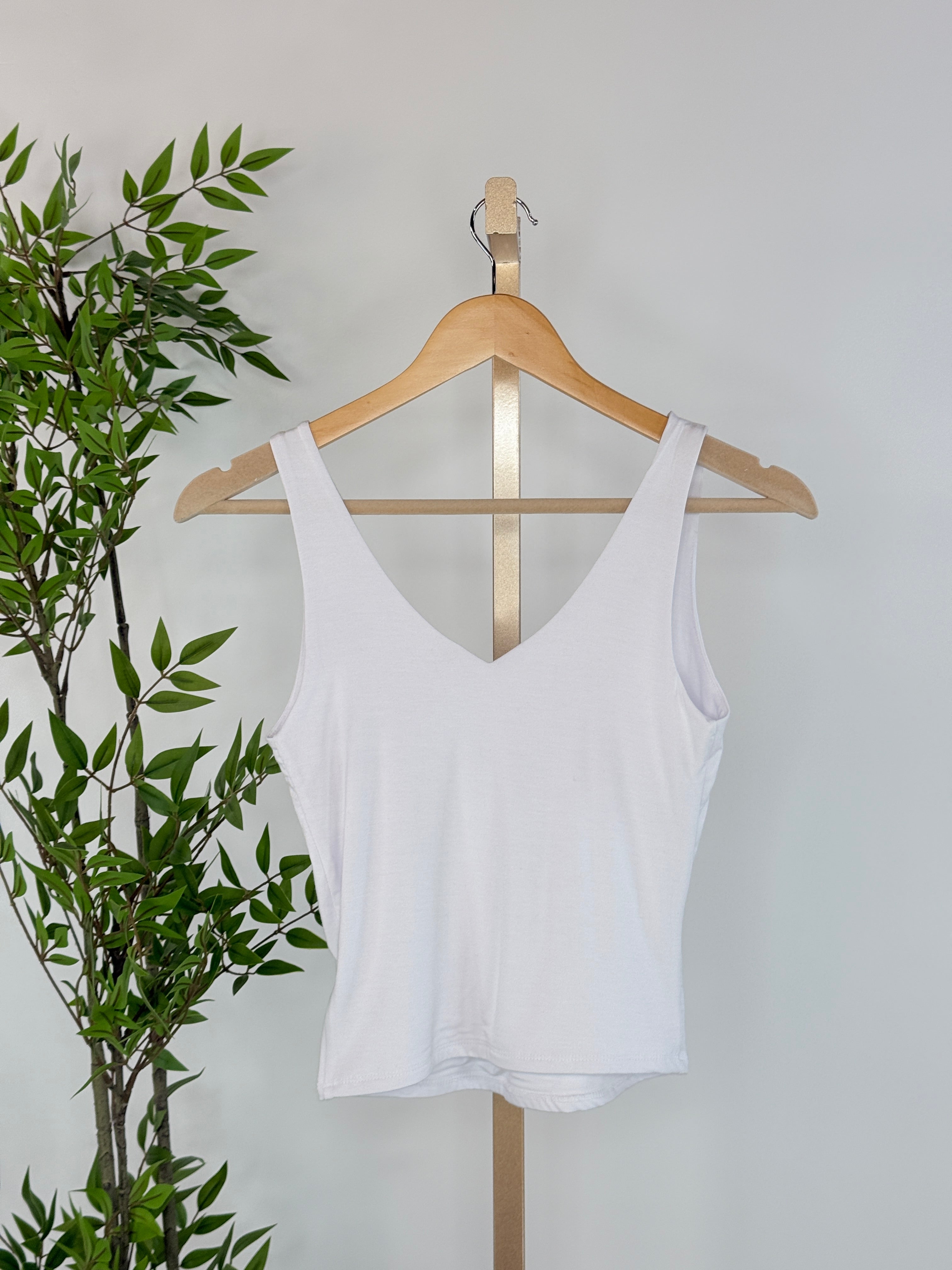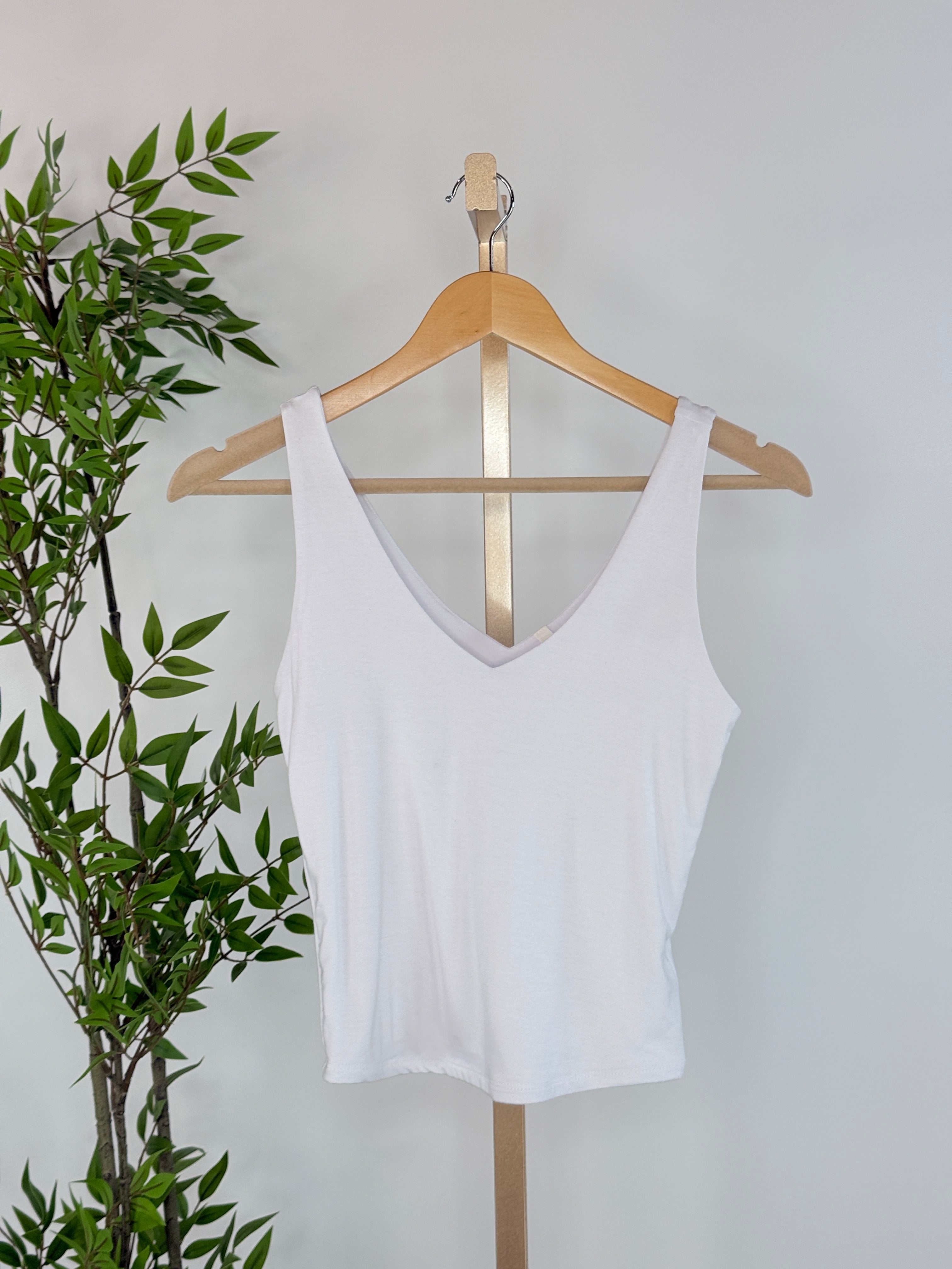 The Dual-View Essential Tank in White is the kind of elevated basic every thoughtfully curated wardrobe needs. Designed with a flattering V-neckline on both the front and back, this tank offers a clean, modern silhouette that feels effortlessly polished. The soft, breathable stretch fabric drapes smoothly while providing gentle structure, making it perfect for layering or wearing on its own. The versatile white tone brightens any outfit and pairs beautifully with everything from relaxed denim to tailored layers. Whether styled under cozy knits or worn solo on warmer days, this tank brings timeless simplicity and everyday ease