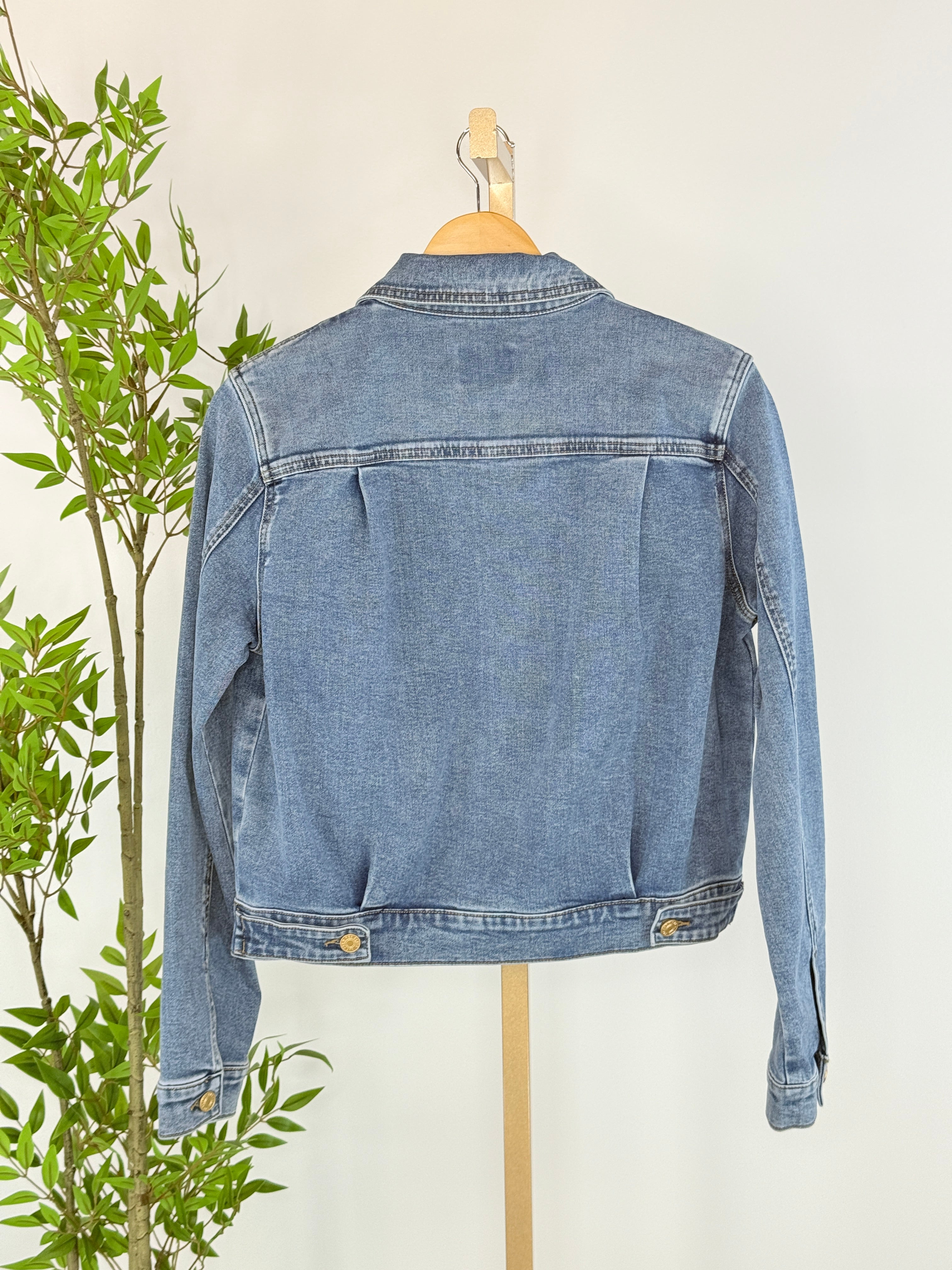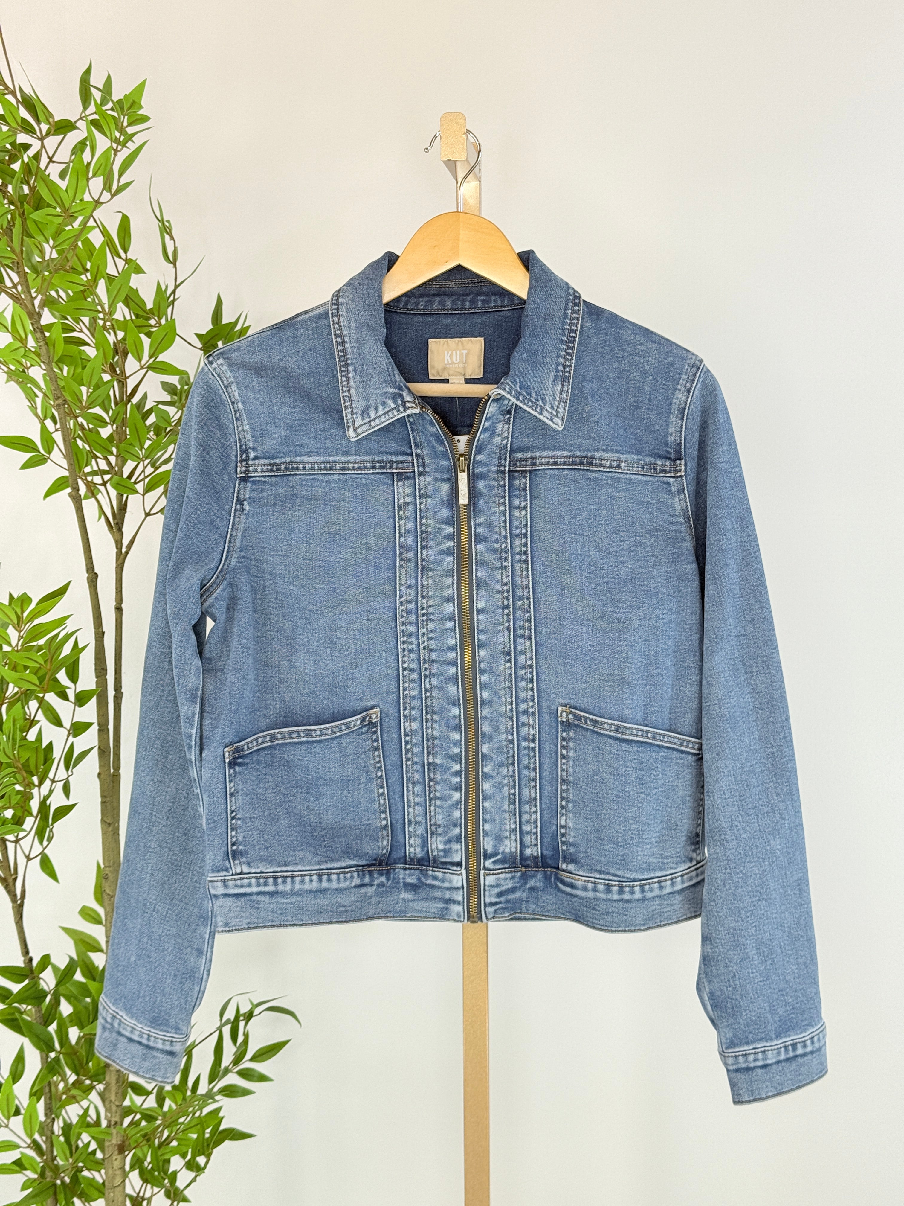 Cool, classic, and endlessly wearable, Kut form the Kloth Genevieve Denim Jacket in Admiring is your new go-to layer for effortless everyday style. Crafted in a timeless medium-wash denim, this jacket features a modern zip-front closure that gives a fresh twist to a classic silhouette. Designed with a structured collar, clean seam detailing, and front patch pockets, it strikes the perfect balance between polished and casual. The slightly crop length flatters the waist and pairs beautifully with high-rise denim, dresses, or relaxed trousers. Finished with subtle stretch for comfort, this is a jacket you’ll reach for season after season.