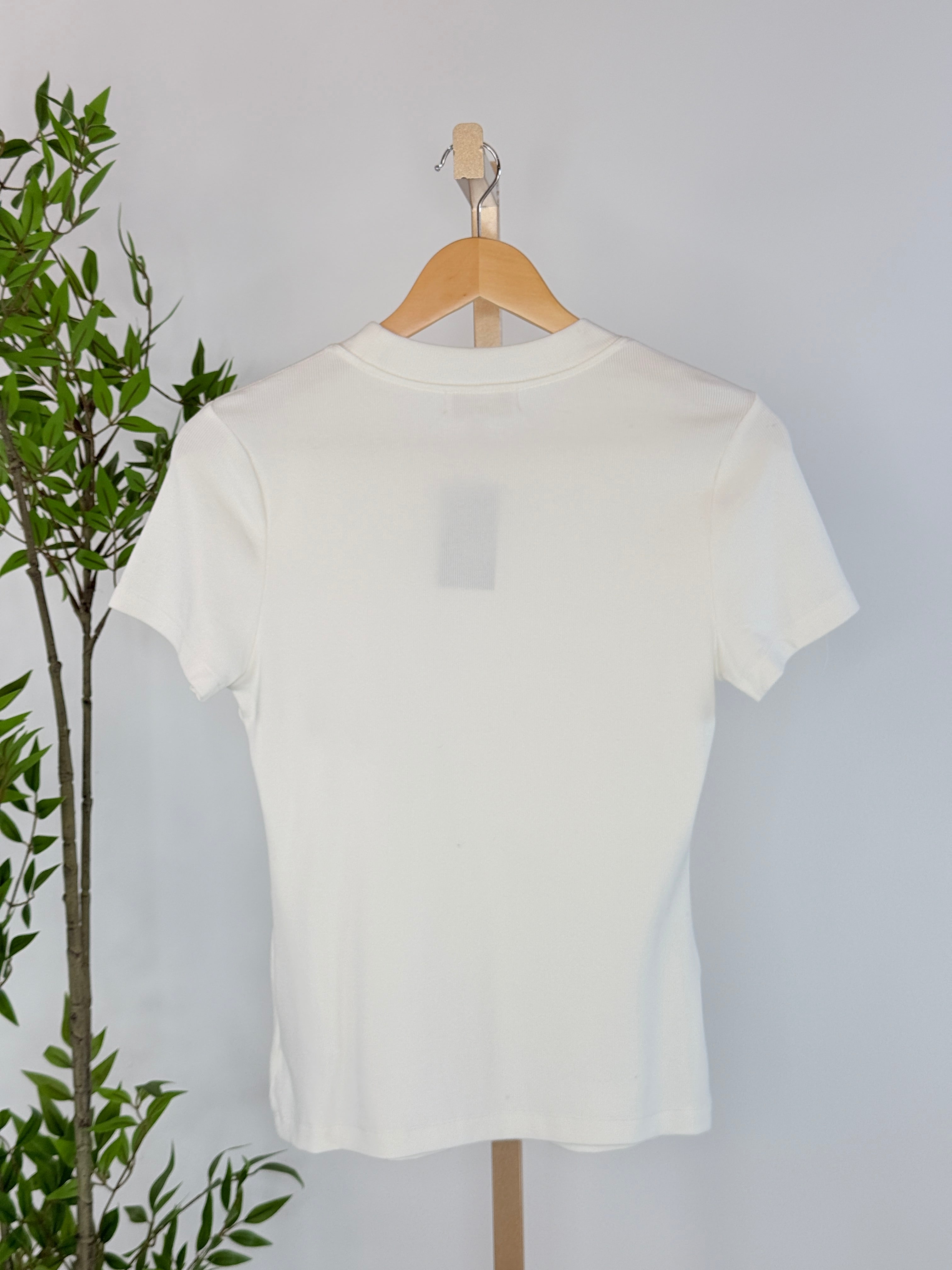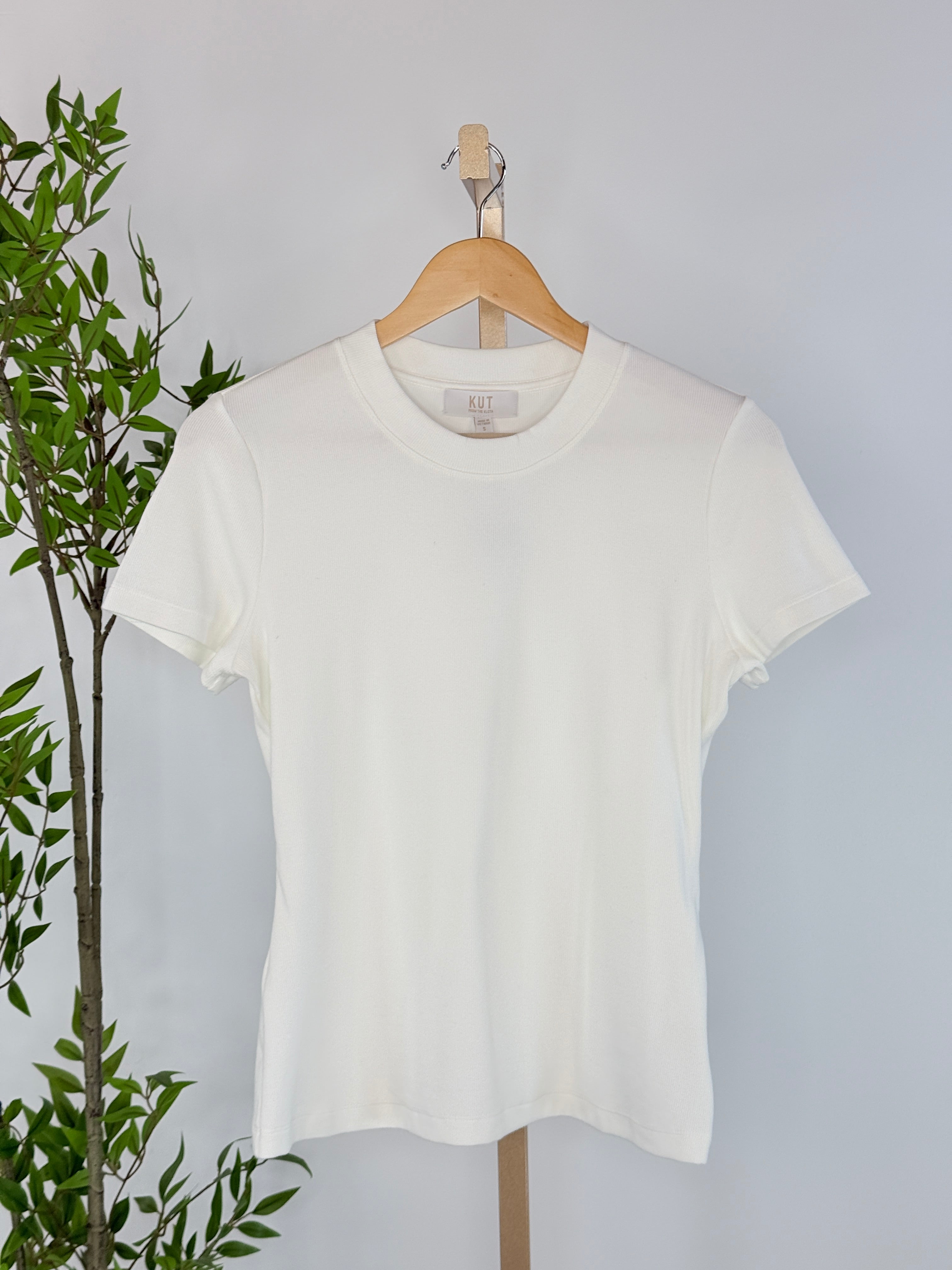 Simple, flattering, and endlessly wearable, Kut from the Kloth Langley Top in White is the foundation piece every wardrobe needs. Crafted in a soft white ribbed knit, this classic short-sleeve top offers a smooth, body-skimming fit that feels just as good as it looks. Designed with a clean crew neckline and subtle stretch, this tee layers effortlessly under jackets and cardigans or stands beautifully on its own. The elevated ribbed texture adds a polished touch, making it easy to dress up with tailored trousers or keep casual with your favorite denim.