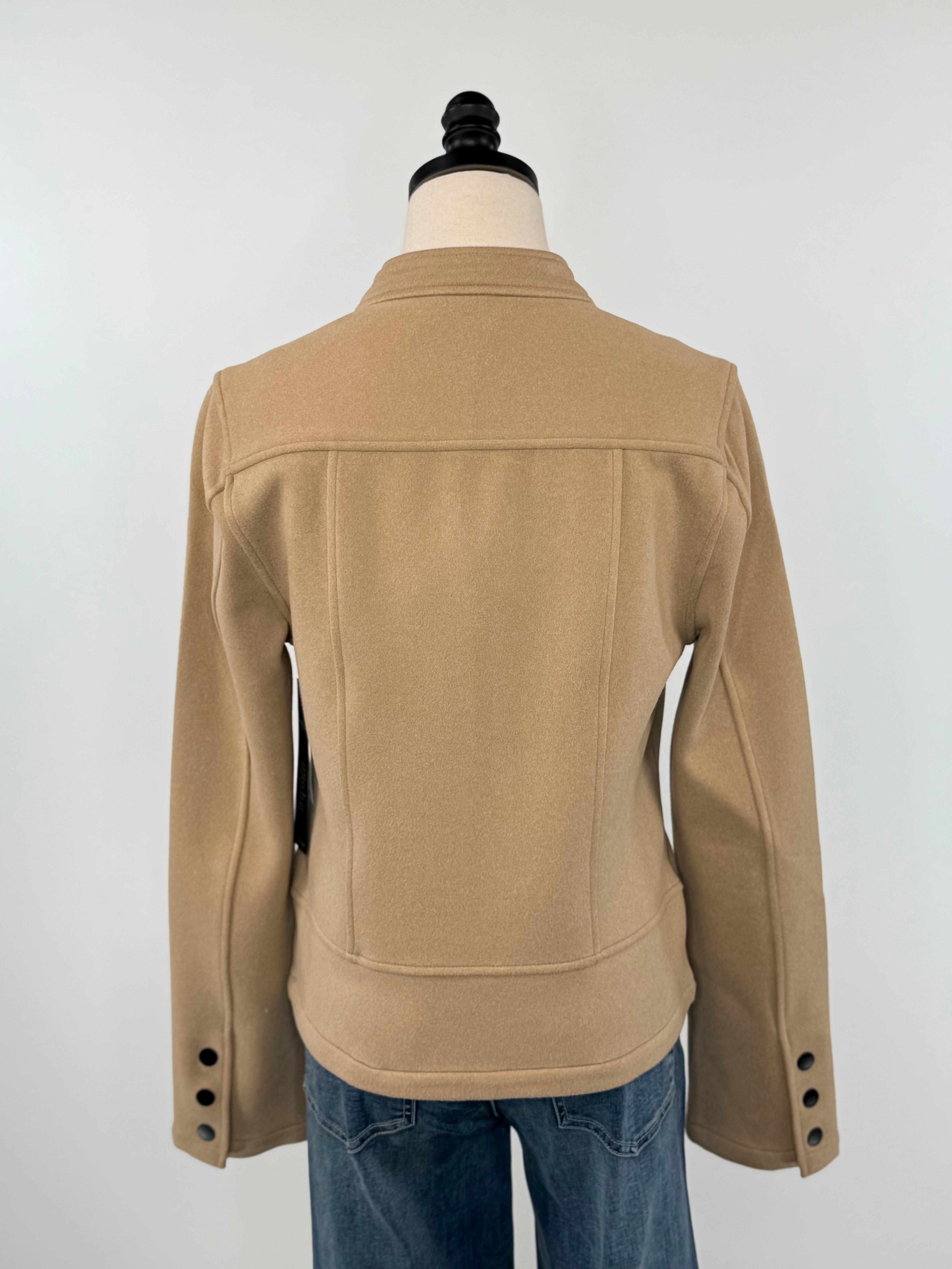 The Liverpool Biker Jacket in Camel adds a sophisticated edge to your outfits. Featuring a streamlined zip front, snap-tab collar, two angled side pockets, snap button cuffs, and subtle hardware, it reimagines the classic biker style with a clean, polished look. Made from a stretchy, softly brushed fabric blend, it provides comfort and shape, making it ideal for layering over tees, sweaters, or tailored pieces.