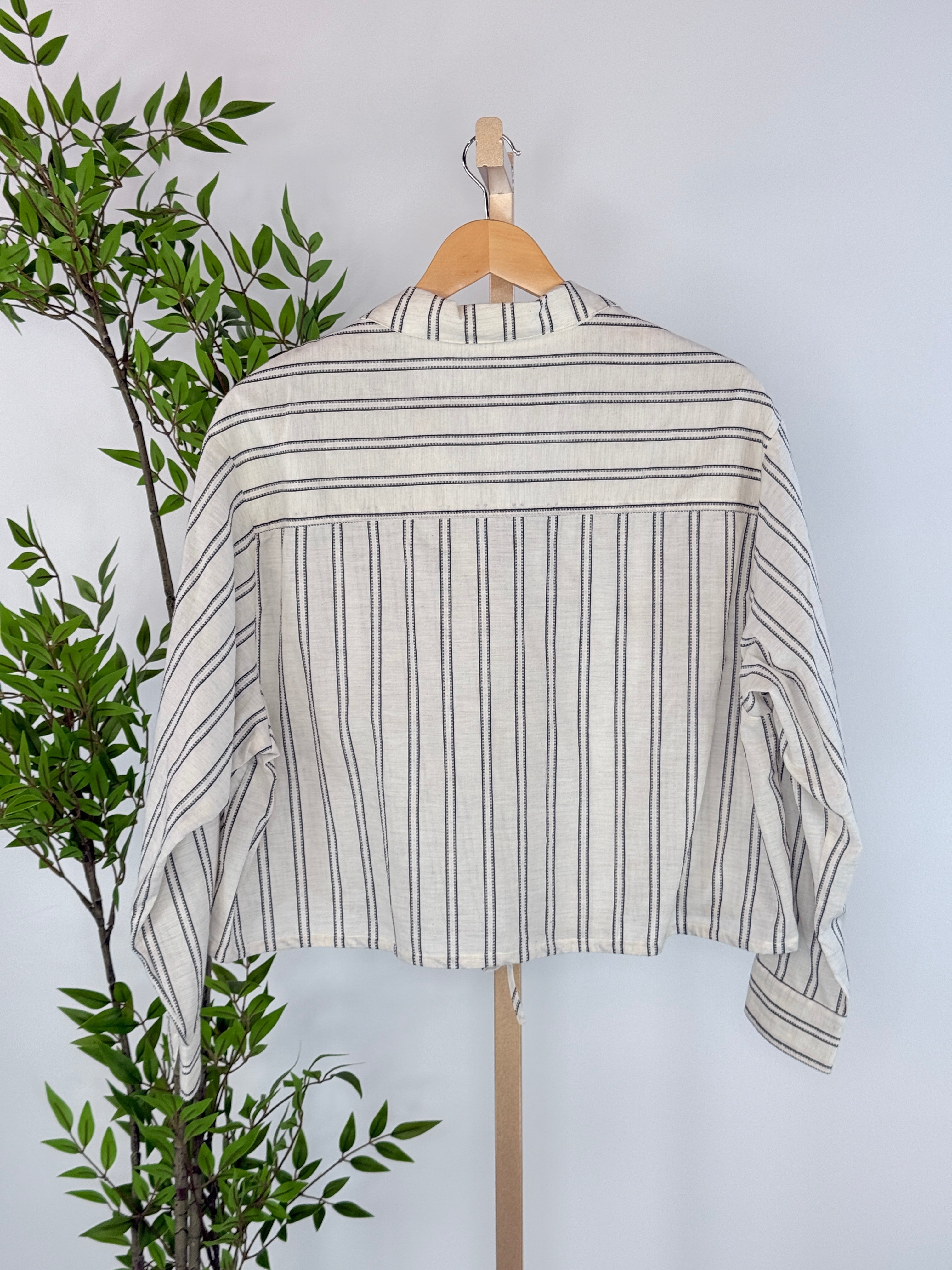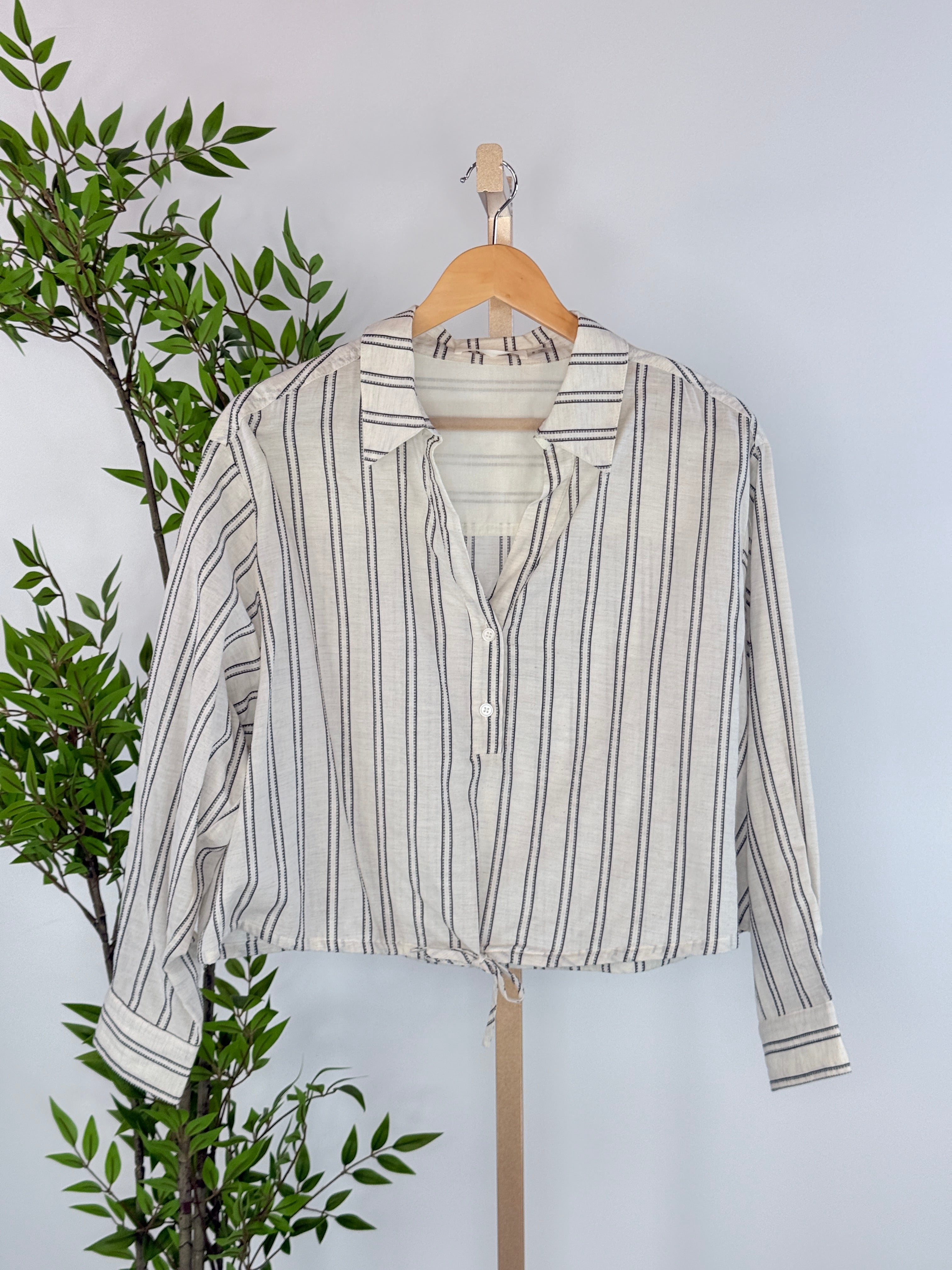 Easy, airy, and endlessly wearable, the Breeze Stripe Drawstring Top in Natural is your go-to for relaxed everyday style with a polished touch. Featuring a soft neutral base with delicate vertical stripes, this lightweight button front top is designed with a subtle crop length and adjustable drawstring hem for a flattering, customizable fit. The relaxed silhouette, classic collar, and roll-ready sleeves give it that effortless “throw on and go” feel, perfect for warm days, casual weekends, or easy layering as seasons change. Crafted in a breathable woven fabric, it’s as comfortable as it is versatile.