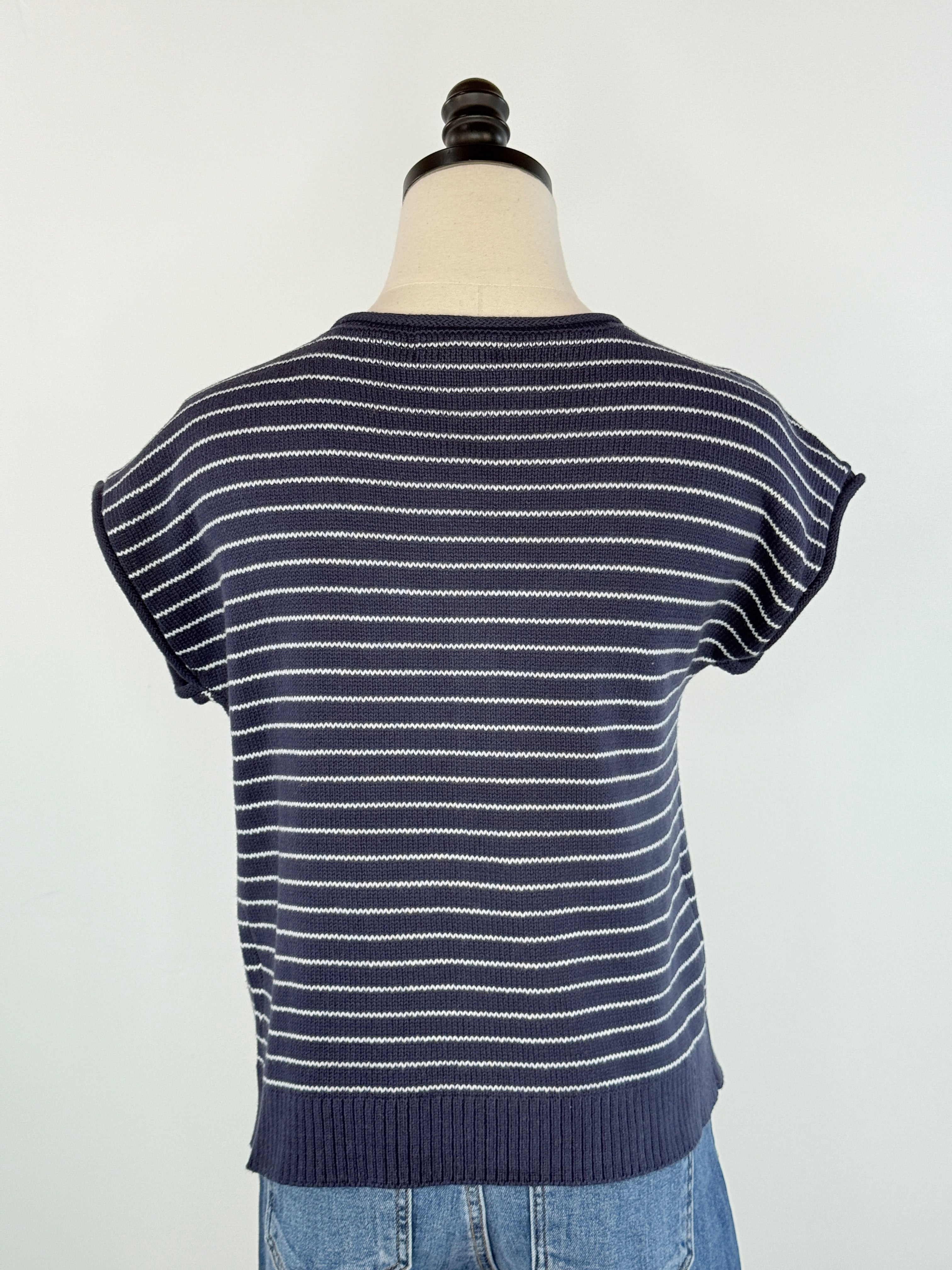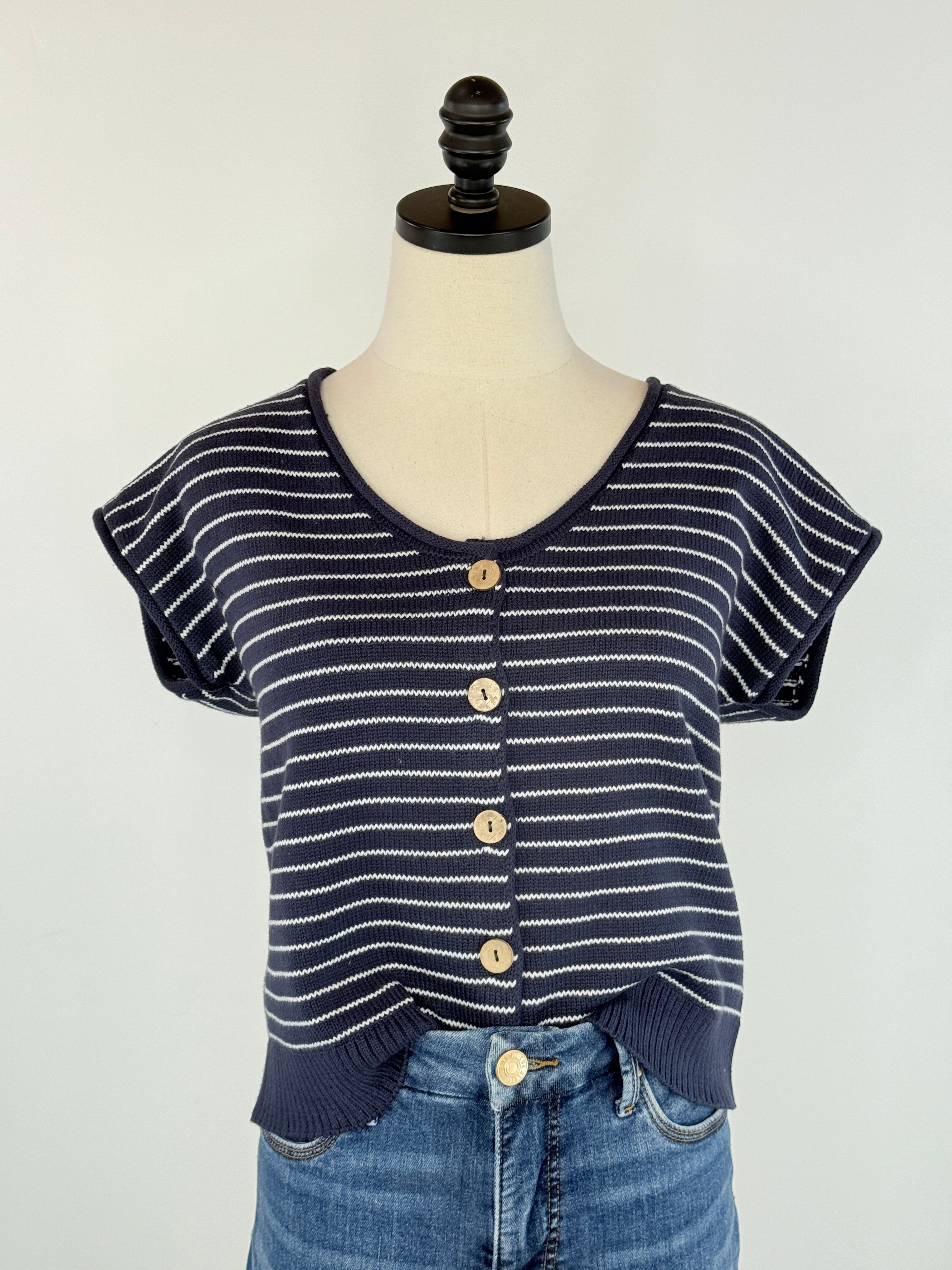 Easy, breezy, and endlessly charming, the Jovi Button Knit Top in Navy brings a fresh feel to everyday style. Designed in classic navy with crisp ivory stripes, this lightweight knit features a flattering scoop neckline, short sleeves, and a row of natural-look buttons down the front for a relaxed yet polished finish. The soft knit fabric drapes beautifully while the ribbed hem adds subtle shape, making it perfect for wearing loose or giving a casual front tuck with your favorite denim.