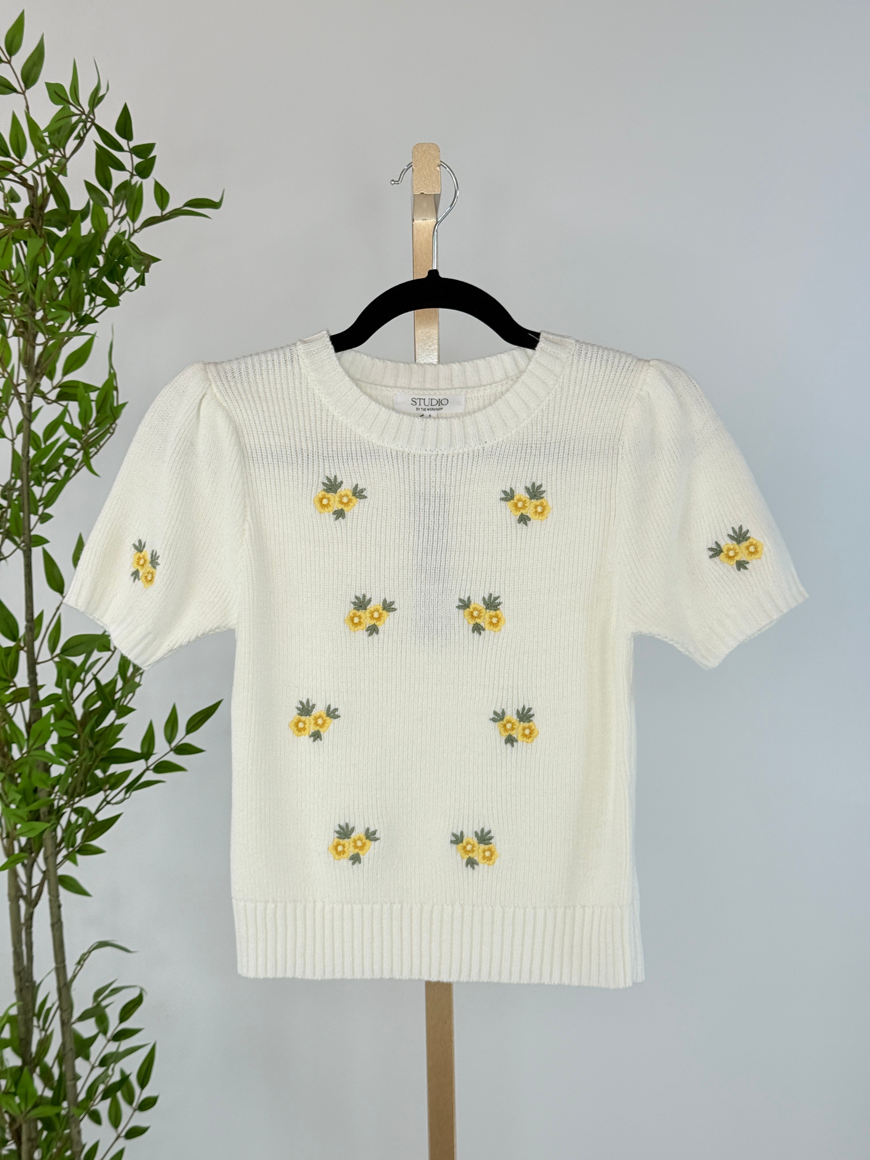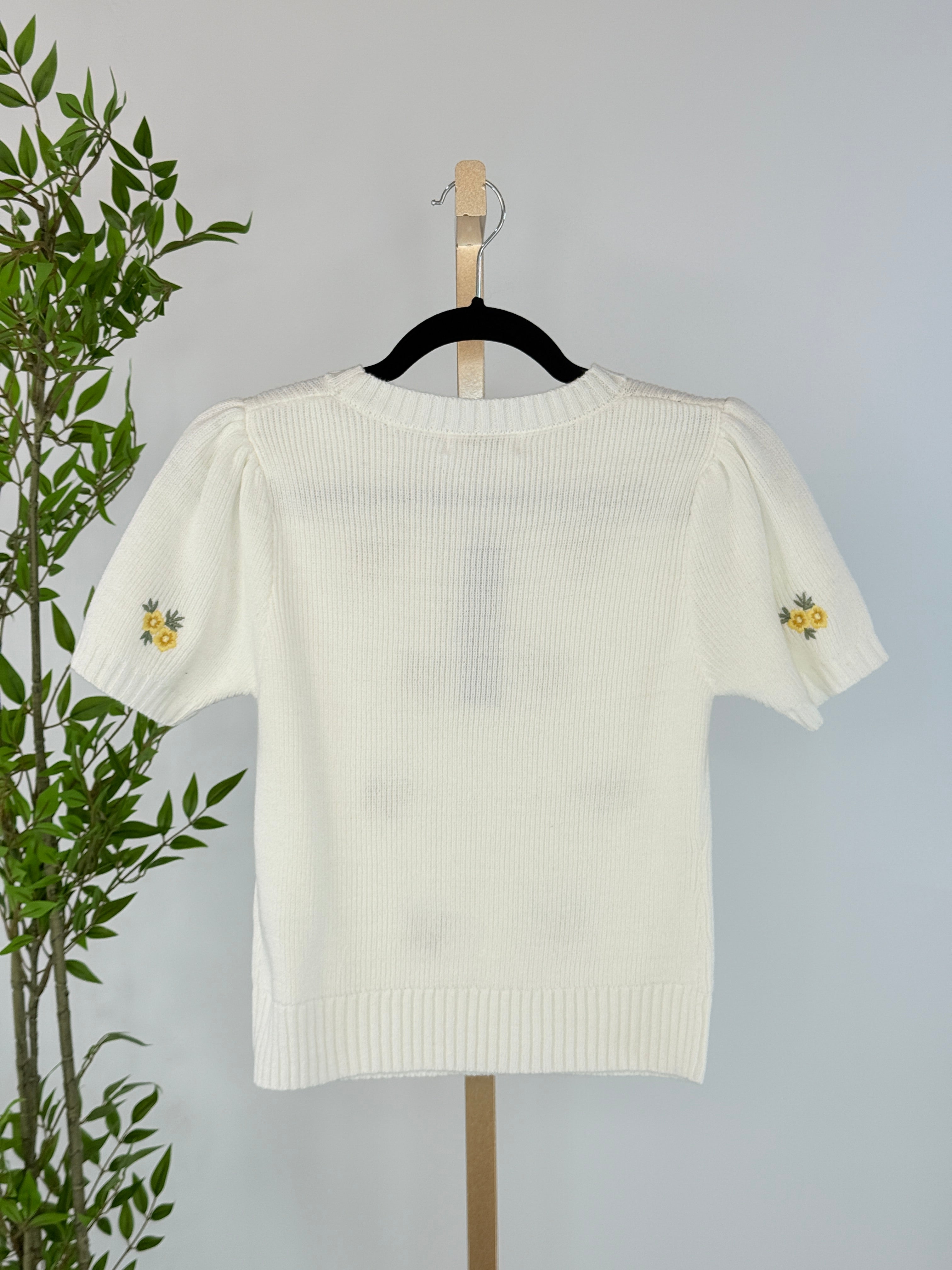 Sweet, charming, and effortlessly wearable, our Lila Short Sleeve Sweater brings a touch of vintage-inspired femininity to your everyday wardrobe. This soft cream short sleeved sweater features delicate embroidered yellow florals scattered across the front and sleeves, creating a subtle pop of color that feels both cheerful and timeless. Designed with gentle puff sleeves and a classic crew neckline, this pop over sweater offers a flattering, easy fit that works year-round. The ribbed hem and neckline add structure, while the lightweight knit keeps it comfortable and breathable. Perfect for layering or wearing on its own.
