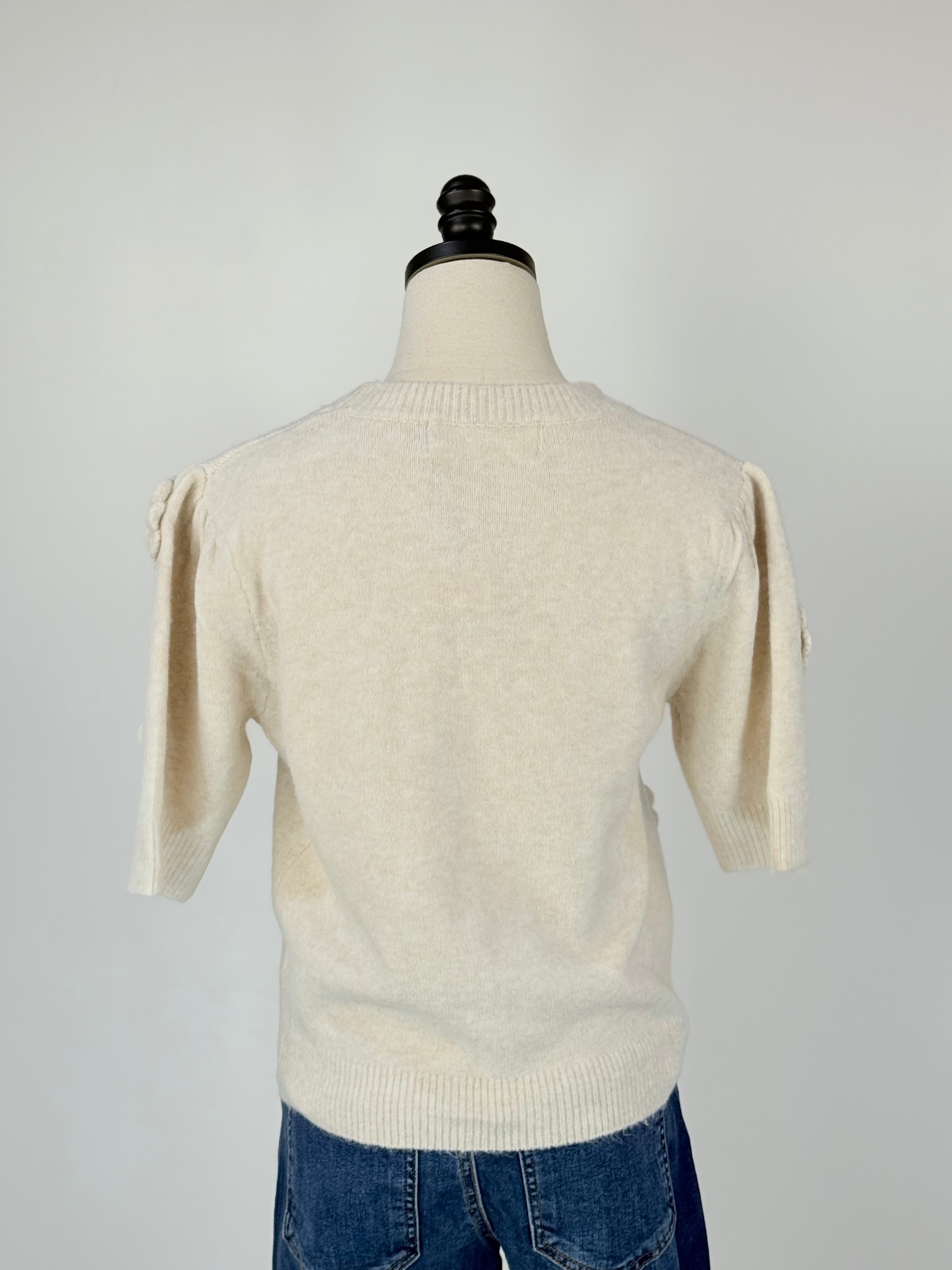 The Roslyn Sweater offers a warm and classic feel, enhanced by delicate rosette accents that add a distinctive touch. Featuring ribbed hems and cuffs, this super soft sweater blends everyday comfort with a unique style you’ll love to wear.
