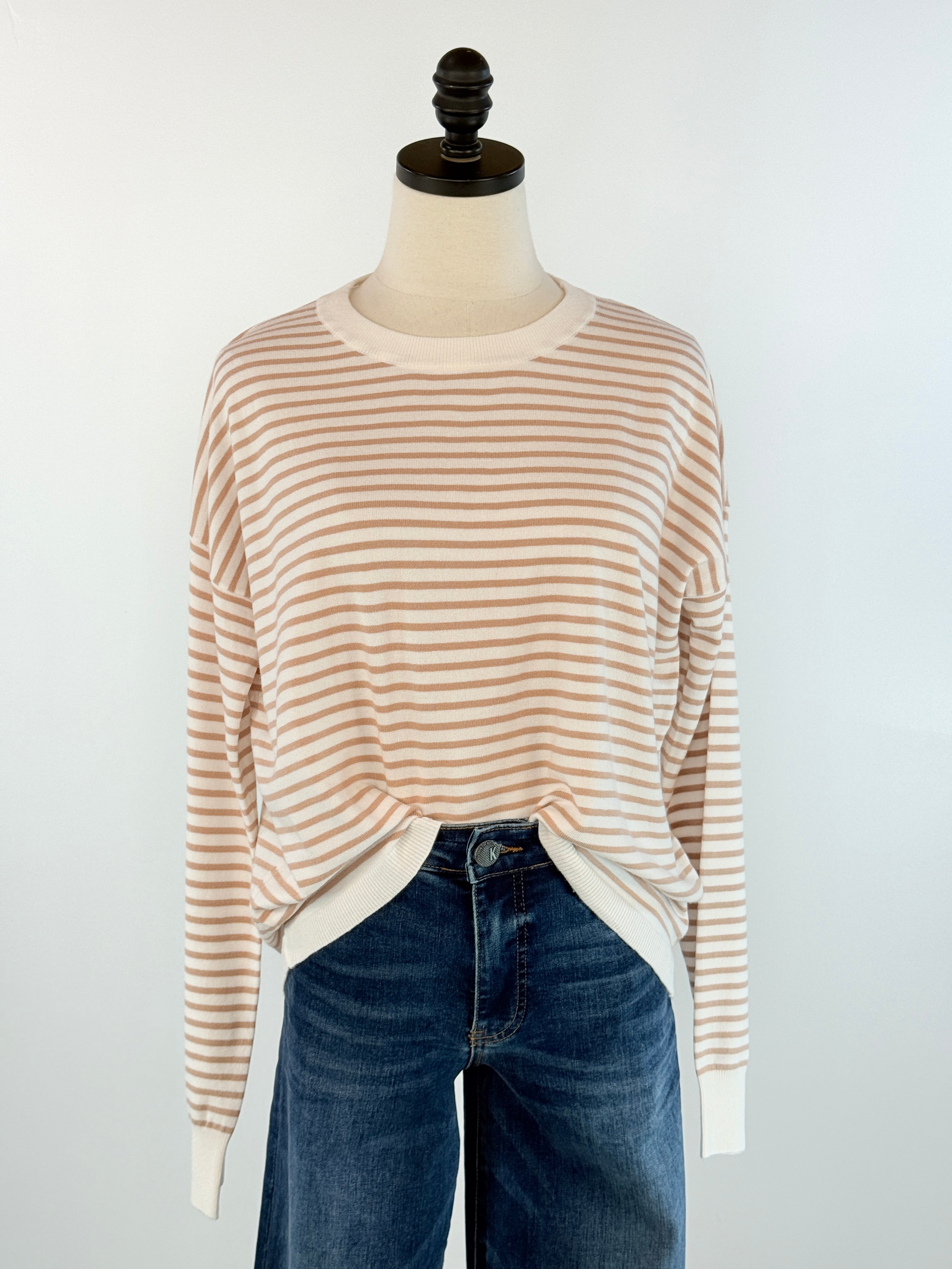 Effortlessly classic with a touch of coastal charm, the Sandbar Breeze Striped Sweater in Taupe and Ivory is your new go-to for laid-back, elevated style. Featuring soft ivory and warm tan stripes, this lightweight knit brings a clean, timeless look that pairs beautifully with denim, linen, or your favorite joggers. Designed with a relaxed silhouette, drop shoulders, and contrasting ribbed trim, it drapes just right for everyday comfort.