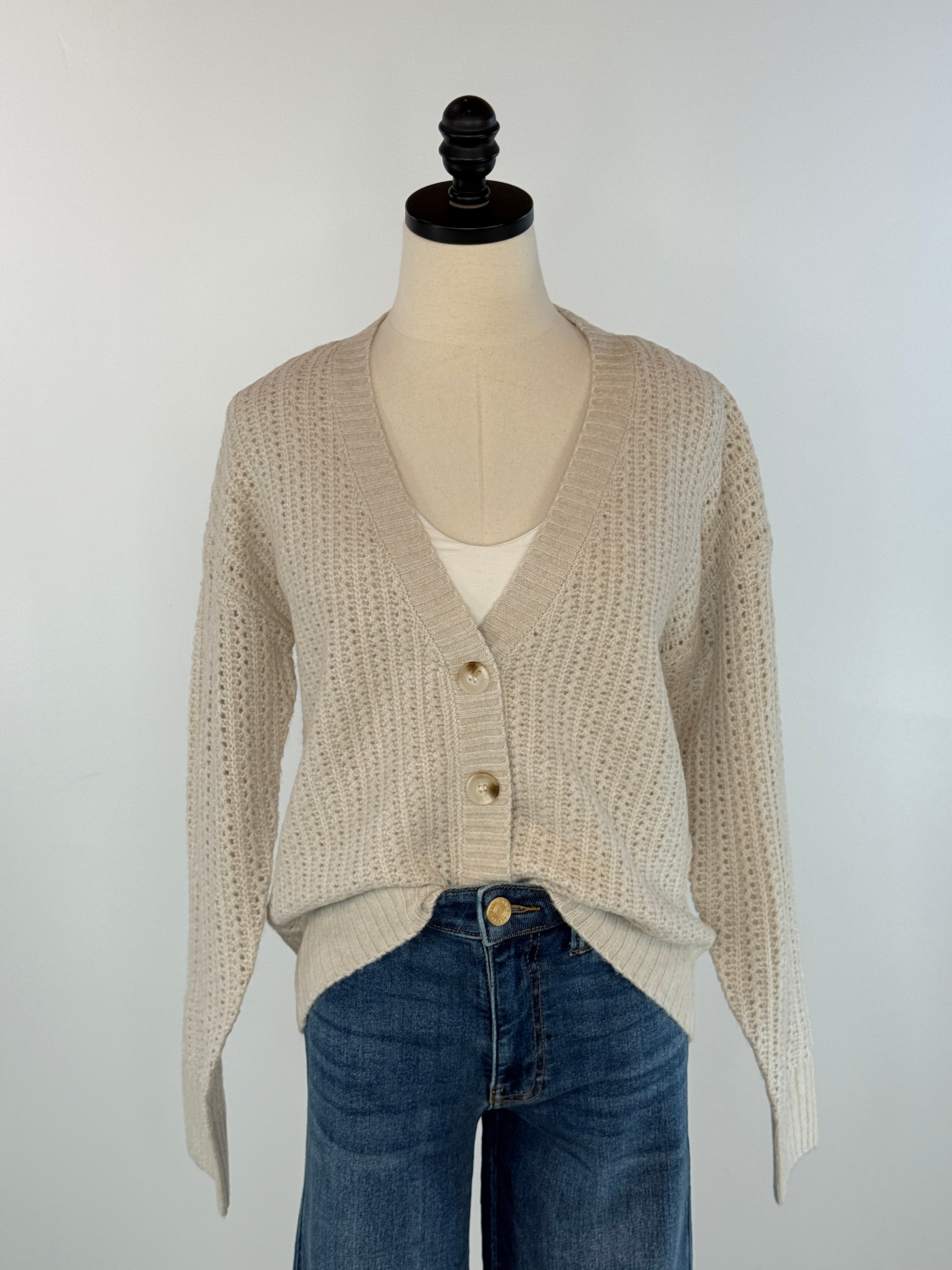 Meet your new favorite layering piece, the Thread & Supply Amour Cardigan in Ecru. This playful knit cardigan features a relaxed drop shoulder cut that feels as good as it looks, complete with a convenient button-front closure for effortless styling. Whether you're dressing it up or keeping it casual, this versatile sweater is ready to become your go-to companion for any season. Comfort and style, all wrapped up in one.