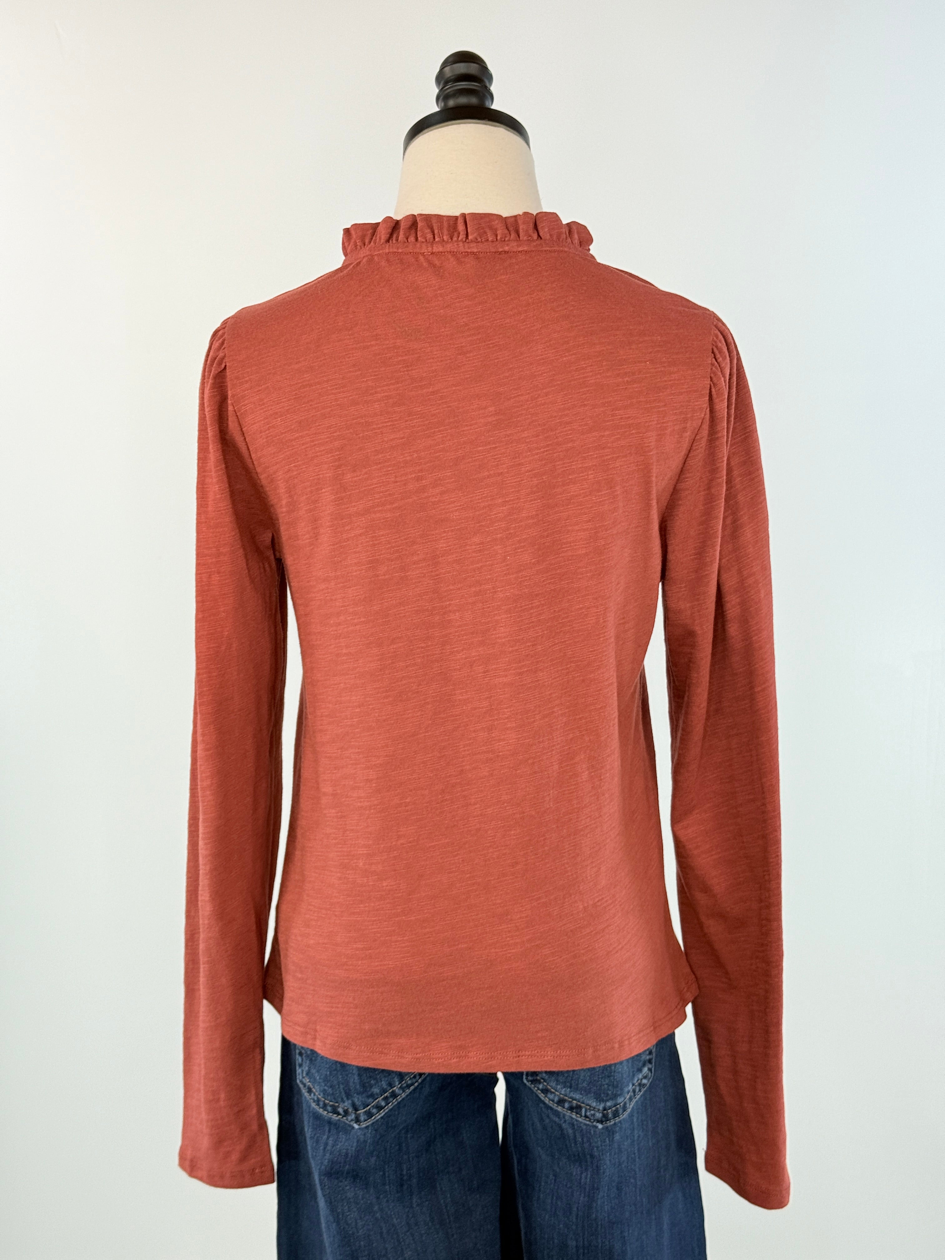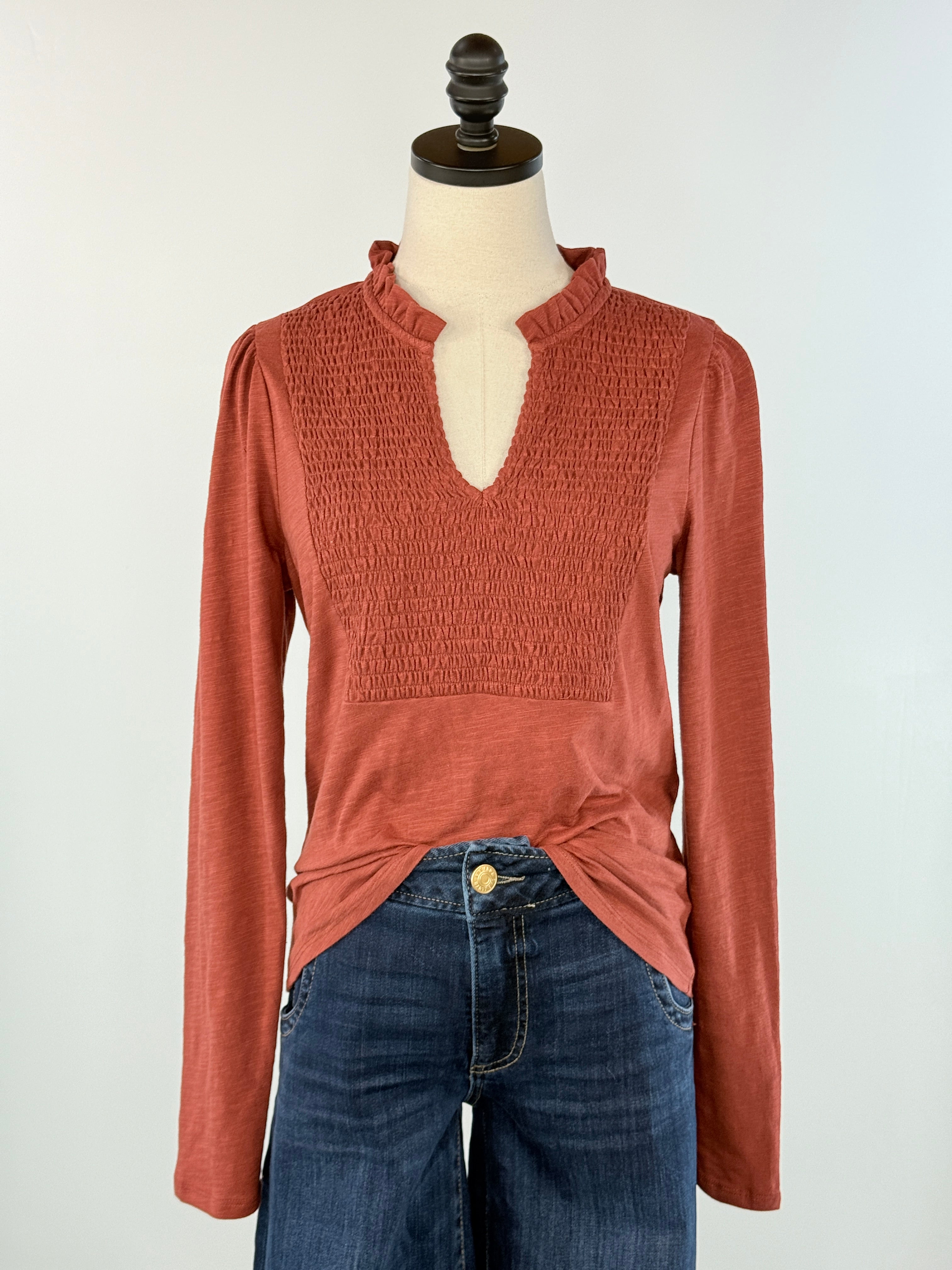 Bring a touch of effortless charm to your wardrobe with Anthem the Label Smock Bib Top in Baked Clay. This rust-colored beauty blends feminine detail with everyday wearability, making it a standout piece for any season. The soft, textured fabric offers a relaxed yet flattering fit, while the smocked bodice adds shape and visual interest that’s both timeless and trendy. The subtle ruffled neckline and split V detail create a touch of romantic flair, perfect for pairing with high-waisted denim or tucking into your favorite skirt.