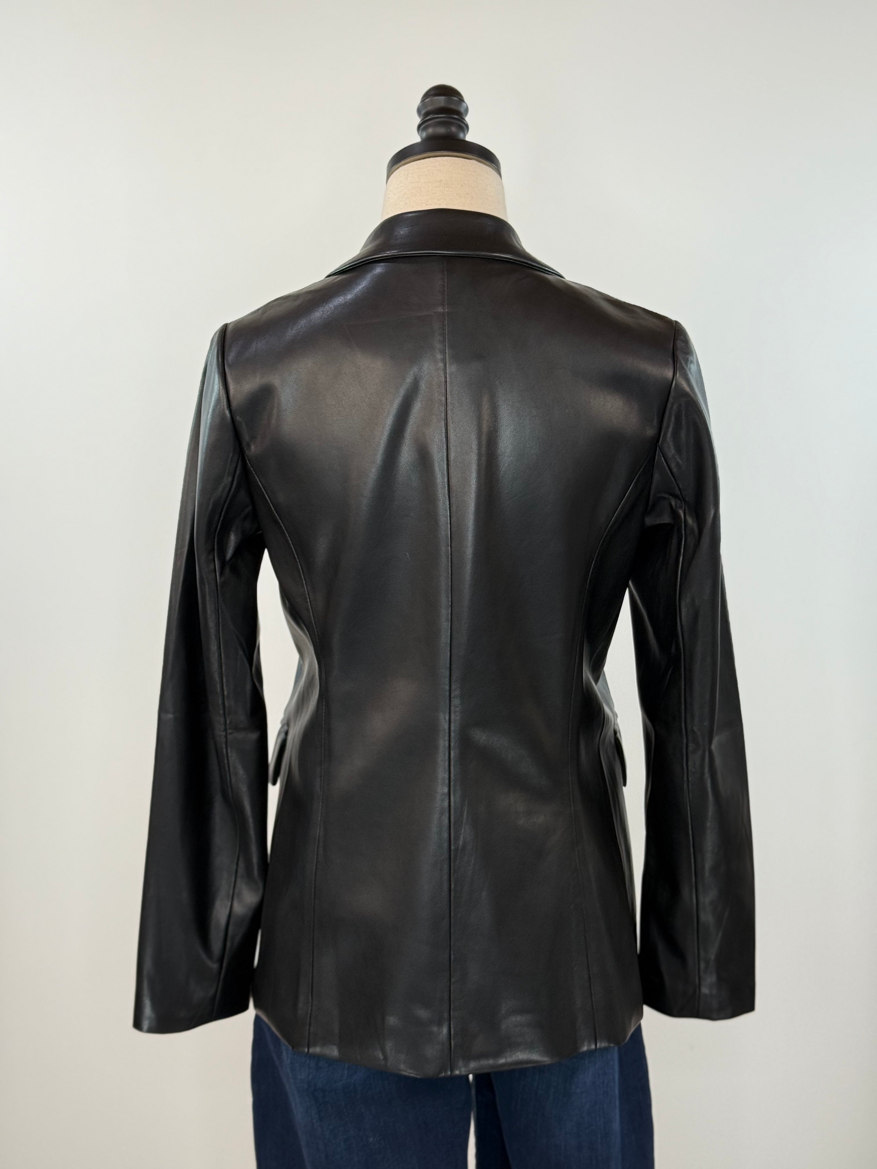 This Benedict Faux Leather Blazer in Black offers a notched collar and a open front, complemented by front flap pockets. Made from soft faux leather this blazer feels elevated and lightweight while providing a nice finish to your outfit. It’s an ideal choice for comfortable and stylish layering whether you pair it with jeans, dress pants or skirts.