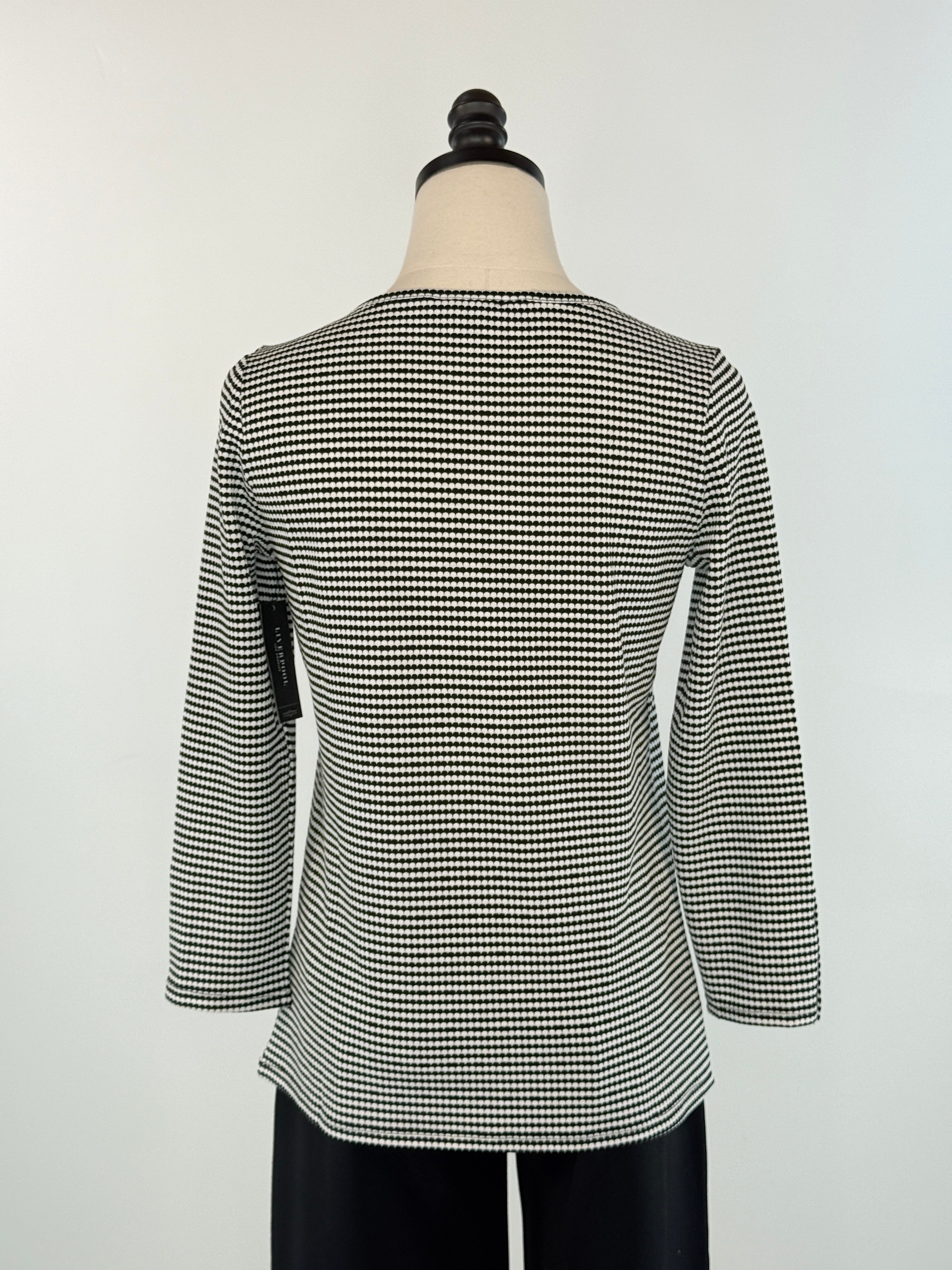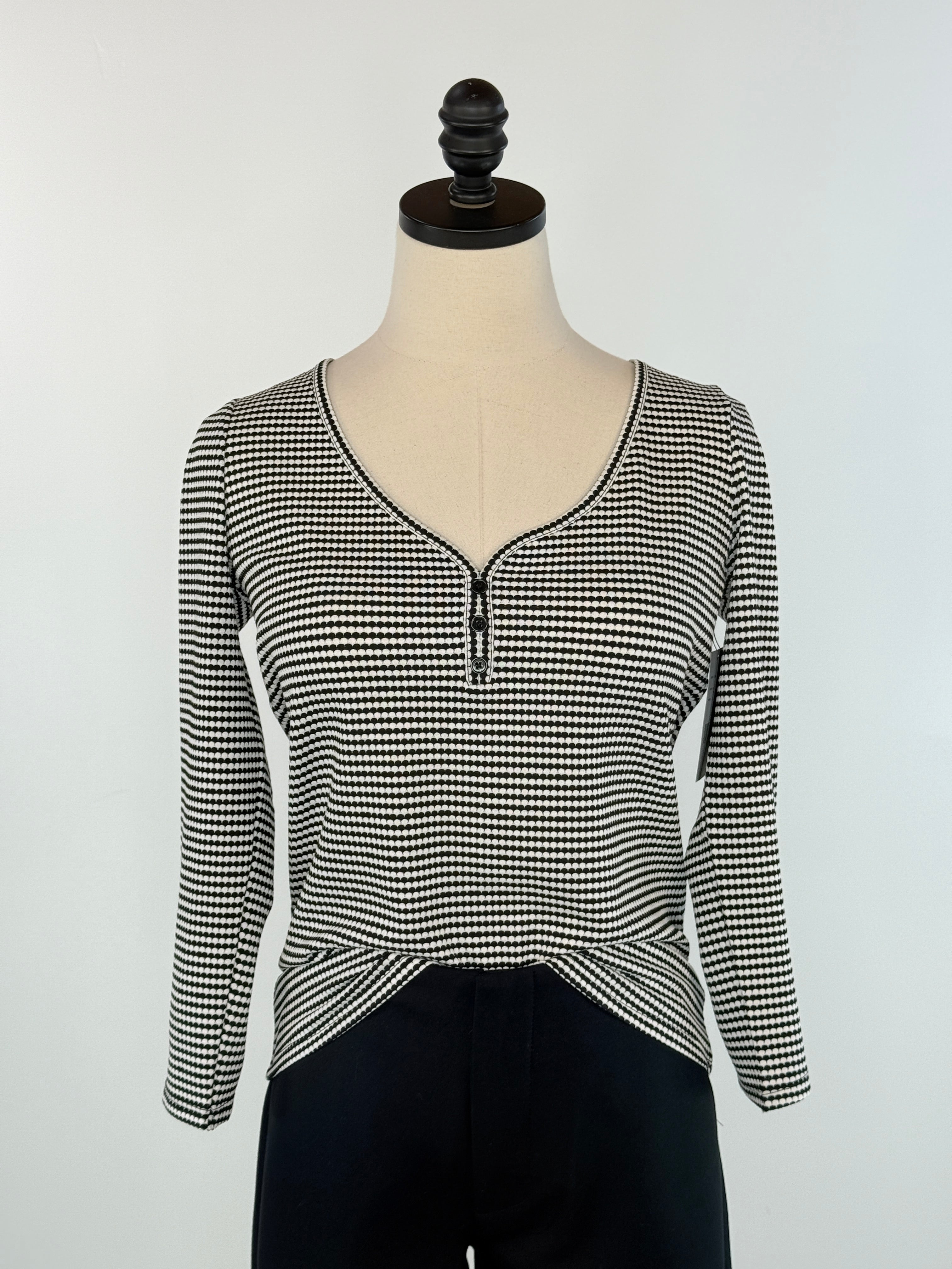 Classic with a playful twist, the Liverpool Parisian Dot Henley Top in Black and White is the kind of effortless staple you’ll reach for again and again. Designed with a timeless black and white micro dot stripe, this top brings subtle texture and visual interest while remaining endlessly wearable. The flattering V-neckline is finished with a delicate button placket, adding a touch of casual polish that works just as well dressed up as it does worn everyday. Crafted in a soft, stretchy knit, this long sleeve Henley-style top skims the body comfortably without feeling restrictive. It pairs perfectly with tailored trousers, denim, or layered under blazers and cardigans for an elevated everyday look.