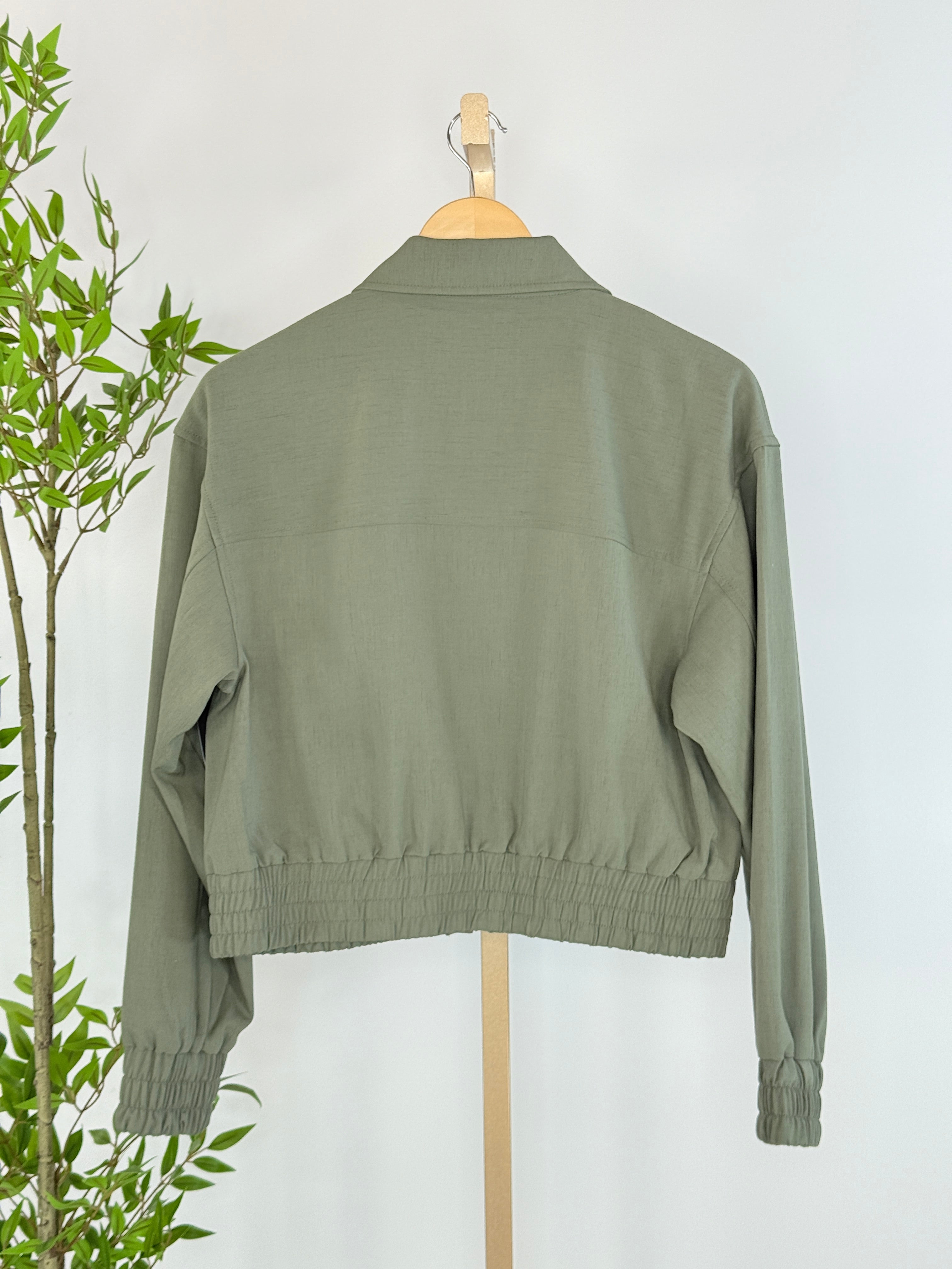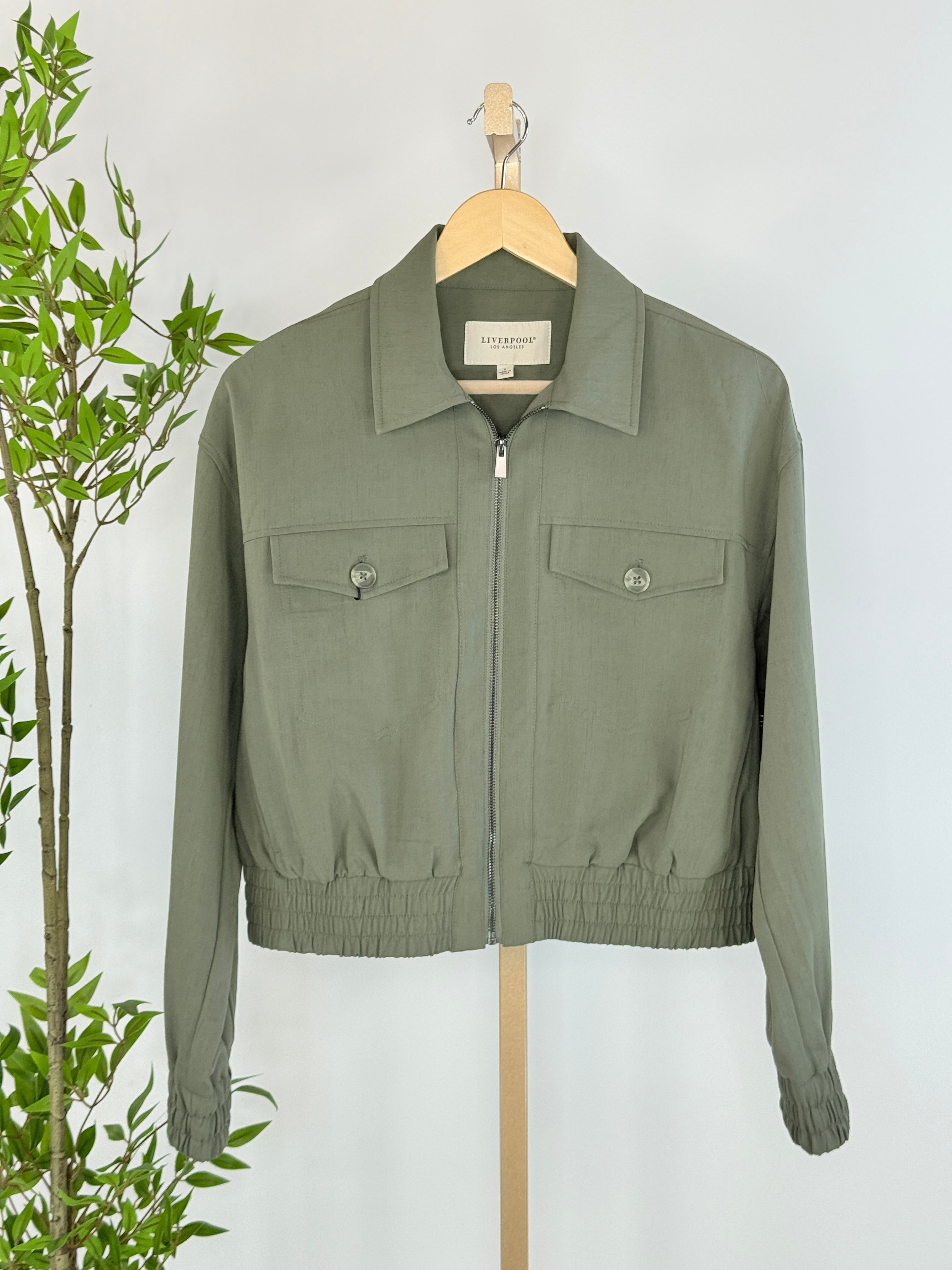 Effortlessly cool with everyday versatility, the Liverpool Zip Front Jacket in Martini Olive is the perfect lightweight layer for transitional seasons. Designed in a soft olive-green hue, this jacket features a structured collar, zip-front closure, and buttoned chest pockets for a subtle utility-inspired look. The elastic hem and cuffs create a flattering, modern silhouette that pairs beautifully with denim, dresses, or skirts. Lightweight yet polished, it’s ideal for layering over tees and knits as the seasons change.