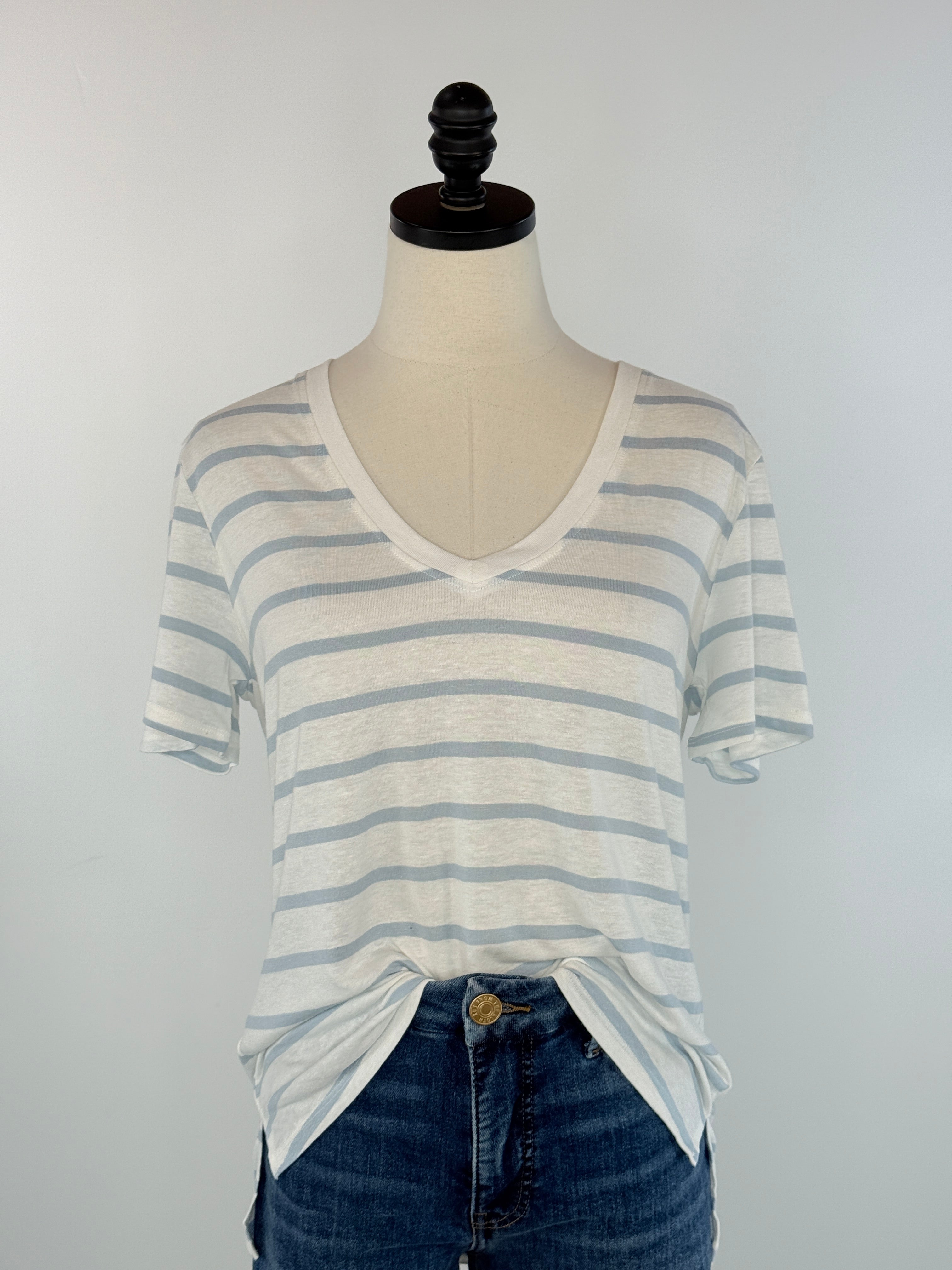 This Mika Tee in Chambray Stripe features short sleeves, a v-neck, and a relaxed fit with a finished hem. Made of a soft linen blend, it maintains its shape all day and drapes beautifully. Perfect for a casual style, pair it with jeans or shorts.