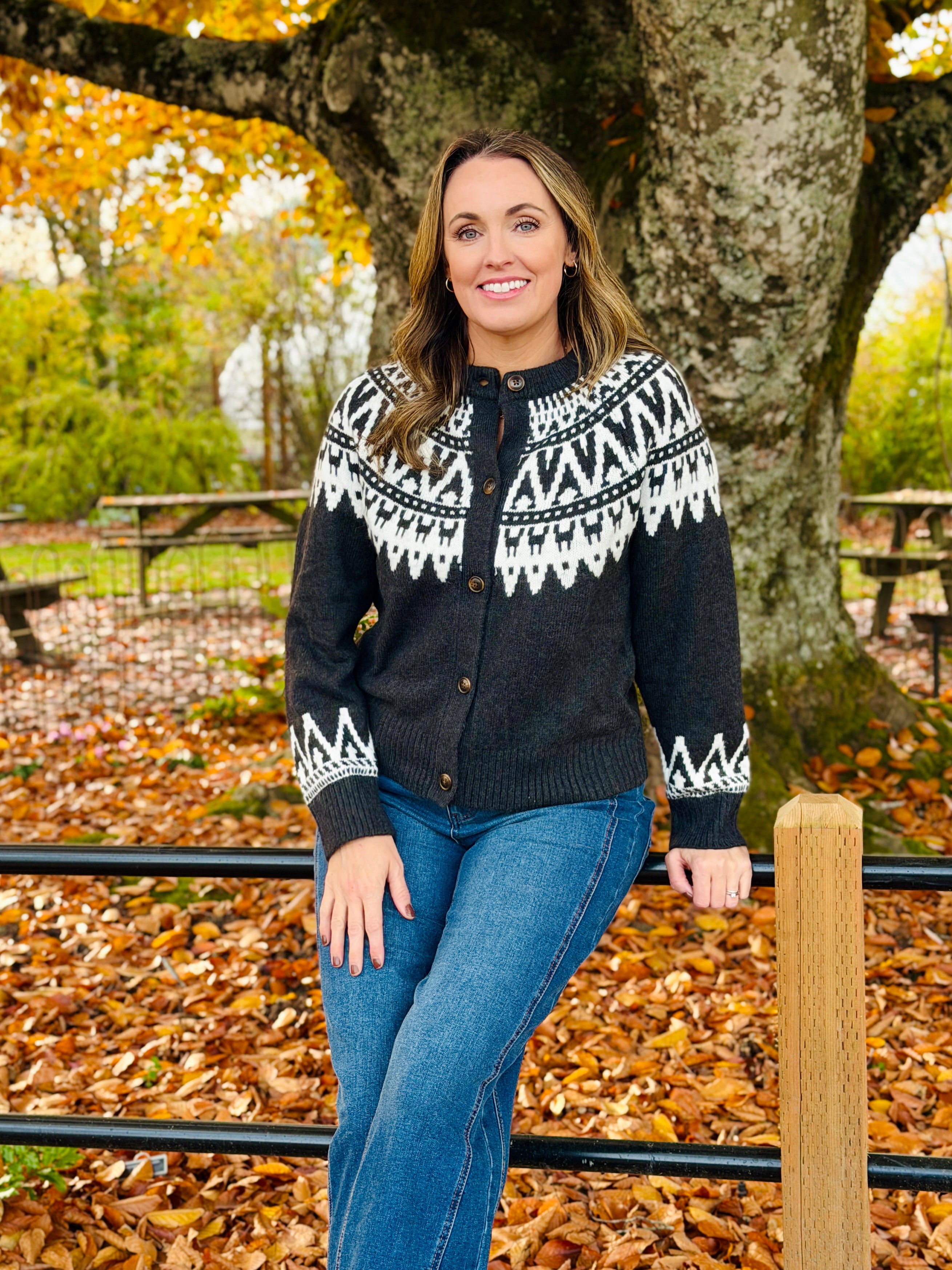This Sanctuary Fairisle Crewneck Cardi in Ink Multi features long sleeves, a full button-down front, and a crew neckline. It showcases a charming fairisle pattern on the yoke and sleeves, with medium-weight fabric and ribbed edges at the collar, cuffs, and hem. Perfectly matched with denim, it creates a warm and comfortable winter look.