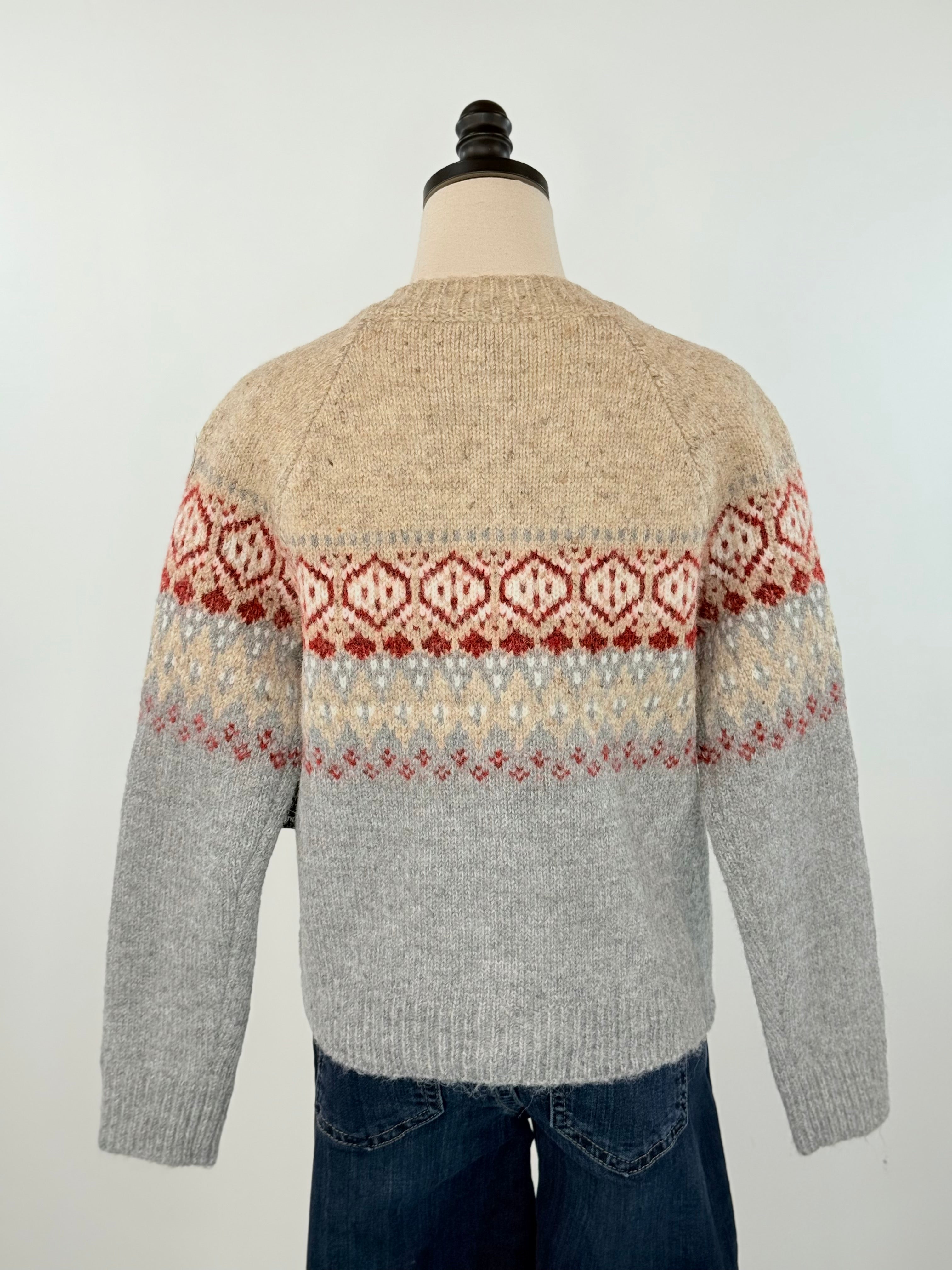 The Themis Fairisle Cardigan Sweater in Neptune features long raglan sleeves, a crew neckline, and a full button-front closure. It showcases a lovely fairisle pattern in red and white across the yoke, resting on a two-tone gray and beige base. Ribbed details at the neck, cuffs, and hem add a polished touch. Wear it open over a tee or buttoned up for versatile styling. It pairs perfectly with denim or corduroy pants for a comfortable, casual outfit.