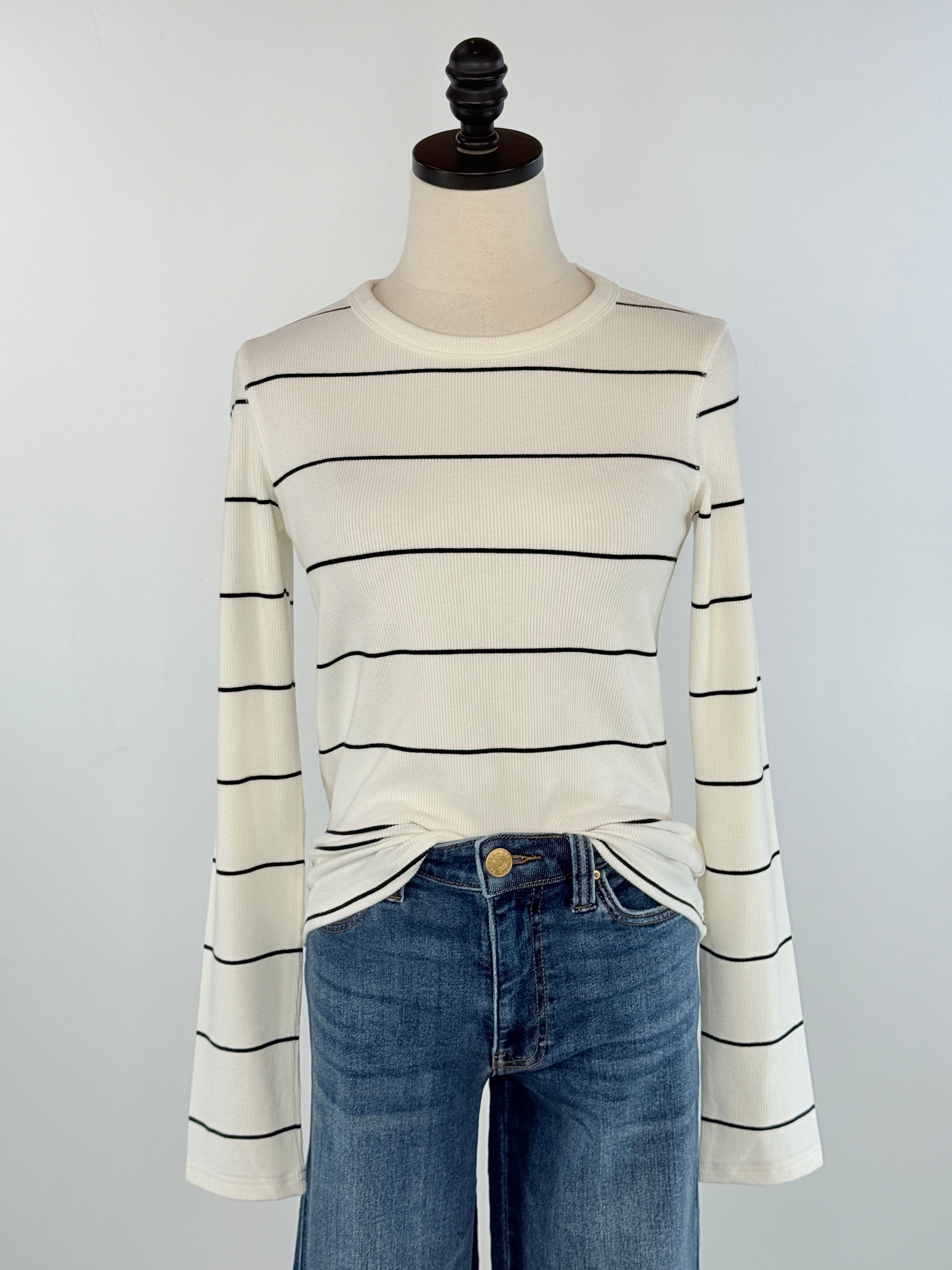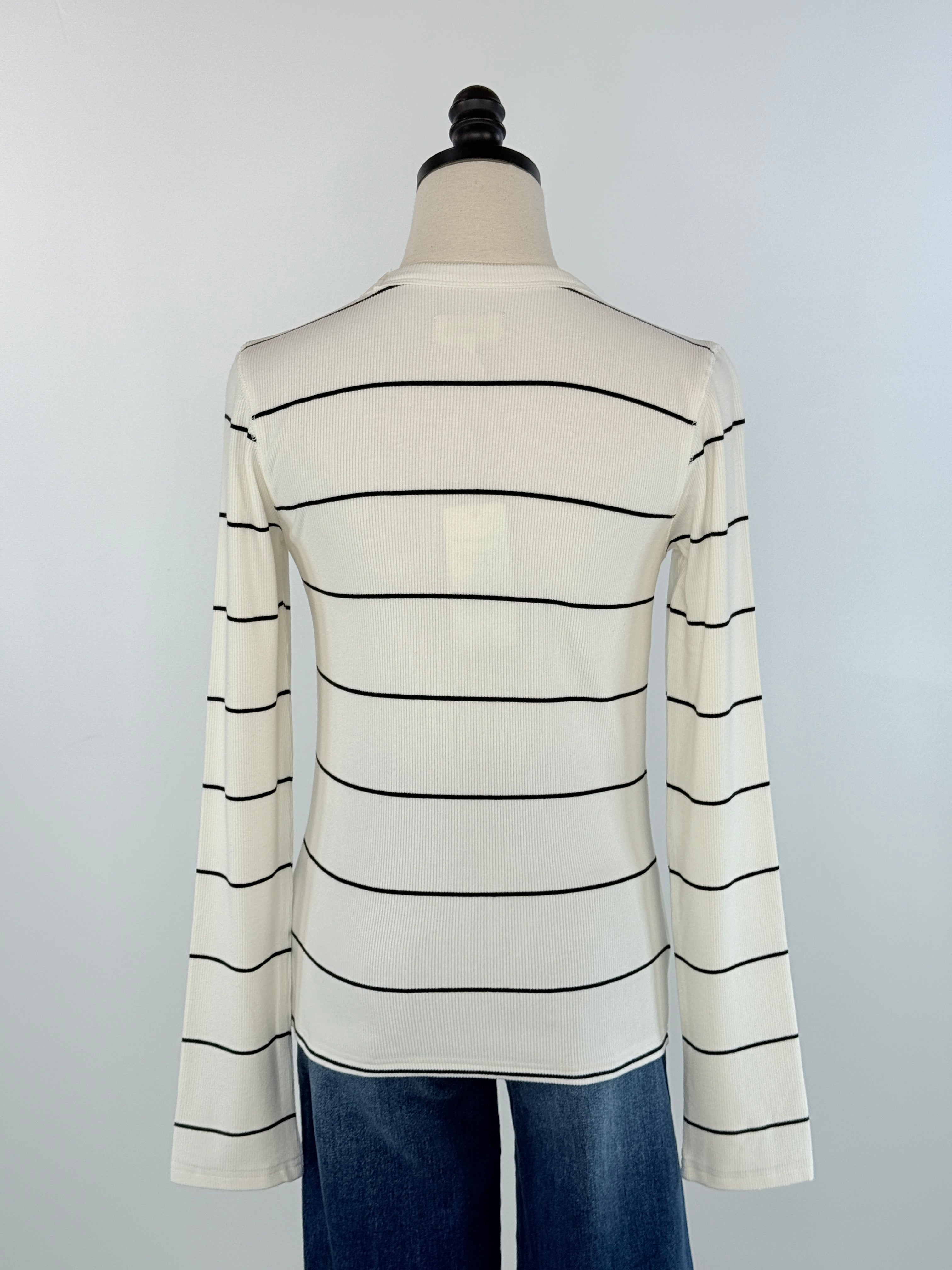 Meet your new everyday go-to Thread and Supply Alder Top in Ivory and Black Stripe, a clean, modern striped top designed for effortless layering and all-season wear. With its soft ribbed knit, classic ivory base, and sleek black horizontal stripes, this piece blends minimalist style with timeless comfort. Perfect for pairing with denim, trousers, or cozy cardigans, this long-sleeve top offers a flattering, slightly fitted silhouette that still feels easy and breathable. It’s the kind of wardrobe staple you'll reach for again and again.
