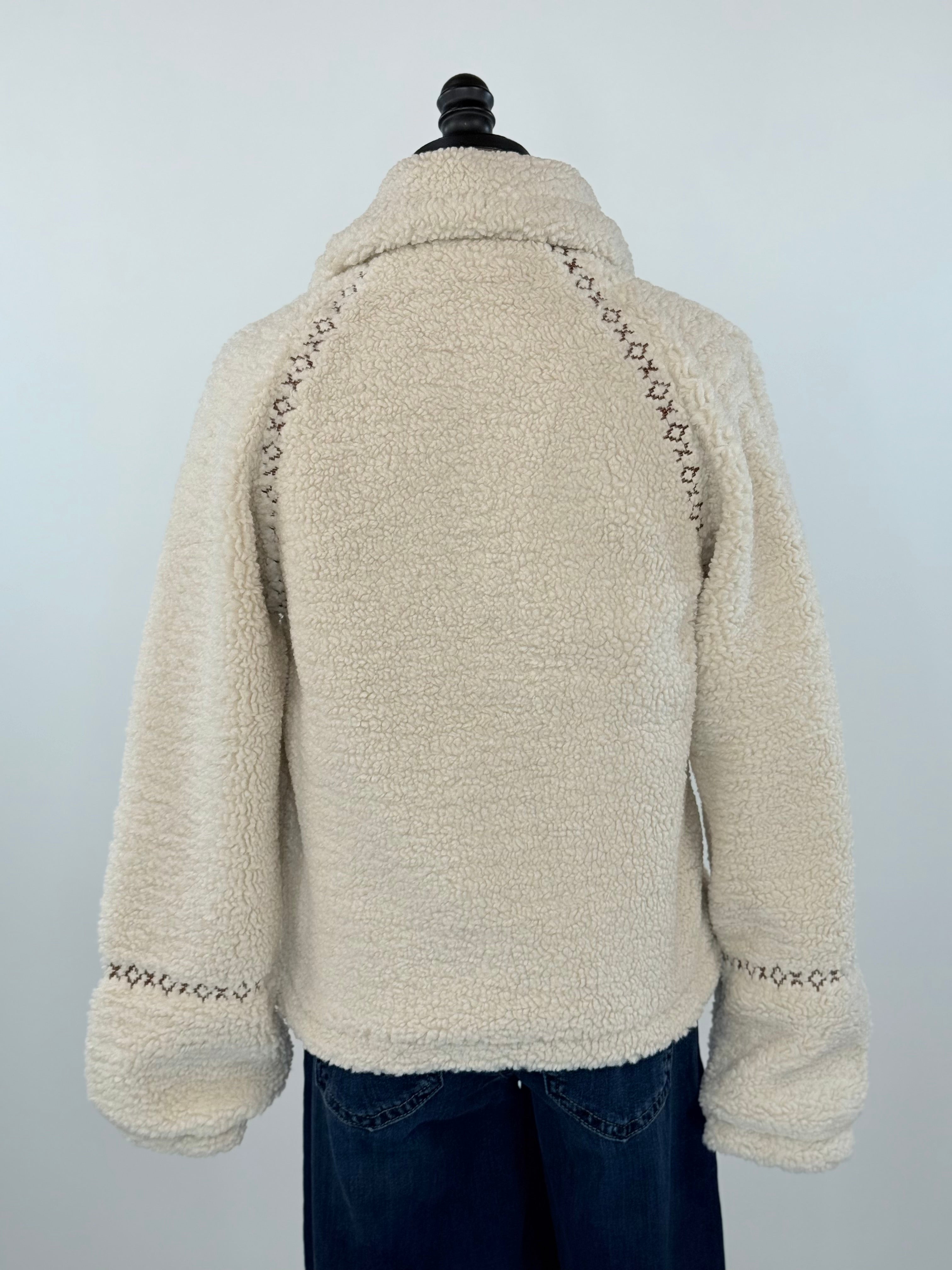 Stay warm and fuzzy in the Thread and Supply Denver Jacket in French Oak. A cozy fleece jacket featuring a full zip closure and high neckline with embroidered detailing throughout and dual side pockets. Pairs great with your favorite jeans or corduroy pants.