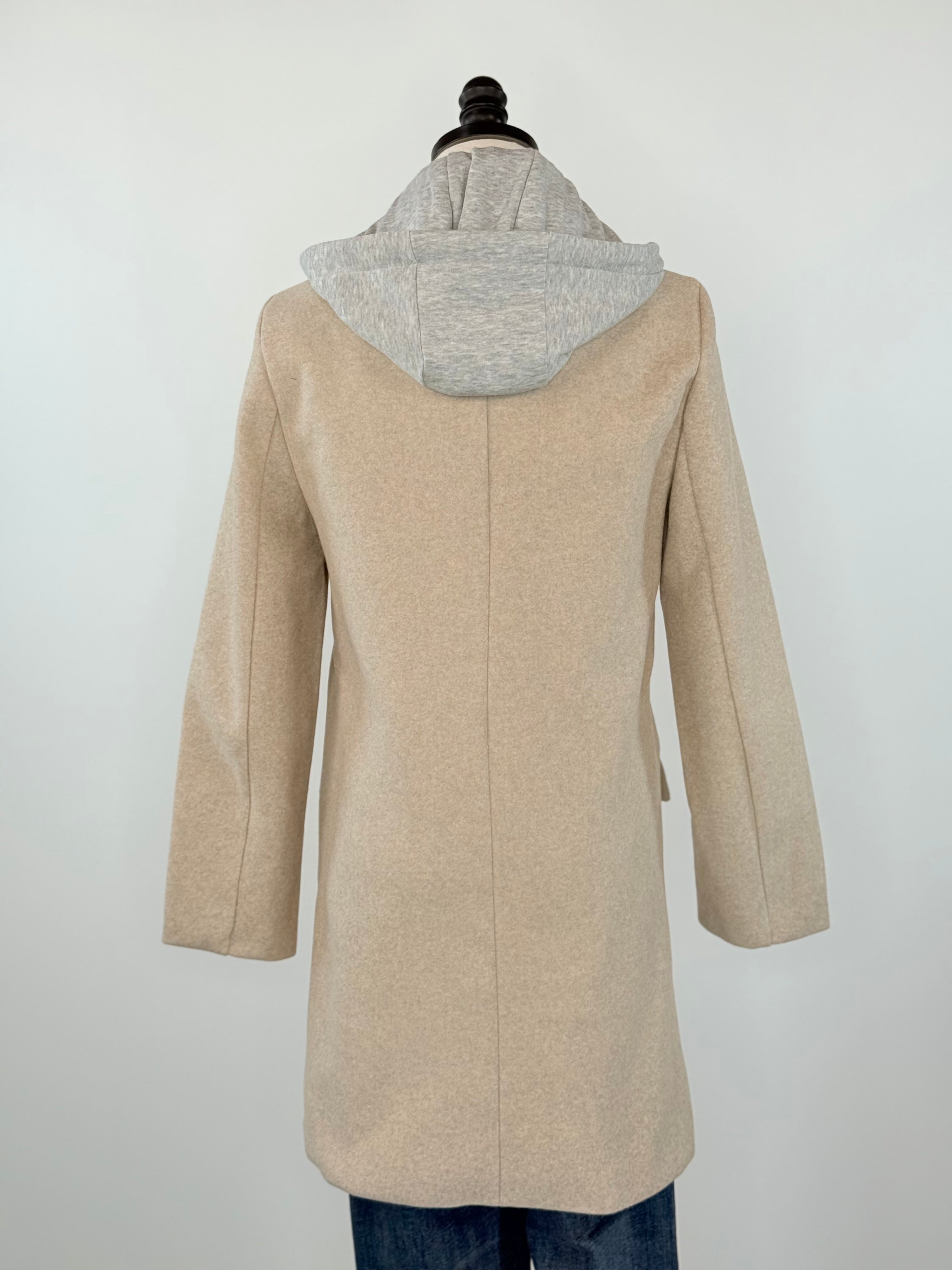 When city chic meets laid-back comfort, the Uptown Hoodie Coat in Oatmeal gives you the best of both worlds. Crafted in a soft oatmeal colored fabric and a tailored silhouette, this coat features a heather gray hoodie insert for a perfectly layered look (without the bulk). Dress it up for work or down for weekend errands Either way, you’ll look effortlessly polished. This coat’s single-button closure, structured lapels, and versatile mid-length cut make it the ultimate throw-on piece for fall through early spring.