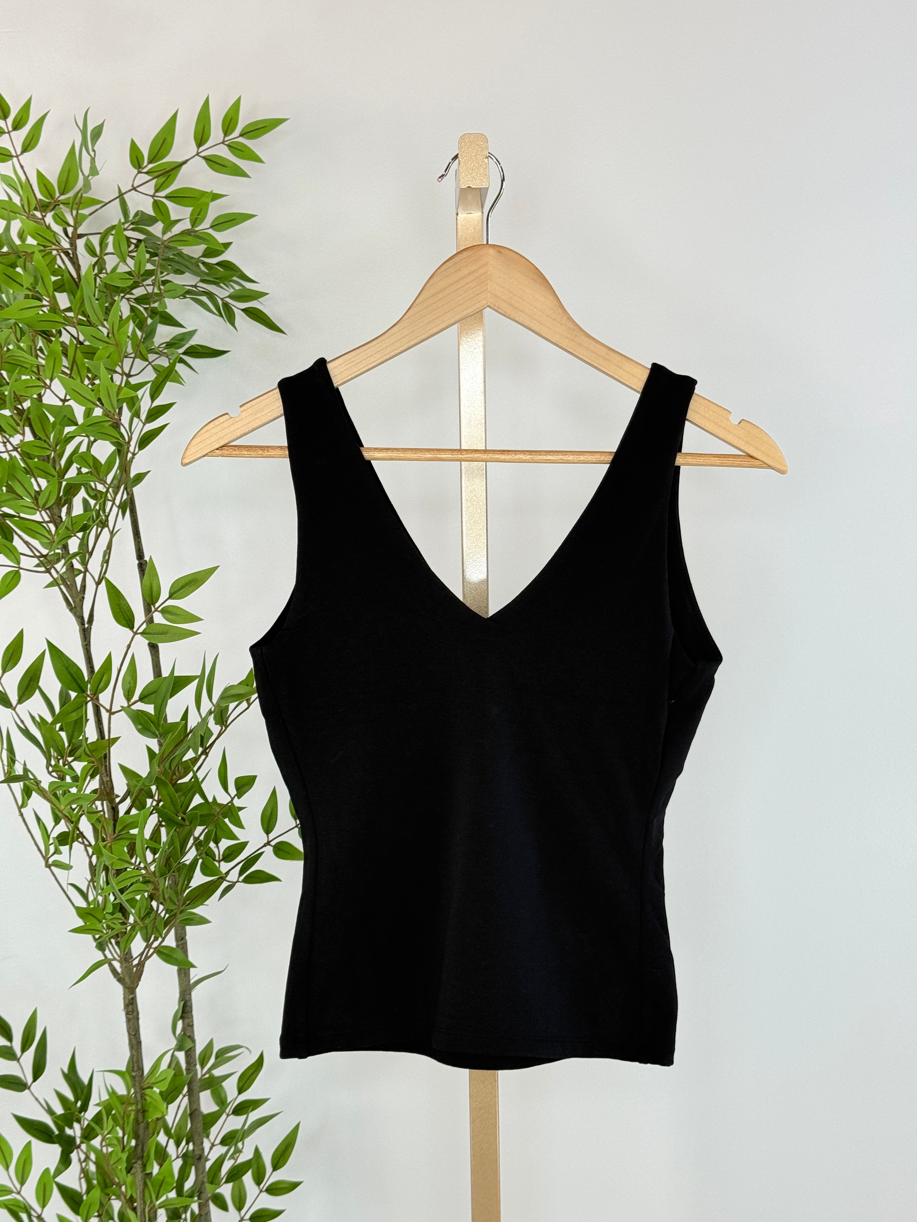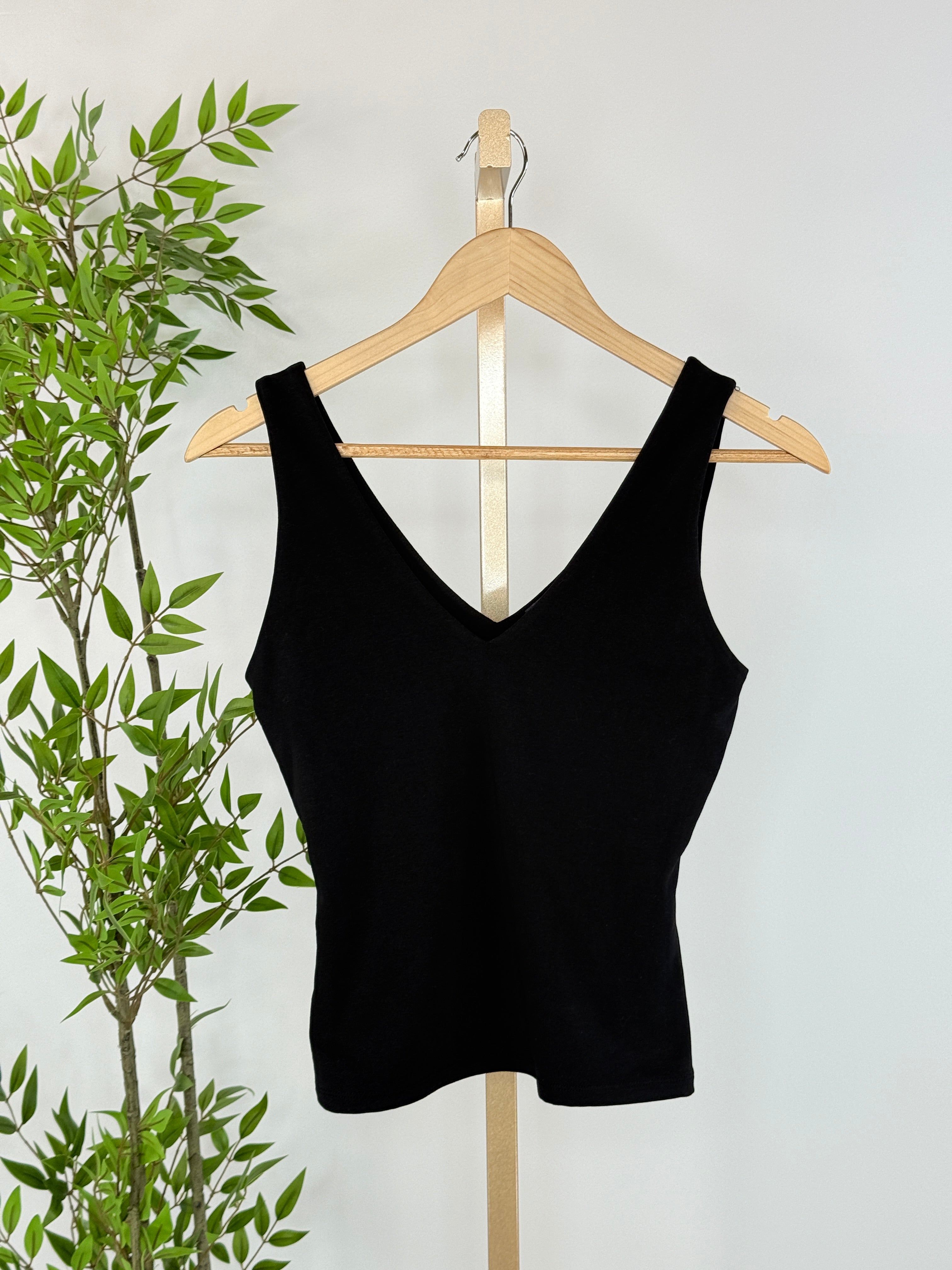 Meet the ultimate elevated essential, the Valentina Cotton Core V Neck Tank in Black. Designed with a flattering V-neckline on both the front and back, this sleek black tank creates a beautifully balanced silhouette that feels as polished as it is comfortable. The softly structured stretch fabric gently contours without feeling restrictive, making it the perfect piece to wear on its own or layered under your favorite cardigans, blazers, and jackets. The clean lines and timeless black hue make this tank endlessly versatile, ideal for everything from casual denim days to more refined, layered looks.