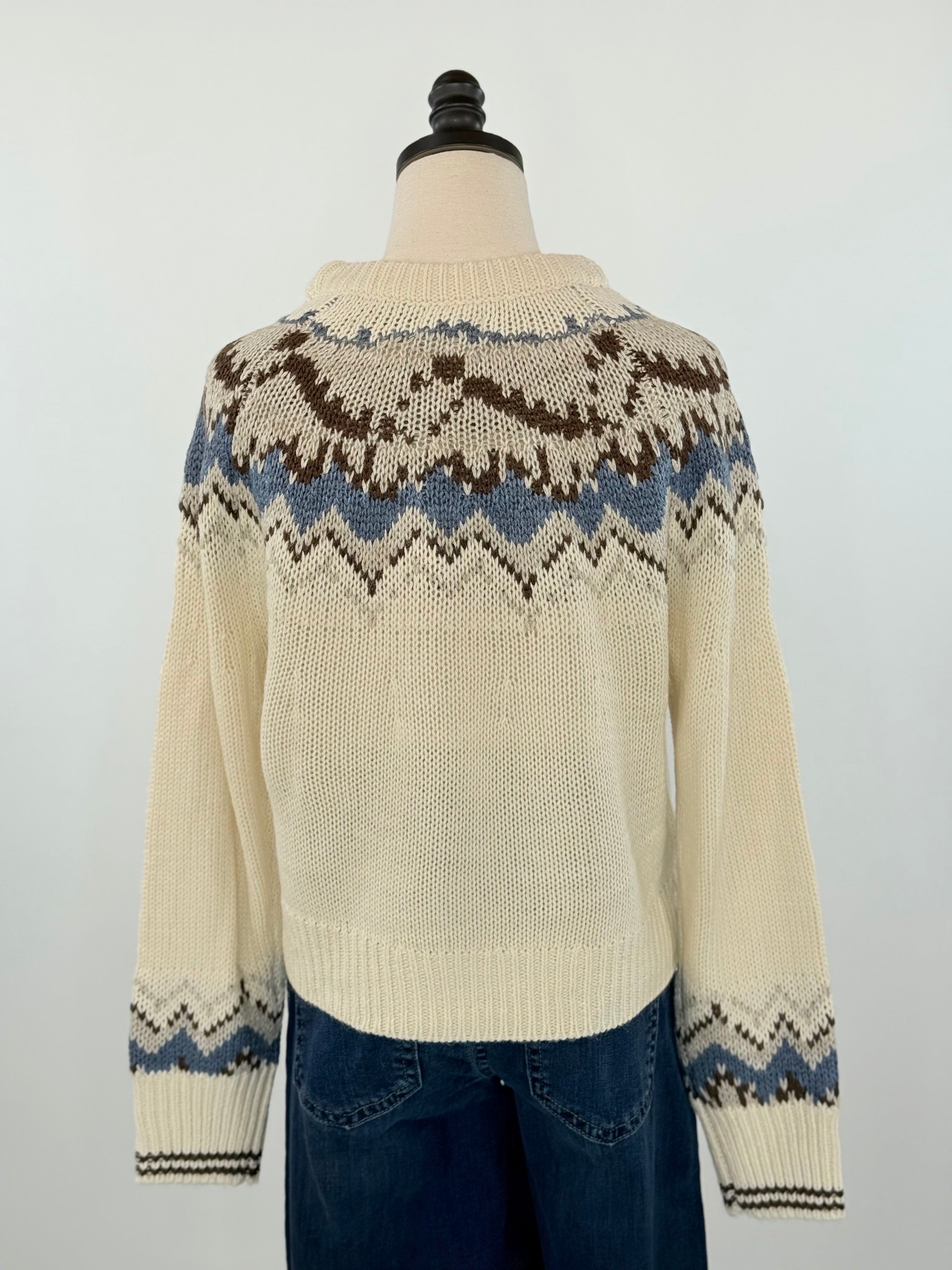Meet your new cold-weather crush Vega Sweater in Cream. This cozy crew neck knit brings a touch of timeless mountain charm to your everyday look with its classic Fair Isle pattern in soft cream, earthy brown, and misty blue tones. The relaxed fit and chunky knit texture make it perfect for layering over your favorite jeans or leggings for a laid-back, effortlessly chic vibe. Easy to style with denim or skirts