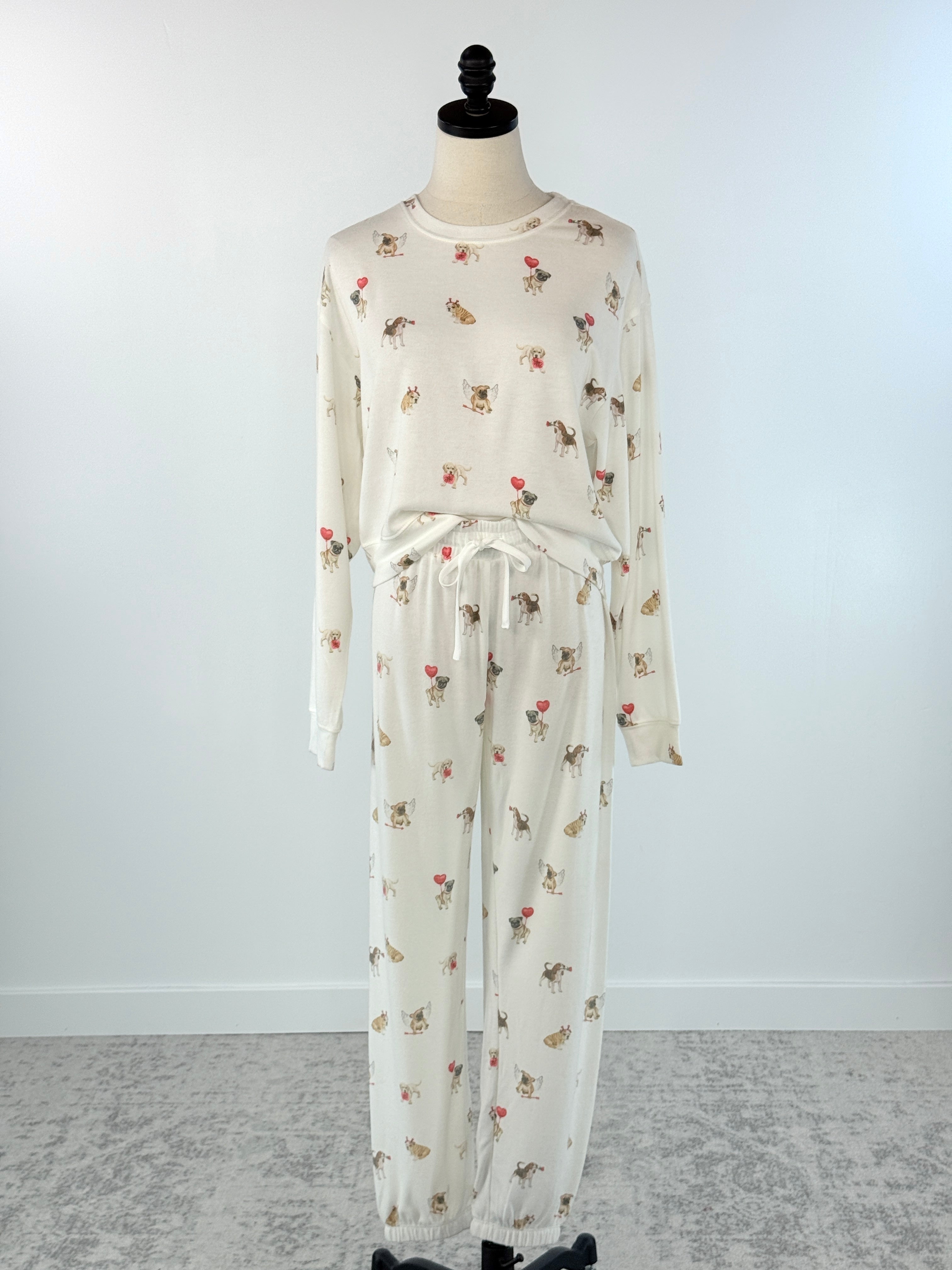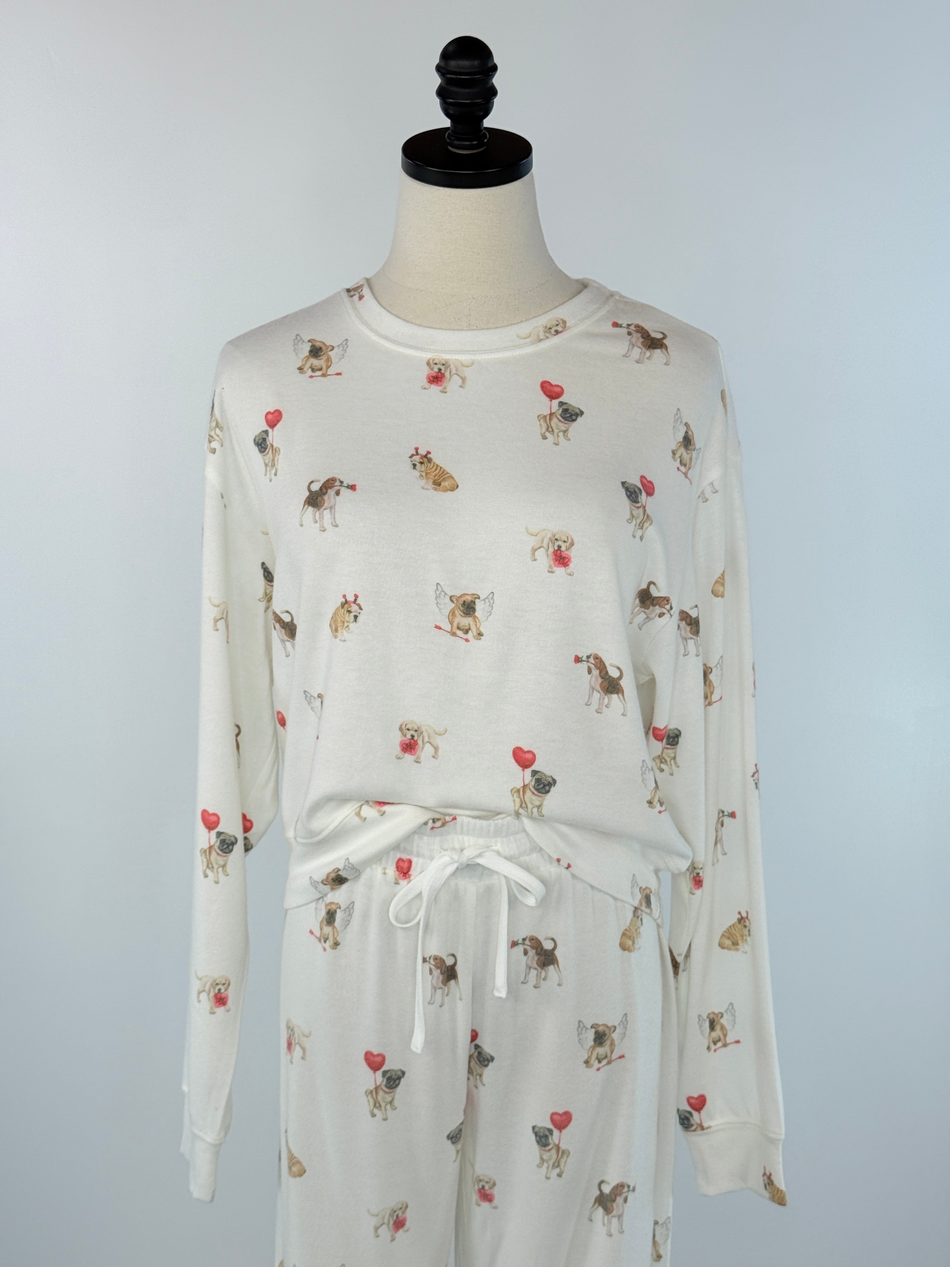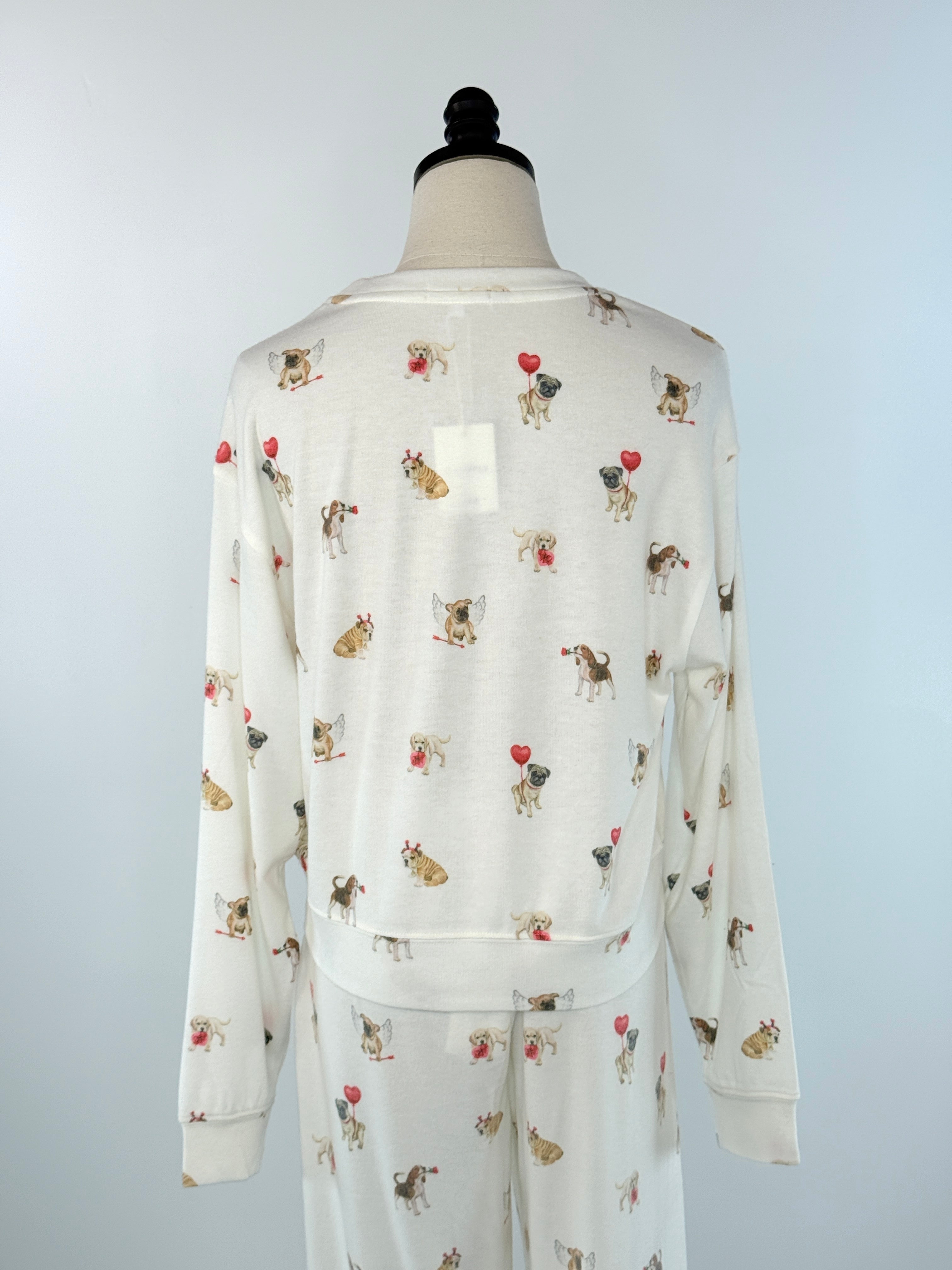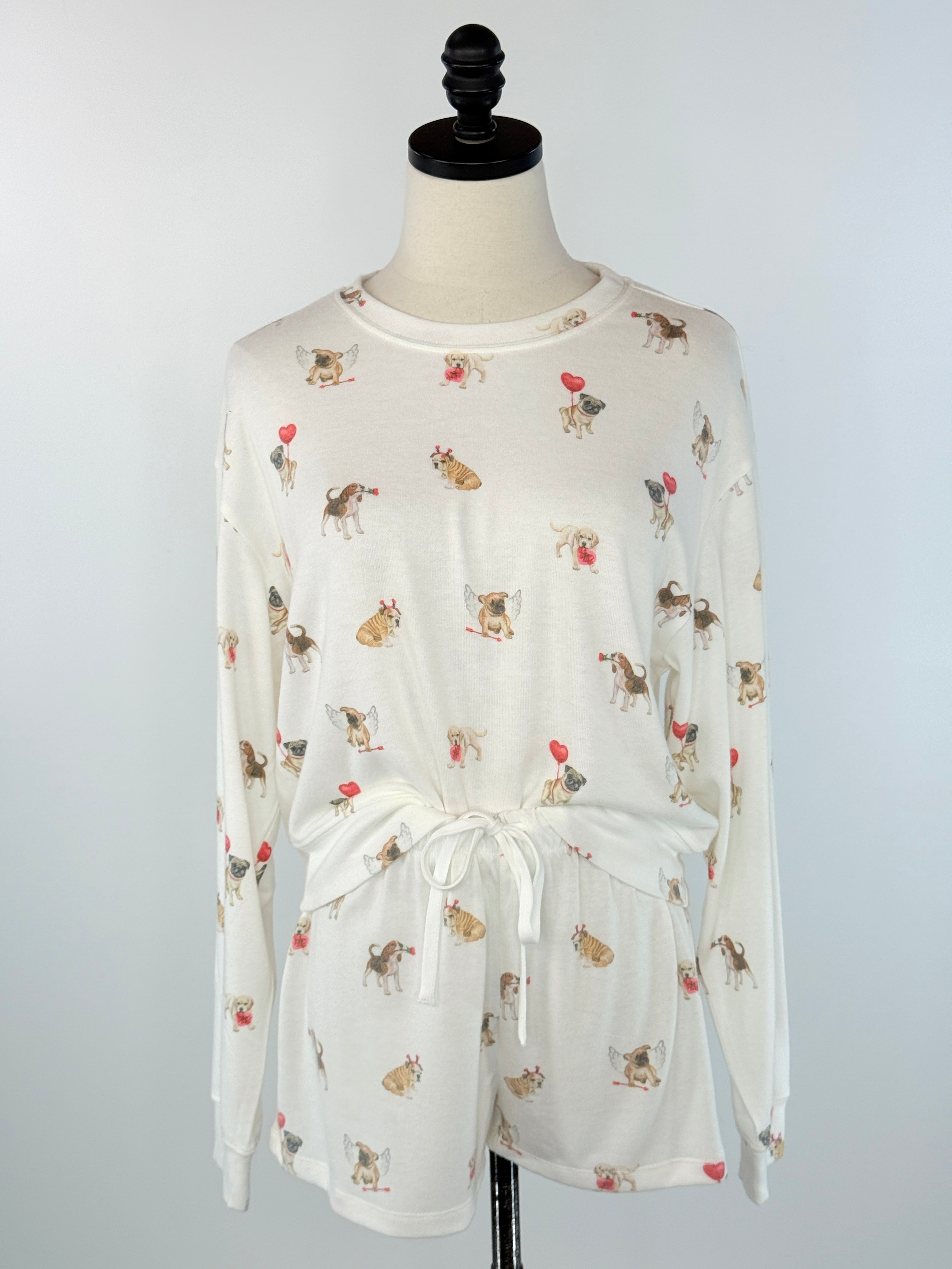Get cozy with this charming Z Supply Biscous Love Pup Top, complete with a spattering of little Valentine dogs with that brings warmth and fun to your lounging wardrobe. Crafted with a soft, inviting fabric, it features a crew neckline, long sleeves, and a relaxed silhouette that encourages you to unwind and embrace comfort. The ribbed trim adds structure while maintaining that cozy feel you crave during the colder months. Pair it effortlessly with the Z Supply Overnight Love Pup Jogger or the Z Supply Sporty Love Pup Shorts (pictured) to create a matching set that's perfect for relaxing at home.