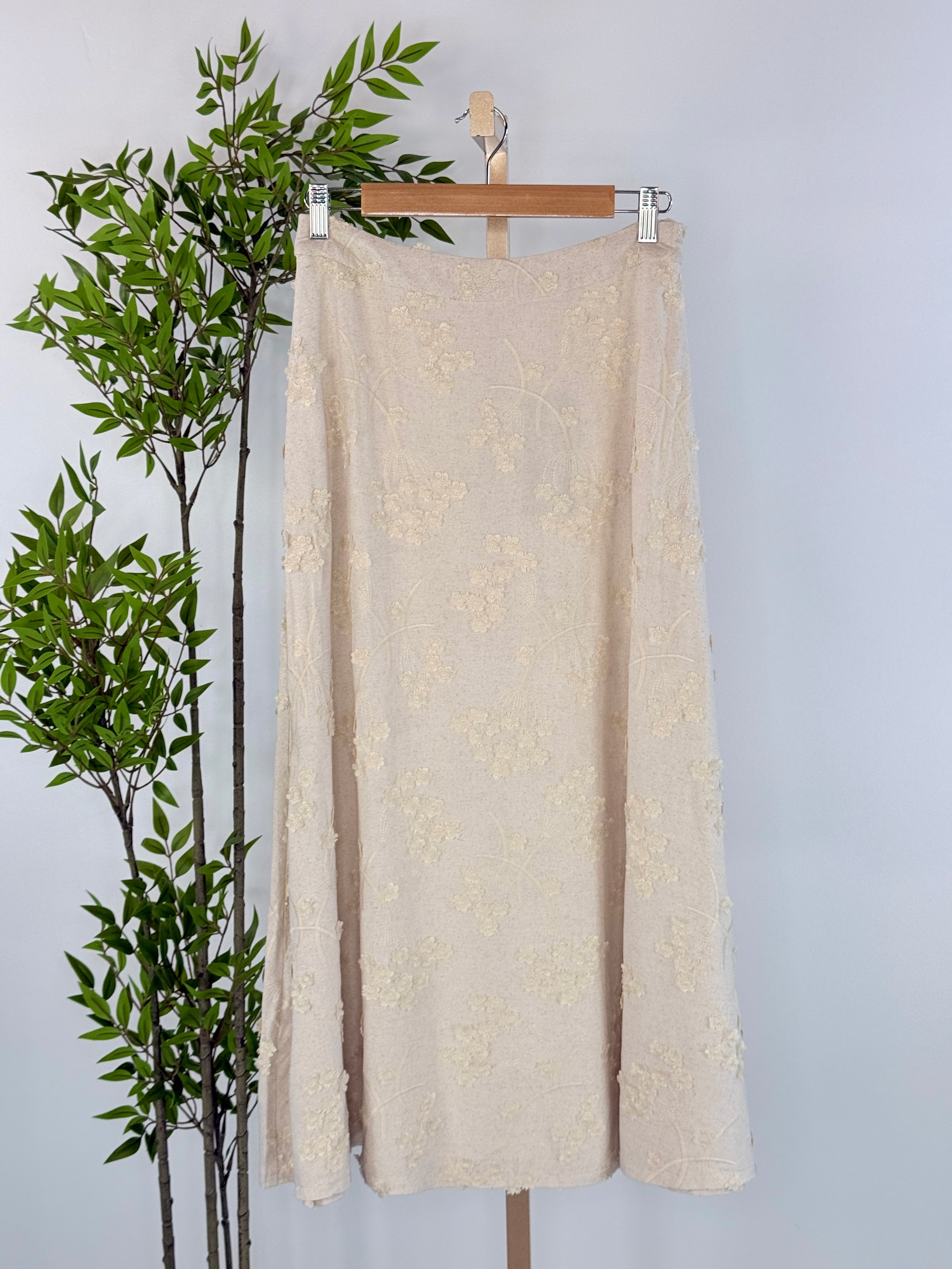 Crafted from a breathable linen blend, this midi skirt features an elegant A-line silhouette that flatters every frame. Delicate embroidered dandelions add artisanal charm, while practical side seam pockets keep your essentials close. Style it with a tucked blouse for polished sophistication or layer with a lightweight sweater for effortless warmth and texture. For a complete outfit is pairs perfectly with our Apricot Dandelion Embroidered Top in Stone (pictured).