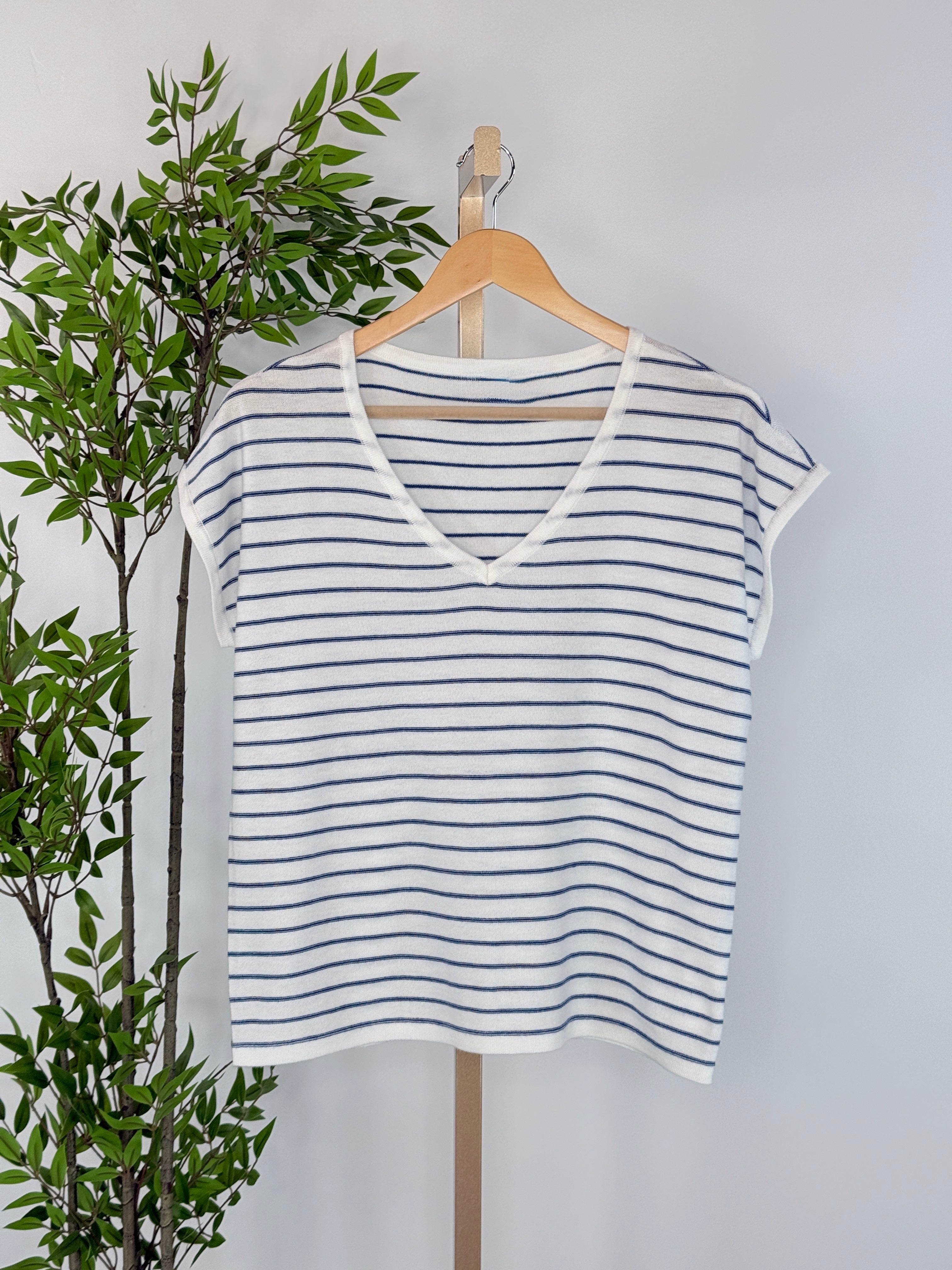 Effortless, timeless, and endlessly wearable, the Classic Line Sweater in Navy and Ivory Stripe is the elevated basic every wardrobe needs. Designed in a soft ivory knit with thin navy stripes, this piece blends clean lines with an easy silhouette for that perfectly put-together look. The flattering v-neckline adds a feminine touch, while the relaxed cap sleeves create a comfortable, laid-back feel. Crafted in a lightweight knit, this top offers breathable softness that transitions beautifully from season to season. The straight hem and easy drape make it ideal for pairing with denim, tailored trousers, or layered under a blazer for a polished finish.
