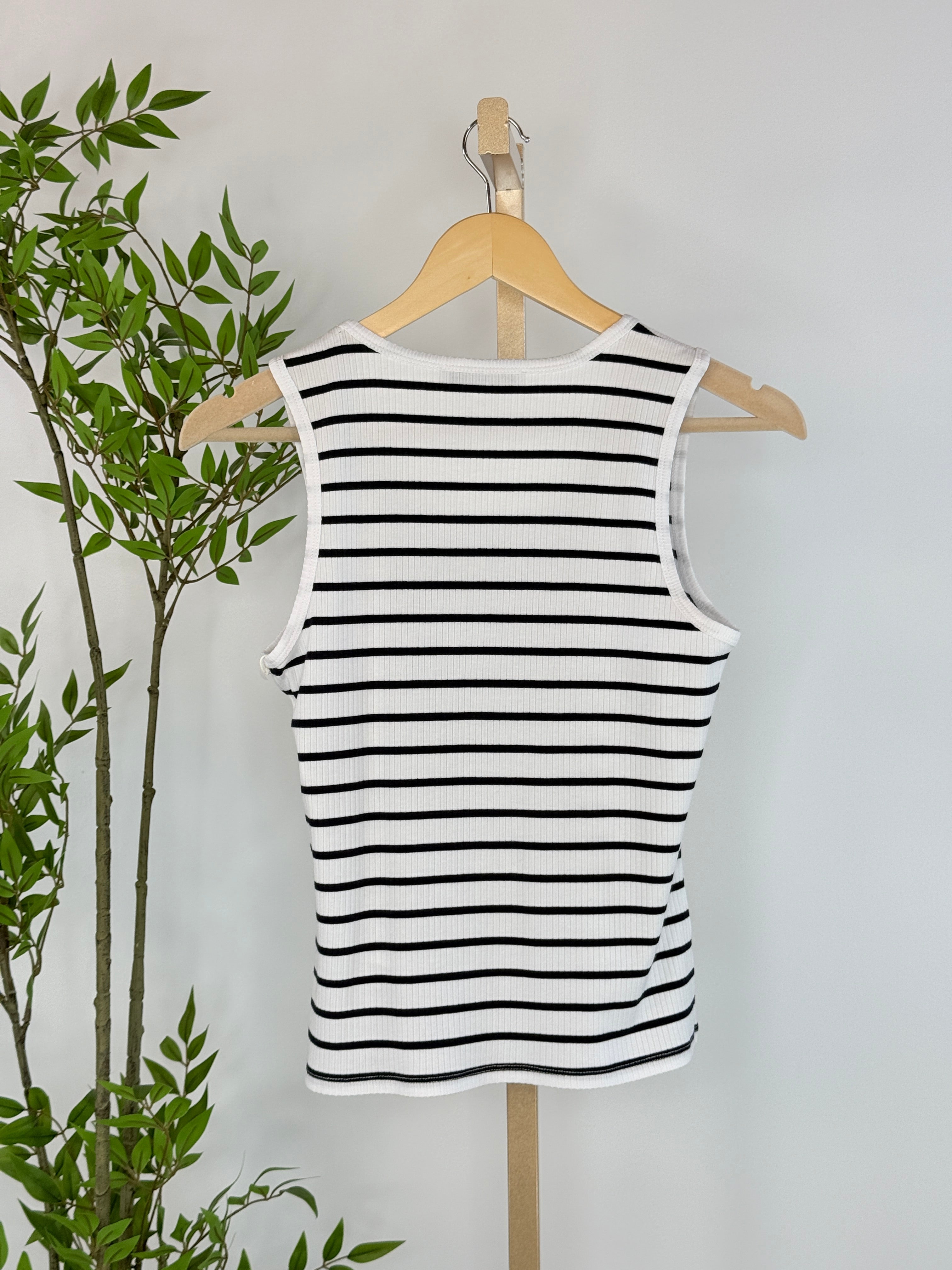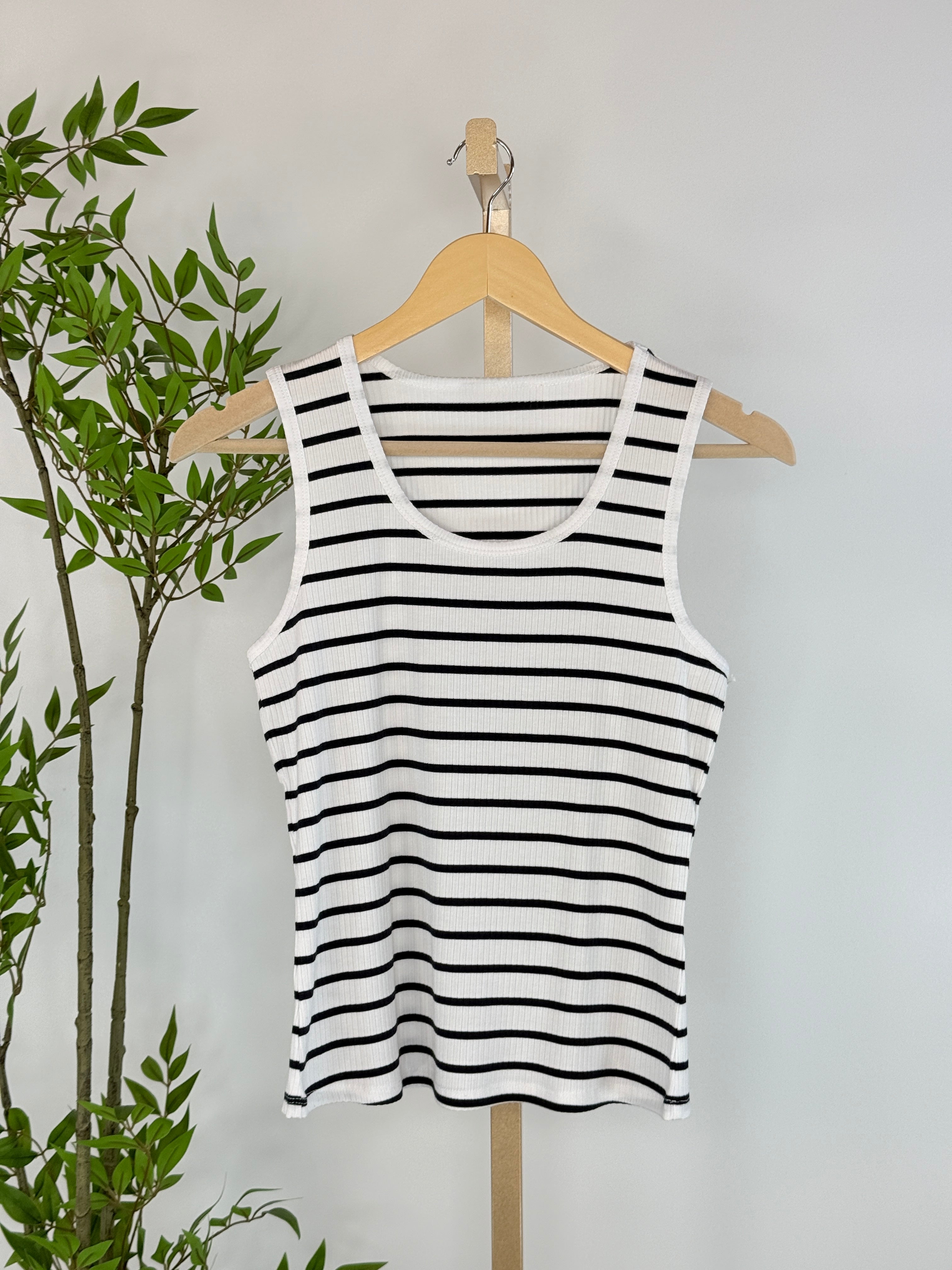 Meet the tank you’ll build outfits around. The Dex Ribbed Tank in Marine/White Stripe is a timeless staple designed with a flattering ribbed texture and classic Navy-and-white stripes that never go out of style. The sleeveless cut and soft stretch fabric make it perfect for layering or wearing on its own when the weather warms up. With a comfortable scoop neckline and an easy, close-to-the-body fit, this tank feels polished yet relaxed, ideal for everyday wear. Pair it with denim, trousers, or skirts, or layer it under jackets and cardigans for effortless year-round styling.