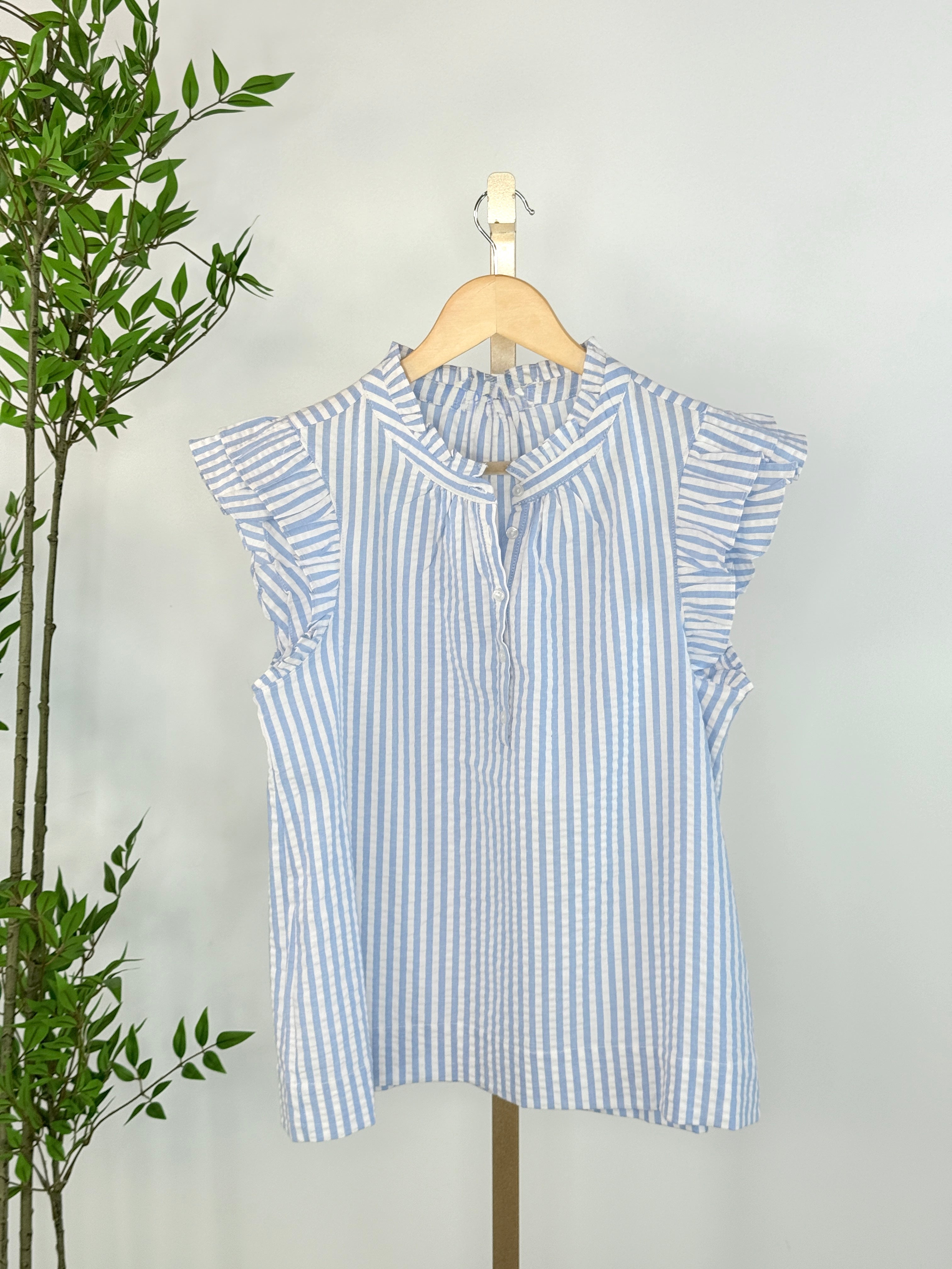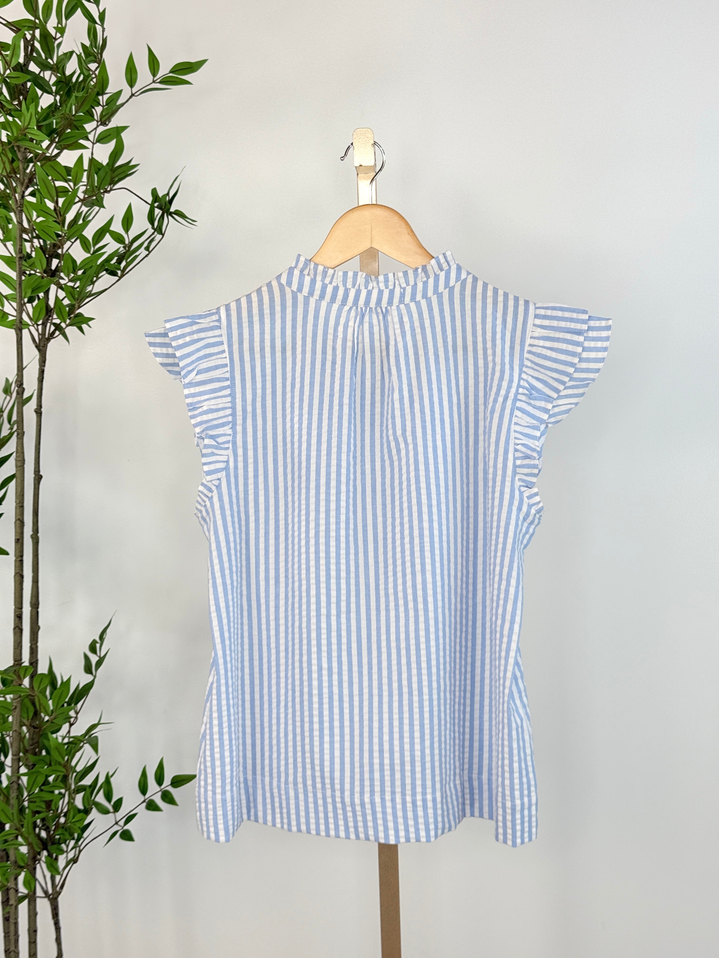Fresh, feminine, and effortlessly polished, the Florence Ruffle Blouse in Sky Blue Stripe is the perfect piece for sunny days and easy styling. Featuring a timeless striped pattern, flutter ruffle sleeves, and a delicate button-front neckline, this lightweight top blends classic charm with modern comfort. The relaxed silhouette makes it easy to wear tucked, untucked, or layered under your favorite cardigan or blazer.
