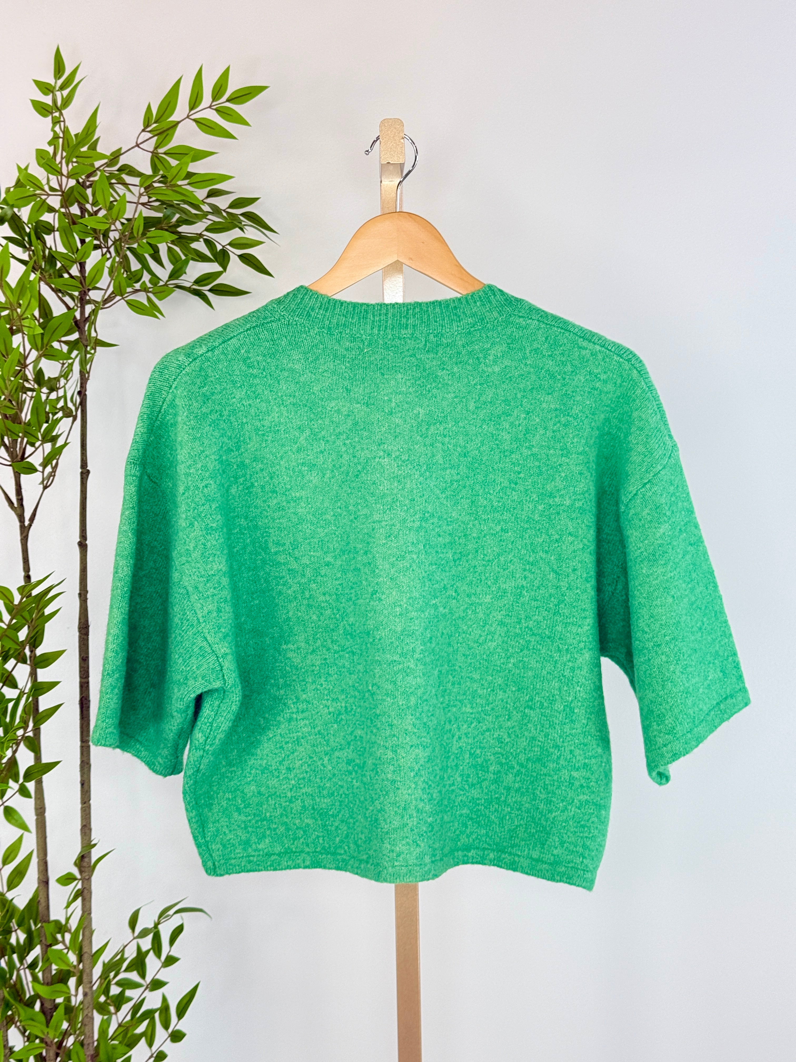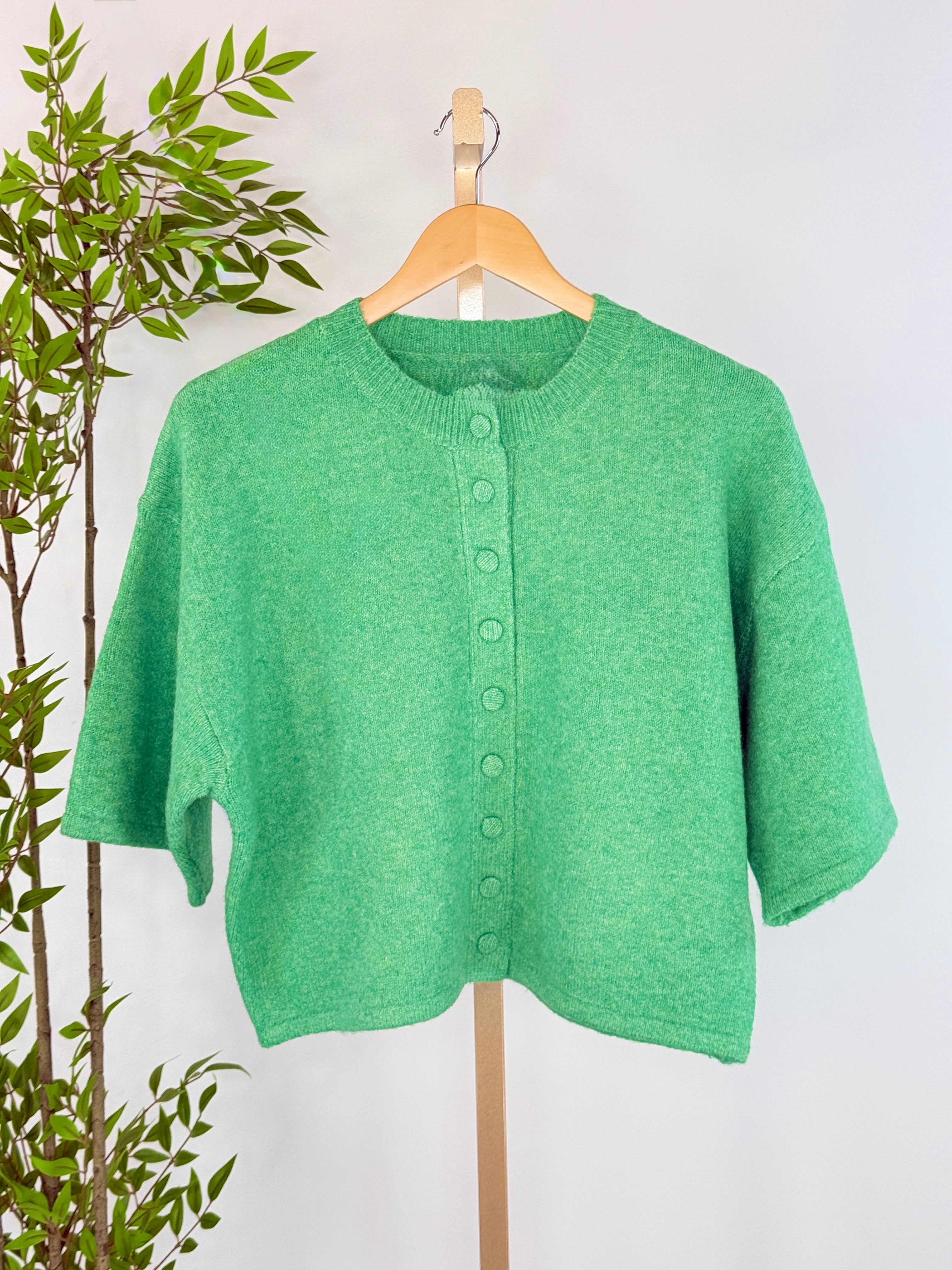 Brighten your everyday wardrobe with the Greenlight Button-Up Cardigan. A fresh, feel-good layer designed to stand out while staying effortlessly wearable. Crafted in a vibrant green hue, this short-sleeve sweater features a clean crew neckline and a row of tonal buttons down the front for subtle, thoughtful detail. The soft knit fabric offers a comfortable drape with just enough structure, while the slightly crop silhouette makes it perfect for pairing with high-rise denim, trousers, or skirts.
