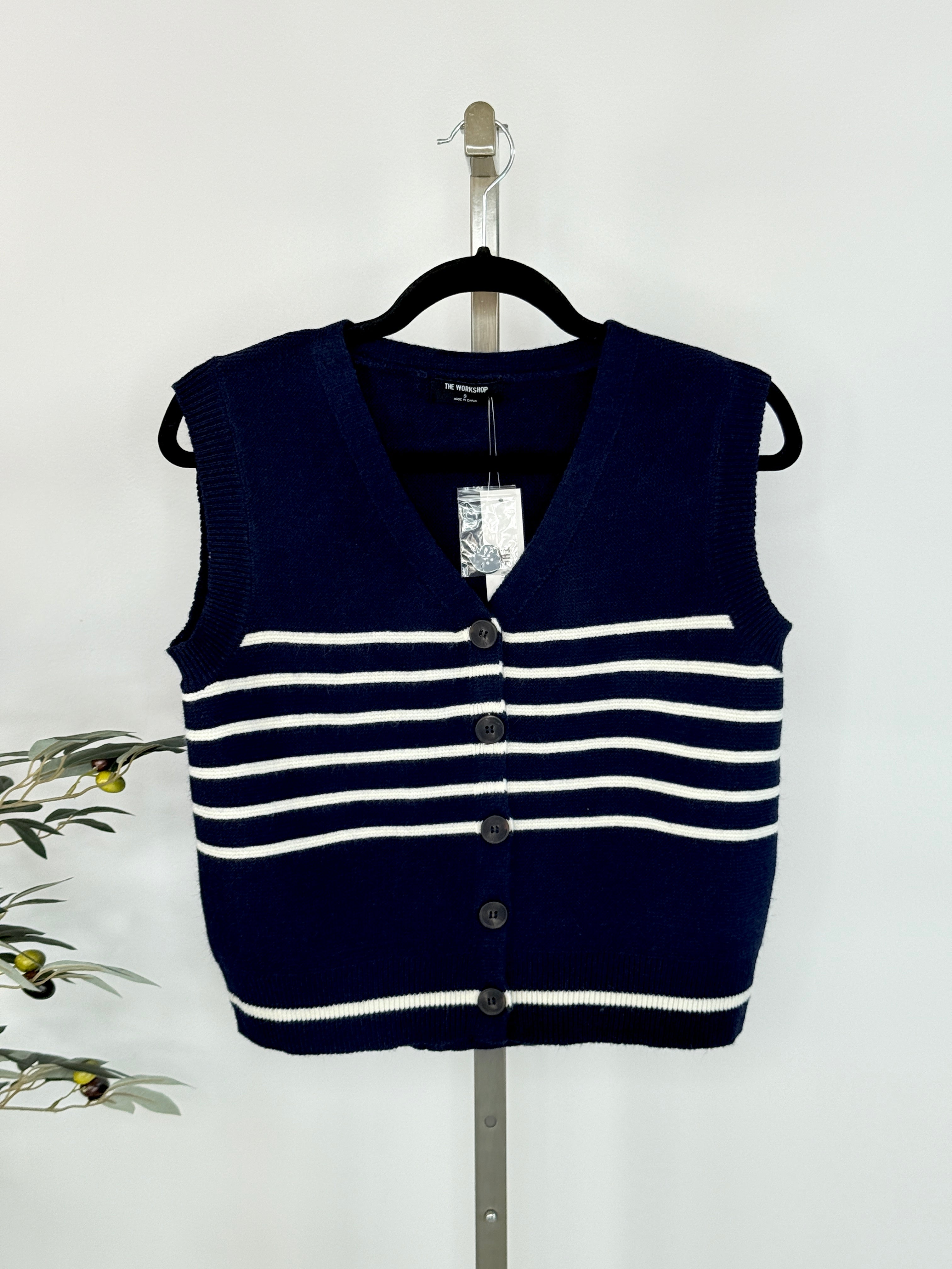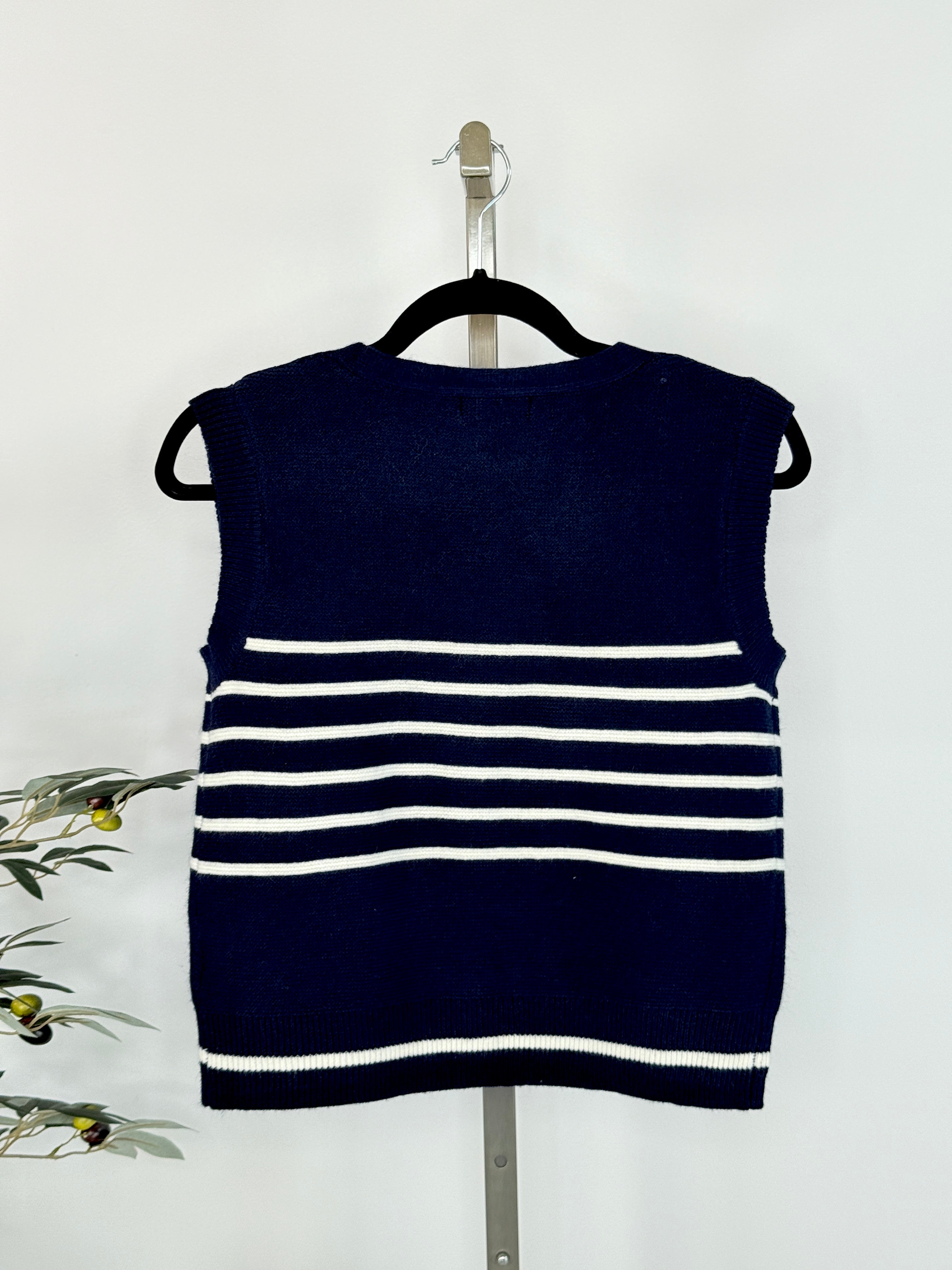 Add a timeless layer to your wardrobe with the Harbor Stripe Knit Vest in Navy and White. A chic nod to classic coastal style with an easy, modern twist. Designed for effortless layering, this sleeveless knit features a deep navy base accented with crisp white horizontal stripes and a flattering button-front silhouette. Perfect worn solo over a simple tee or layered over a blouse, this versatile knit vest transitions seamlessly from casual daytime looks to polished, put-together outfits. The soft, comfortable knit makes it ideal for year-round styling, whether paired with denim, tailored trousers, or a flowing skirt.