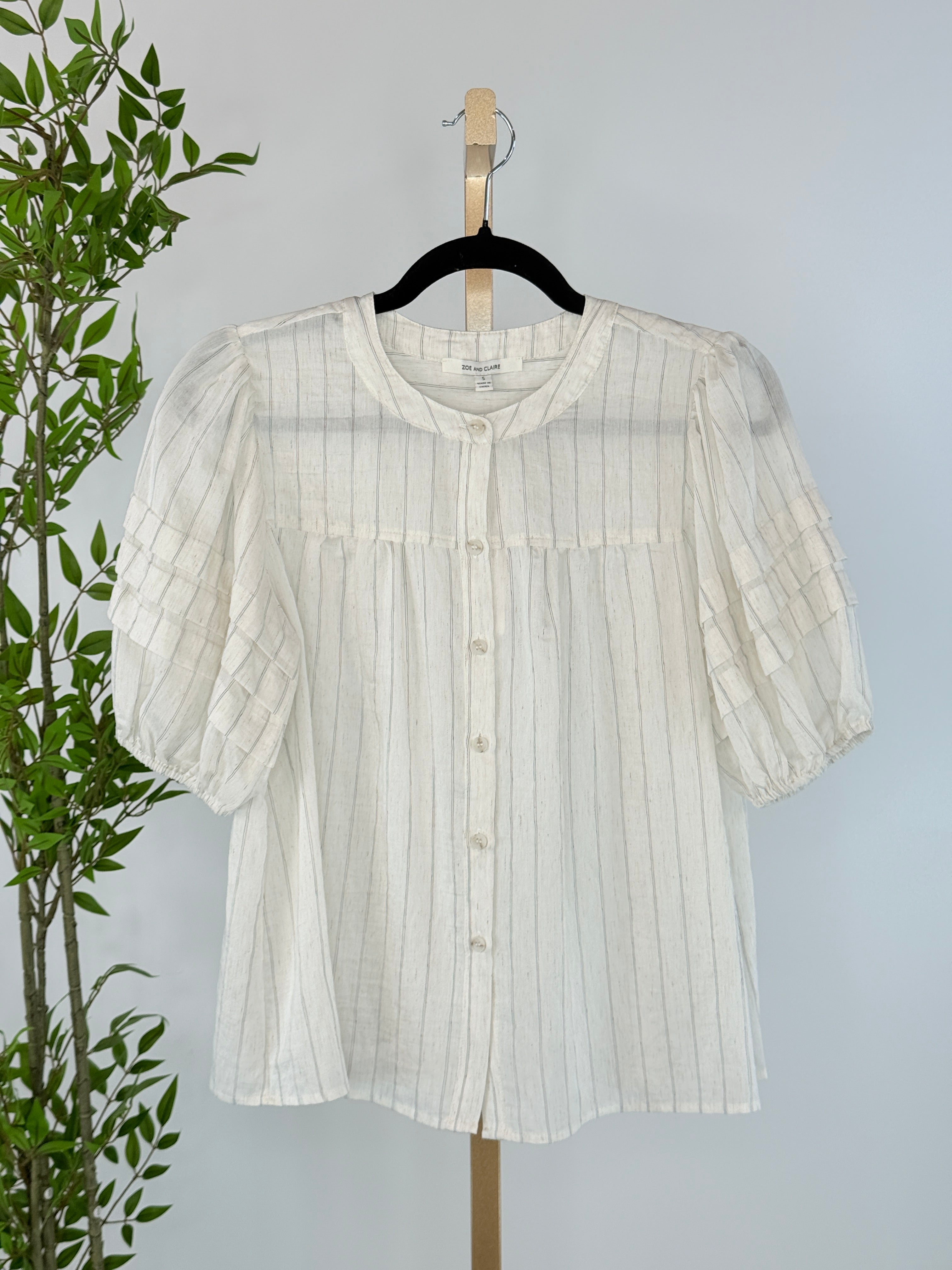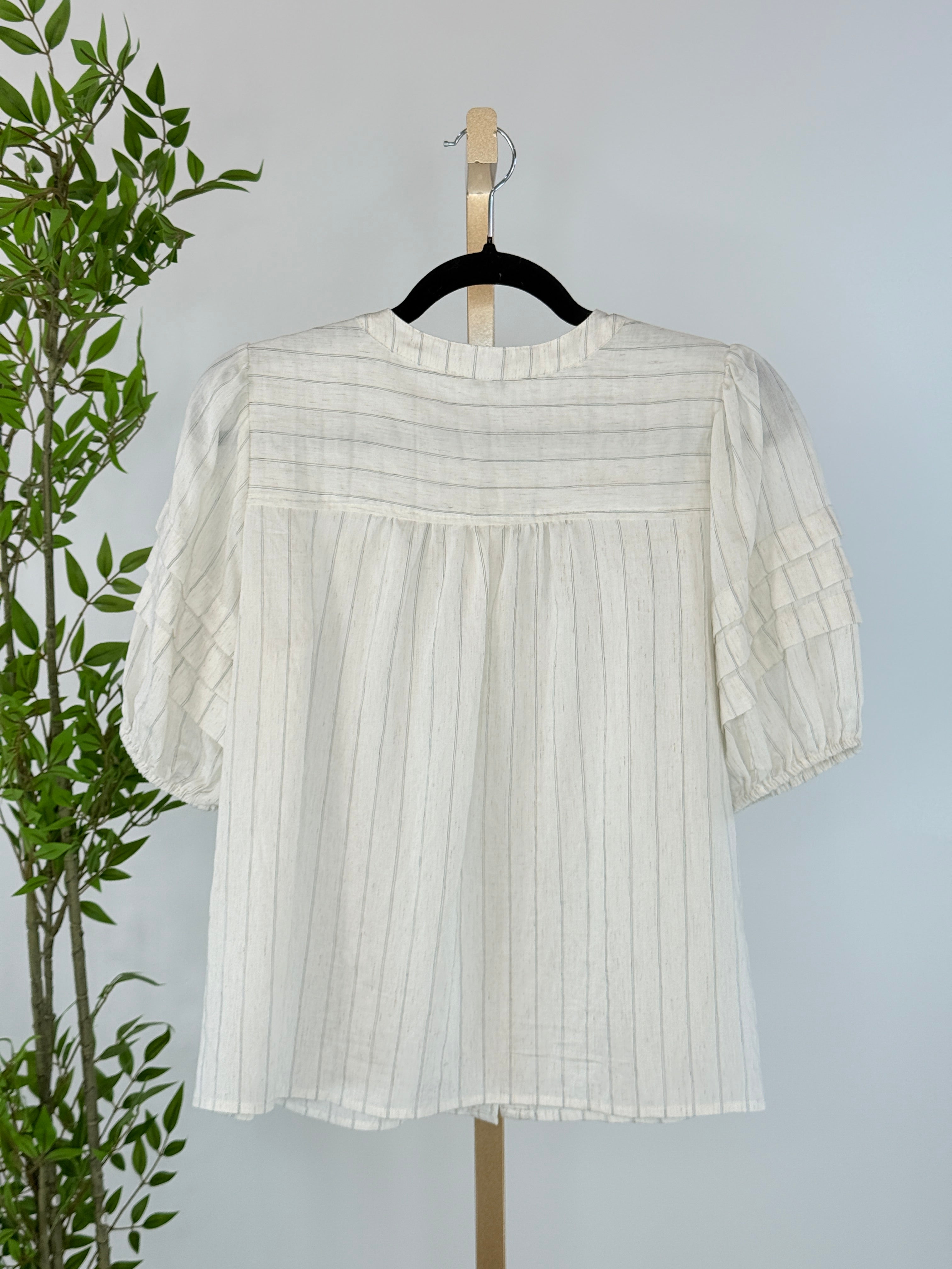 Soft, timeless, and beautifully detailed, the Heirloom Stripe Blouse in Oatmeal is a romantic everyday piece designed to feel both effortless and special. Crafted in a lightweight oatmeal fabric with subtle vertical pinstripes, this blouse brings gentle texture and vintage-inspired charm to your wardrobe. Featuring feminine puff sleeves with delicate tiered detailing, a softly gathered yoke, and a classic button-front closure, this blouse drapes easily for a relaxed yet polished silhouette. Pairs well with denim or dress pants.