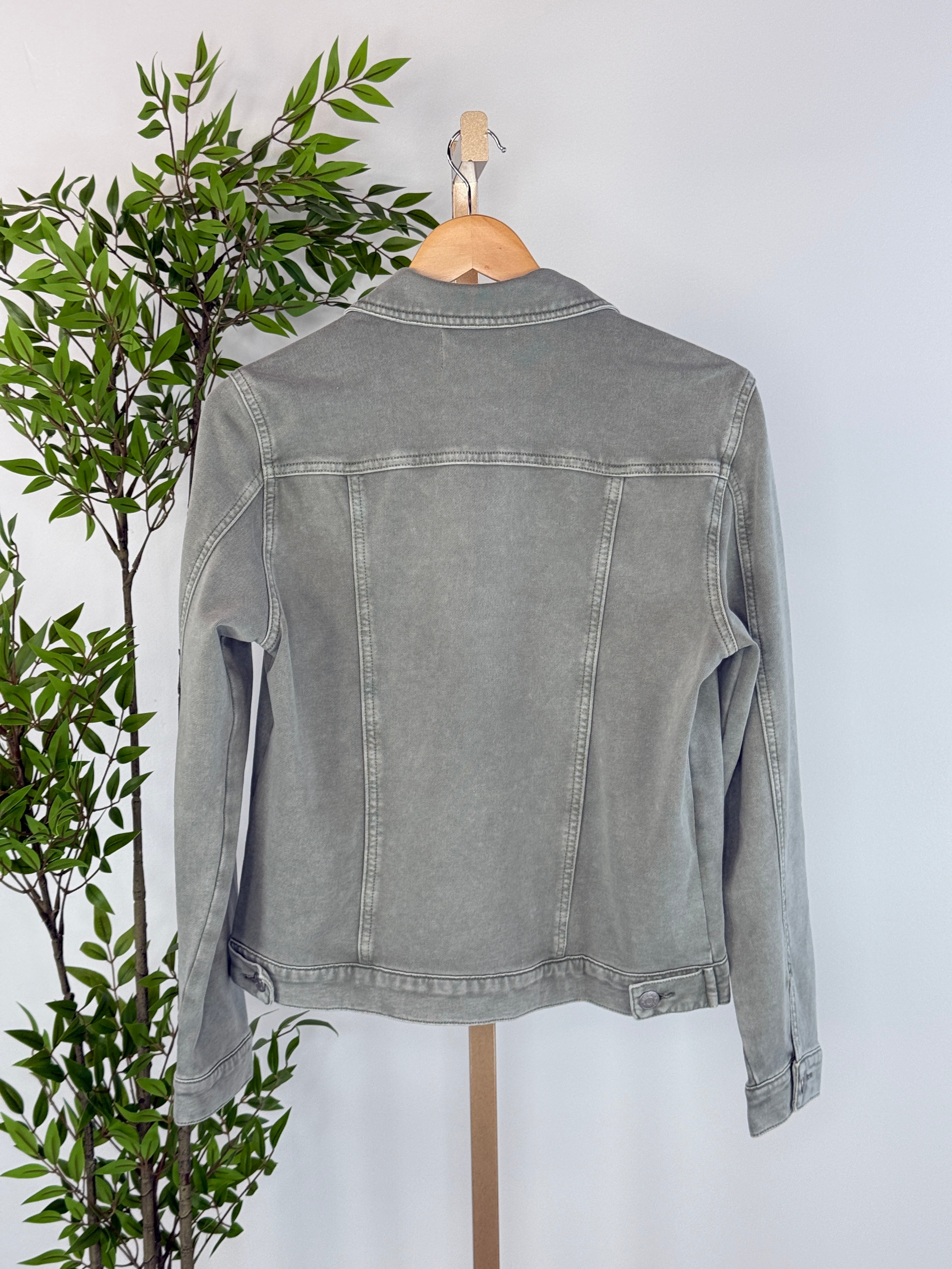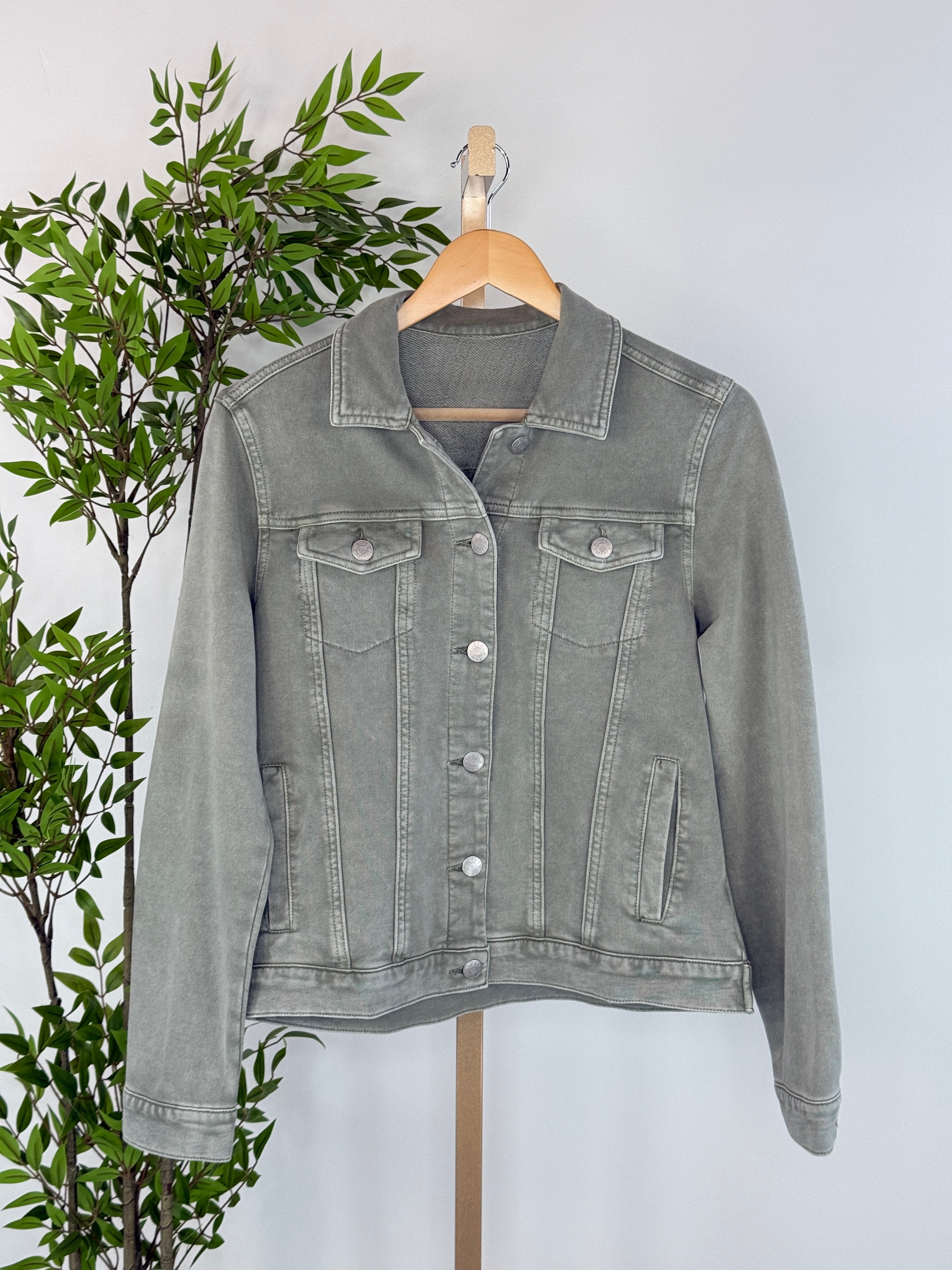 A timeless layer with a modern edge, the Jessy Trucker Jacket in Fern is the effortless staple every wardrobe needs. Designed in a soft, washed olive tone, this classic button-front jacket adds just the right amount of structure while keeping your look relaxed and versatile. Featuring front chest pockets, silver-tone button closures, tailored seam detailing, and a flattering fitted silhouette, this piece blends everyday ease with polished style. The slightly lived-in wash gives it that perfectly broken-in feel, making it ideal for layering over dresses, lightweight knits, or your favorite graphic tee.