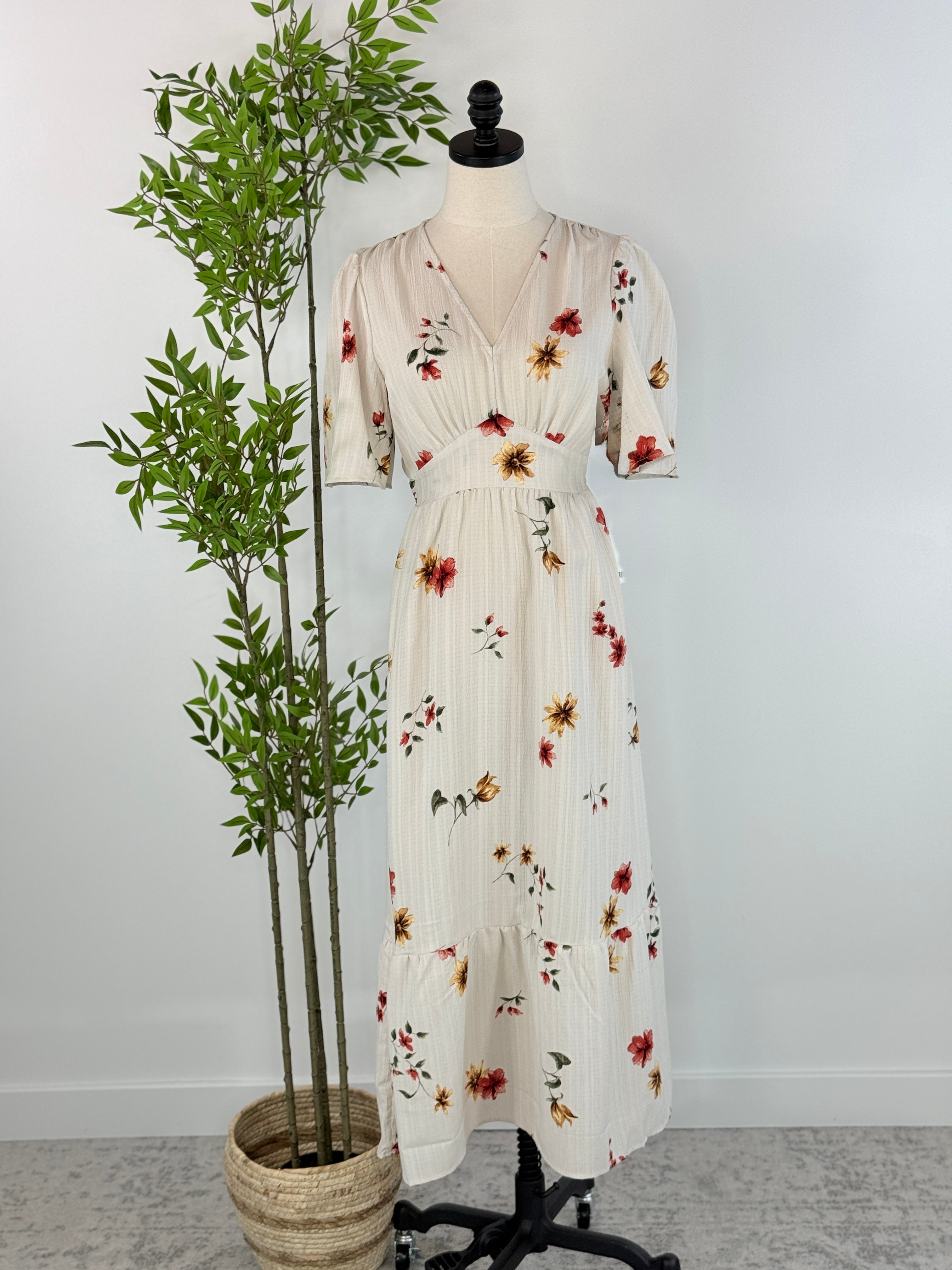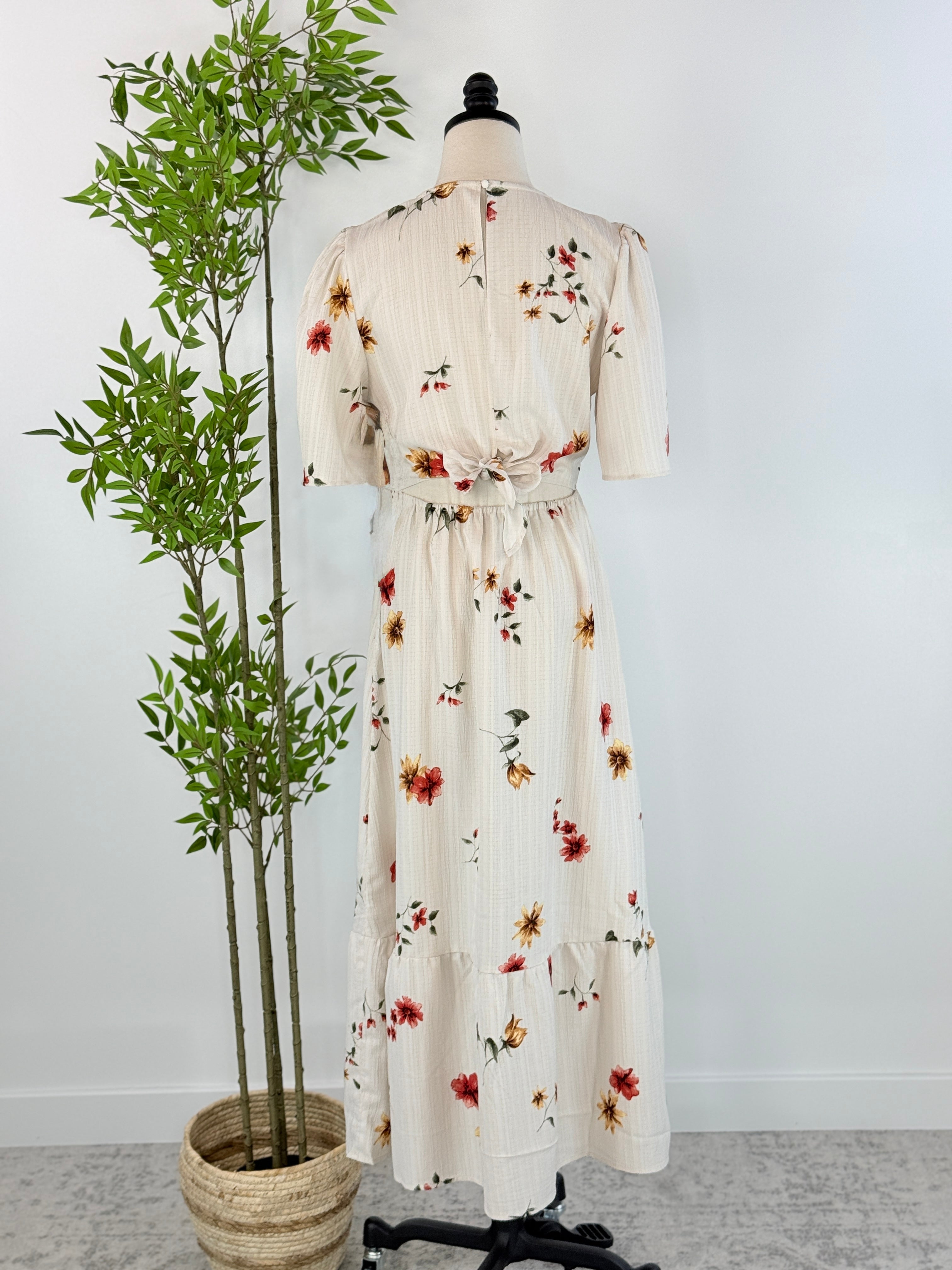 Feminine, flattering, and effortlessly graceful, the Jillian Floral Midi Dress is designed for moments that call for easy elegance. Crafted in a lightweight, textured fabric, this midi dress features a delicate floral print, a flattering V-neckline, and softly draped sleeves that add just the right amount of coverage. The gently defined waist creates a beautiful silhouette, while the flowing tiered skirt moves effortlessly with you. Finished with a subtle back tie for an adjustable fit and a peek-a-boo at the base of the back, this dress feels romantic without being fussy—perfect for everyday wear or dressed-up occasions.